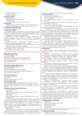 WWW.GHIDULPRIMARIILOR.RO JUDE%u021aUL BISTRI%u021aA-N%u0102S%u0102UD / 125Cooperativa Agricola grad ISC Valea Ilvei SRL SC Vasiliu EcaterinaObiective turistice:Muzeul SatuluiM%u0103n%u0103stirea %u201cSchimbarea la fa%u0163%u0103%u201dVia Transilvanica Izvoarele de ap%u0103 mineral%u0103 natural%u0103 (Borcut)Evenimente:T%u00e2rg de animale %u015fi pia%u0163%u0103 %u00een fiecare zi de luni din s%u0103pt%u0103m%u00e2n%u0103Festivalul Sambra oilor (%u00een cea de-a doua zi de Rusalii)Facilit%u00e3%u0163i oferite investitorilor:Reduceri cu 50% taxe localeProiecte de investi%u0163ii:Extinderea re%u0163elei de alimentare%u00a0 cu ap%u0103, canalizare %u015fi sta%u0163ie de epurare, modernizare drumuri, modernizare %u015fi dotare c%u0103min cultural %u00een localitatea Ilva Mare, jude%u0163ul Bistri%u0163a-N%u0103s%u0103ud - proiect %u00een curs de execu%u0163ie, realizat prin M%u0103sura 322Modernizare drumuri forestiere: Recele, Iv%u0103neasa-Ciuc, Iv%u0103leasa, Rogojoasa, P%u00e2r%u00e2ul Stanei %u015fi Cucureasa - Ramifica%u0163ie comunal%u0103 Ilva Mare - proiect %u00een curs de execu%u0163ie, realizat prin M%u0103sura 125Finisaje exterioare - termosistem, amenajare rigol%u0103 %u015fi %u00eemprejmuire la %u015fcoala general%u0103 Ilva Mare - realizatElectrificare Valea Strugarilor %u015fi Poiana C%u0103tunenilor, comuna Ilva Mare- Zona Valea Strugarilor - realizatRealizarea cadastrului pe teritoriul comunei Ilva Mare, jude%u0163ul Bistri%u0163a-N%u0103s%u0103ud - %u00een curs de execu%u0163ieReabilitare sediu prim%u0103rie - realizatCOMUNA ILVA MIC%u0102Adres%u0103: Principal%u0103, nr. 200Cod po%u0219tal: 427095Telefon: 0263-373554,-373683; Fax: 0263-373683; Adresa de e-mail: primaria_ilvamica@yahoo.comilva_mica@bn.e-adm.roURL: www.ilvamica.roCOMUNA JOSENII B%u00c2RG%u0102ULUIAdres%u0103: Principal%u0103, nr. 153Cod po%u0219tal: 427100Telefon: 0263-265360; Fax: 0263-265359; Adresa de e-mail: primaria.joseniibirgaului@yahoo.roURL: www.joseniibirgaului.roPersoane din primarie:Primar: Marius Vasile UrsViceprimar:Secretar General: Victor CuciureanContabil: Ileana IacobSate %u00een administra%u021bie:Josenii B%u00eerg%u0103ului, Mijlocenii B%u00eerg%u0103ului, Rusu B%u00eerg%u0103ului, Str%u00eembaSuprafa%u021ba:%u00a0 4879 ha; Intravilan:%u00a0 733,40 ha; Extravilan:%u00a0 4146, 1 ha; Popula%u021bia:%u00a0 5366; Gospod%u0103rii:%u00a0 2712; Locuin%u021be:%u00a0 1286; Gr%u0103dini%u021be:%u00a0 4; %u0218coli:%u00a04; Activitati economice si specifice zonei:Prelucrarea lemnuluiAgricultur%u0103Fabricarea de mobilier %u0219i infrastructura de servicii de turismPrelucrarea lemnuluiAgricultur%u0103Fabricarea de mobilier %u0219i infrastructura de servicii de turismProduse locale:Obiecte pe suport textil: %u021bes%u0103turi, covoare, costume populare, cus%u0103turi comuna Josenii B%u00e2rg%u0103ului, g%u0103sim %u0219i ast%u0103zi oameni care practic%u0103 vechile obiceiuri populare, acestea fiind: %u021besutul %u00een r%u0103zboi (covoare, p%u0103nz%u0103turi, %u021boale, p%u00e2nza de cas%u0103, draperii %u0219i carpete), cusutul manual - pe scrisoare (piepatul cusut pe scrisoare din bra%u0219on negru, curele cu m%u0103rgeaua, ales%u0103turi la p%u00e2nz%u0103turi, carpete, cingeau%u0103, draperii, tra%u0103istu%u021be)Me%u0219te%u0219ugari:Atelier de prelucrare a lemnului, metalelor, a pietrei, piel%u0103riei - prelucrarea lemnului o g%u0103sim %u00een comuna Josenii B%u00e2rg%u0103ului %u00een atelierele de prelucrare a cet%u0103%u021benilor: Flore Monda (sculptur%u0103 %u00een lemn) %u0219i Gheorghe Some%u0219an (sculptur%u0103 %u00een lemn) Pictur%u0103 pe sticl%u0103 %u0219i lemn, gravurapictur%u0103 de diverse materiale: Eugen PopObiective turistice:Monumente de arhitectur%u0103:Biserica Adormirii Maicii DomnuluiSit-uri arheologice%u00cen localitatea Rusu-B%u00e2rg%u0103ului avem urm%u0103toarele sit-uri arheologice:%u201c Cetatea pe dealul Conteni%u021ba%u201d din st%u00e2nga V%u0103ii Bistri%u021bei, a%u0219ezare din prima epoc%u0103 a fieruluiMonumente memorial-funerare%u201dCrucea de piatr%u0103%u201d din localitatea Rusu B%u00e2rg%u0103ului din anul 1798, care prezent se afl%u0103 la muzeu%u201dGaleria de art%u0103%u201d %u0219i sunt costume populare tradi%u021bionale vechi, lad%u0103 de zestre din anul 1882, colec%u021bie de ziar din anul 1900, bacnote %u0219i monede vechi din anul 1801-1812, lucruri biserice%u0219ti (haine ale preo%u021bilor, icoane, c%u0103delni%u021be, prapori, sfe%u0219nic etc), oale de lut, obiecte pictore%u0219ti, r%u0103zboi pentru %u021besuut, diferite obiecte din anii 1940-1950 (covoare, sucal%u0103, cingeau%u0103, p%u0103r%u0103t%u0103r)M%u0103n%u0103stirea Sf%u00e2ntu Spirion din localitatea Str%u00e2mbaLa Parohia Ortodox%u0103 Rom%u00e2n%u0103 - Adormirea Maicii Domnului din localitatea Mijlocenii B%u00e2rg%u0103uluiAmenajare loc de Picnic - Terenul se afl%u0103 amplasat %u00een regiunea de dezvoltare nord - vest Bistri%u021ba - N%u0103s%u0103ud, comuna Josenii B%u00e2rg%u0103ului, satul Rusu - B%u00e2rg%u0103ului.Acesta este dotat cu 19 foi%u0219oare de trei tipuri pentru a mul%u021bumi a%u0219tept%u0103rile fiec%u0103ruia.De asemenea exist%u0103 locuri de parcare amenajate, grupuri sanitare, locuri de joac%u0103 pentru copii %u0219i punct de prim ajutorEvenimente:Alaiul nun%u021bilor - osp%u0103%u021b, tocmal%u0103, pe%u021bit, dansuri populare - p%u0103strarea obiceiului %u0219i a nun%u021bii tradi%u021bionale - Comuna Josenii B%u00e2rg%u0103uluiS%u00e2ngeorzul - Omul de frunz%u0103 - Alung%u0103 r%u0103ul de la cas%u0103 prin focul care se face %u00een noaptea de S%u00e2ngeorz - Comuna Josenii B%u00e2rg%u0103uluiS%u00e2nzienele - Coroni%u021be aruncate pe acoperi%u0219ul caselor - Semnific%u0103 via%u021ba %u0219i moartea - Comuna Josenii B%u00e2rg%u0103uluiHora satului - Joc %u201dHor%u0103 %u021b%u0103r%u0103neasc%u0103, dansuri populare%u201d - P%u0103strarea obiceiurilor str%u0103vechi, a horei - Comuna Josenii B%u00e2rg%u0103uluiEvenimente %u021