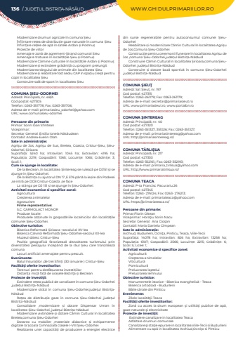 136 / JUDE%u021aUL BISTRI%u021aA-N%u0102S%u0102UD WWW.GHIDULPRIMARIILOR.ROModernizare drumuri agricole %u00een comuna %u0218ieu%u00cenfiin%u021bare re%u021bea de distribu%u021bie gaze naturale %u00een comuna %u0218ieu%u00cenfiin%u021bare re%u021bele de ap%u0103 %u00een satele Ardan %u0219i Posmu%u0219Proiecte de viitorAmenajare zon%u0103 de agrement-%u0218trand comunal %u0218ieuAmenajare trotuare %u00een localit%u0103%u021bile %u0218ieu %u0219i Posmu%u0219Modernizare C%u0103mine culturale %u00een localit%u0103%u021bile Ardan %u0219i Posmu%u0219Modernizare %u0219i extindere gr%u0103dini%u021b%u0103 cu program prelungitModernizarea t%u00e2rgului de animale din localitatea %u0218ieuModernizare %u0219i reabilitare fost sediu CAP %u00een spa%u021biu cre%u0219%u0103 pentru copii %u00een localitatea %u0218ieu Construire sal%u0103 de sport %u00een localitatea %u0218ieuCOMUNA %u015eIEU-ODORHEIAdres%u0103: Principal%u0103, nr. 48/ACod po%u0219tal: 427305Telefon: 0263-351778; Fax: 0263-351706; Adresa de e-mail: primariasieu_odorhei@yahoo.comURL: www.comunasieu-odorheiPersoane din primarie:Primar:%u00a0Sorin Ioan%u00a0Sfintean%u00a0Viceprimar:%u00a0Secretar General :Ersilia Ionela%u00a0N%u0103s%u0103udean%u00a0Contabil: Andrea-Evelin OlahSate %u00een administra%u021bie:Agri%u015fu de Jos, Agri%u015fu de Sus, Bretea, Coasta, Cristur-%u0218ieu, %u0218ieuOdorhei, %u0218irioaraSuprafa%u021ba:%u00a0 5240 ha; Intravilan:%u00a0 1045 ha; Extravilan:%u00a0 4195 ha; Popula%u021bia:%u00a0 2219; Gospod%u0103rii:%u00a0 1065; Locuin%u021be:%u00a0 1065; Gr%u0103dini%u021be:%u00a0 3; %u0218coli:%u00a01; Cum se ajunge in localitate:De la Beclean ,%u00een localitatea %u0218intereag se ruleaz%u0103 pe DJ151 %u0219i se ajunge in %u0218ieu-Odorhei.De la Bistri%u021ba cu ajutorul DN 17 ,E 576 p%u00e2n%u0103 la ie%u0219ire din Poderei ,se intr%u0103 pe DC8 Cristur-Coasta ,se faceLa st%u00e2nga pe DJ 151 %u0219i se ajunge %u00een %u0218ieu-Odorhei.Activitati economice si specifice zonei:Agricultur%u0103Cre%u0219terea animalelorAgroturismFirme reprezentative: S.C. CARMOLACT MONORProduse locale: Produsele ob%u021binute %u00een gospod%u0103riile localnicilor din localit%u0103%u021bile comunei %u0218ieu-Odorhei.Obiective turistice:Biserica Reformat%u0103 %u0218irioara %u2013secolul al XV-leaBiserica Calvin%u0103 Reformat%u0103 %u0218ieu-Odorhei-secolul XII-leaMuzeul s%u0103tesc Cristur-%u0218ieuPozi%u021bia geografic%u0103 favorizeaz%u0103 dezvoltarea turismului prin diversitatea peisajului %u00eencep%u00e2nd de la r%u00e2ul %u0218ieu care tranziteaz%u0103 comuna Lacuri artificial amenajate pentru pescuit.Evenimente:Balul %u00eensura%u021bilor ,de trei Sfin%u021bi (30 ianuarie ) Cristur-%u0218ieuFacilit%u00e3%u0163i oferite investitorilor:Terenuri pentru desf%u0103%u0219urarea investi%u021biilorDistan%u021ba mic%u0103 fa%u021b%u0103 de ora%u0219ele Bistri%u021ba %u0219i BecleanProiecte de investi%u0163ii:Extindere re%u021bea public%u0103 de canalizare %u00een comuna %u0218ieu-Odorhei ,jude%u021bul Bistri%u021ba-N%u0103s%u0103udModernizare str%u0103zi %u00een comuna %u0218ieu-Odorhei,jude%u021bul Bistri%u021baN%u0103s%u0103udRe%u021bea de distribu%u021bie gaze %u00een comuna %u0218ieu-Odorhei ,jude%u021bul Bistri%u021ba-N%u0103s%u0103udConsolidare ,modernizare %u0219i dotare Dispensar Uman %u00een localitatea %u0218ieu-Odorhei, jude%u021bul Bistri%u021ba-N%u0103s%u0103udModernizare ,extindere %u0219i dotare C%u0103min Cultural %u00een localitatea Bretea,comuna %u0218ieu-OdorheiDotarea cu mobilier ,materiale didactice %u0219i echipamente digitale la %u0218coala Gimnazial%u0103 clasele I-VIII %u0218ieu-OdorheiRealizarea unei capacit%u0103%u021bi de producere a energiei electrice din surse regenerabile pentru autoconsumul comunei %u0218ieuOdorheiReabilitare %u0219i modernizare C%u0103min Cultural %u00een localitatea Agri%u0219u de Jos,Comuna %u0218ieu-OdorheiConstruc%u021bie pentru ceremonii funerare %u00een localitatea Agri%u0219u de Jos ,comuna %u0218ieu-Odorhei,jude%u021bul Bistri%u021ba-N%u0103s%u0103udConstruire C%u0103min Cultural %u00een localitatea %u0218irioara,comuna %u0218ieuOdorhei ,jude%u021bul Bistri%u021ba-N%u0103s%u0103udConstruire %u0219i dotare baz%u0103 sportiv%u0103 %u00een comuna %u0218ieu-Odorhei ,jude%u021bul Bistri%u021ba-N%u0103s%u0103udCOMUNA %u015eIEU%u0162Adres%u0103: Sat %u0218ieu%u021b, nr. 197Cod po%u0219tal: 427315Telefon: 0263-261179; Fax: 0263-261179; Adresa de e-mail: secretar@primariasieut.roURL: www.primariasieut.ro, www.portalbn.roCOMUNA %u015eINTEREAGAdres%u0103: Principal%u0103, nr. 40Cod po%u0219tal: 427320Telefon: 0263-351327, 351026; Fax: 0263-351327; Adresa de e-mail: primariasintereag@yahoo.comURL: http://primariasintereag.ro/COMUNA T%u00c2RLI%u015eUAAdres%u0103: Principal%u0103, nr. 217Cod po%u0219tal: 427330Telefon: 0263-352161,; Fax: 0263-352193; Adresa de e-mail: primaria_tirlisua@yahoo.comURL: http://www.primariatirlisua.ro/COMUNA TEACAAdres%u0103: P-ta Francisc Pacurariu 26Cod po%u0219tal: 427345Telefon: 0263- 276124; Fax: 0263- 276213; Adresa de e-mail: primariateaca@yahoo.comURL: https://primariateaca.ro/Persoane din primarie:Primar:Florin OlteanViceprimar: Hora%u0163iu Sorin NacuSecretar General: %u00a0Ana Cio%u015fanContabil: Maria Daniela%u00a0C%u00eempean%u00a0Sate %u00een administra%u021bie:Archiud, Budurleni, Ocni%u0163a, Pinticu, Teaca, Viile-TeciiSuprafa%u021ba:%u00a0 14078 ha; Intravilan:%u00a0 826 ha; Extravilan:%u00a0 13258 ha; Popula%u021bia:%u00a0 6107; Gospod%u0103rii:%u00a0 2566; Locuin%u021be:%u00a0 2215; Gr%u0103dini%u021be:%u00a0 6; %u0218coli:%u00a05; Licee:%u00a01; Activitati economice si specifice zonei:Agricultur%u0103Cre%u015fterea animalelorViticultur%u0103Pomicultur%u0103Prelucrarea lapteluiPrelucrarea lemnului Obiective turistice:Monumentele istorice - Biserica evanghelic%u0103 - TeacaBiserica ortodox%u0103 - BudurleniB%u0103ile s%u0103rate din PinticuEvenimente:Zilele localit%u0103%u0163ii TeacaFacilit%u00e3%u0163i oferite investitorilor:Zon%u0103 cu a