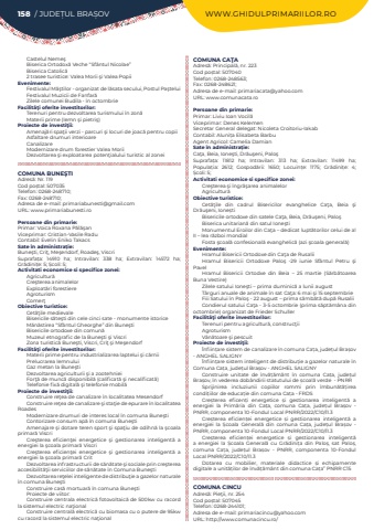 158 / JUDE%u021aUL BRA%u0218OV WWW.GHIDULPRIMARIILOR.ROCastelul Neme%u015fBiserica Ortodox%u0103 Veche %u201cSf%u00e2ntul Nicolae%u201dBiserica Catolic%u01032 trasee turistice: Valea Morii %u015fi Valea PopiiEvenimente:Festivalul M%u0103%u015ftilor - organizat de l%u0103sata secului, Postul Pa%u015fteluiFestivalul Muzicii de Fanfar%u0103Zilele comunei Budila - %u00een octombrieFacilit%u00e3%u0163i oferite investitorilor:Terenuri pentru dezvoltarea turismului %u00een zon%u0103Materii prime (lemn %u015fi pietri%u015f)Proiecte de investi%u0163ii:Amenaj%u0103ri spa%u0163ii verzi - parcuri %u015fi%u00a0locuri de joac%u0103 pentru copiiAsfaltare drumuri interioareCanalizareModernizare drum forestier Valea MoriiDezvoltarea %u015fi exploatarea poten%u0163ialului turistic al zoneiCOMUNA BUNE%u015eTIAdres%u0103: Nr. 119Cod po%u0219tal: 507035Telefon: 0268-248710; Fax: 0268-248710; Adresa de e-mail: primariabunesti@gmail.comURL: www.primariabunesti.roPersoane din primarie:Primar: Voica Roxana%u00a0P%u0103l%u0103%u015fan%u00a0Viceprimar: Cristian-Vasile RaduContabil: Evelin Eniko TakacsSate %u00een administra%u021bie:Bune%u015fti, Cri%u0163, Me%u015fendorf, Roade%u015f, ViscriSuprafa%u021ba:%u00a0 14910 ha; Intravilan:%u00a0 338 ha; Extravilan:%u00a0 14572 ha; Gr%u0103dini%u021be:%u00a05; %u0218coli:%u00a05; Activitati economice si specifice zonei:Agricultur%u0103Cre%u015fterea animalelorExploat%u0103ri forestiereAgroturismComer%u0163%u00a0Obiective turistice:Cet%u0103%u0163ile medievaleBisericile s%u0103te%u015fti din cele cinci sate - monumente istoriceM%u0103n%u0103stirea %u201cSf%u00e2ntul Gheorghe%u201d din Bune%u015ftiBisericile ortodoxe din comun%u0103Muzeul etnografic de la Bune%u015fti %u015fi ViscriZona turistic%u0103 Bune%u015fti, Viscri, Cri%u0163 %u015fi Me%u015fendorfFacilit%u00e3%u0163i oferite investitorilor:Materii prime pentru industrializarea laptelui %u015fi%u00a0c%u0103rniiPrelucrarea lemnuluiGaz metan la Bune%u015ftiDezvoltarea agriculturii %u015fi a zootehnieiFor%u0163%u0103 de munc%u0103 disponibil%u0103 (calificat%u0103 %u015fi necalificat%u0103)Telefonie fix%u0103 digital%u0103 %u015fi telefonie mobil%u0103Proiecte de investi%u0163ii:Construire re%u0163ea de canalizare %u00een localitatea MesendorfConstruire re%u0163ea de canalizare %u015fi sta%u0163ie de epurare %u00een localitatea RoadesModernizare drumuri de interes local %u00een comuna Bune%u015ftiContorizare consum ap%u0103 %u00een comuna Bune%u015ftiAmenajare %u015fi dotare teren sport %u015fi spa%u0163iu de odihn%u0103 la %u015fcoala primar%u0103 ViscriCre%u015fterea eficien%u0163ei energetice %u015fi gestionarea inteligent%u0103 a energiei la %u015fcoala primar%u0103 ViscriCre%u015fterea eficien%u0163ei energetice %u015fi gestionarea inteligent%u0103 a energiei la %u015fcoala primar%u0103 CritDezvoltarea infrastructurii de s%u0103n%u0103tate %u015fi sociale prin cre%u015fterea accesibilit%u0103%u0163ii serviciilor de s%u0103n%u0103tate %u00een Comuna Bune%u015ftiDezvoltarea re%u0163elei inteligente de distribu%u0163ie a gazelor naturale %u00een comuna Bune%u015ftiConstruire cas%u0103 mortuar%u0103 %u00een comuna Bune%u015fti Proiecte de viitor:Construire centrala electric%u0103 fotovoltaic%u0103 de 500kw cu racord la sistemul electric na%u0163ionalConstruire central%u0103 electric%u0103 cu biomasa cu o putere de 95kw cu racord la sistemul electric na%u0163ionalCOMUNA CA%u0162AAdres%u0103: Principal%u0103, nr. 223Cod po%u0219tal: 507040Telefon: 0268-248563; Fax: 0268-248621; Adresa de e-mail: primariacata@yahoo.comURL: www.comunacata.roPersoane din primarie:Primar:%u00a0Liviu Ioan%u00a0Vocil%u0103%u00a0Viceprimar: Denes%u00a0Kelemen%u00a0Secretar General delegat: Nicoleta Croitoriu-IakabContabil: Aluni%u021ba Elisabeta%u00a0BarbuAgent Agricol: Camelia DamianSate %u00een administra%u021bie:Ca%u0163a, Beia, Ione%u015fti, Dr%u0103u%u015feni, Palo%u015fSuprafa%u021ba:%u00a0 11812 ha; Intravilan:%u00a0 313 ha; Extravilan:%u00a0 11499 ha; Popula%u021bia:%u00a0 2612; Gospod%u0103rii:%u00a0 1650; Locuin%u021be:%u00a0 1175; Gr%u0103dini%u021be:%u00a0 4; %u0218coli:%u00a05; Activitati economice si specifice zonei:Cre%u015fterea %u015fi %u00eengr%u0103%u015farea animalelorAgricultur%u0103Obiective turistice:Cet%u0103%u0163ile din cadrul Bisericilor evanghelice Ca%u0163a, Beia %u015fi Dr%u0103u%u015feni, Ione%u0219tiBisericile ortodoxe din satele Ca%u0163a, Beia, Dr%u0103u%u015feni, Palo%u015fBiserica unitarian%u0103 din satul Ione%u015ftiMonumentul Eroilor din Ca%u0163a %u2013 dedicat%u00a0lupt%u0103torilor celui de al II %u2013 lea r%u0103zboi mondial Fosta %u015fcoal%u0103 confesional%u0103 evanghelic%u0103 (azi %u015fcoala general%u0103)Evenimente:Hramul Bisericii Ortodoxe din Ca%u0163a de RusaliiHramul Bisericii Ortodoxe Palo%u015f -29 iunie Sf%u00e2ntul Petru %u015fi PavelHramul Bisericii Ortodxe din Beia %u2013 25 martie (S%u0103rb%u0103toarea Buna Vestire)Zilele satului Ione%u015fti %u2013 prima duminic%u0103 a lunii augustT%u00e2rguri anuale de animale %u00een sat Ca%u0163a: 6 mai %u015fi 15 septembrieFiii Satului %u00een Palo%u015f - 22 august %u2013 prima s%u00e2mb%u0103t%u0103 dup%u0103 Rusalii Condierul satului Ca%u0163a - 3-5 octombrie (prima s%u0103pt%u0103m%u00e2na din octombrie) organizat de Frieder SchullerFacilit%u00e3%u0163i oferite investitorilor:Terenuri pentru agricultur%u0103, construc%u0163iiAgroturismV%u00e2n%u0103toare %u015fi pescuitProiecte de investi%u0163ii:%u00cenfiin%u021bare sistem de canalizare %u00een comuna Ca%u021ba, jude%u021bul Bra%u0219ov - ANGHEL SALIGNY%u00cenfiin%u021bare sistem inteligent de distribu%u021bie a gazelor naturale %u00een Comuna Ca%u021ba, jude%u021bul Bra%u0219ov - ANGHEL SALIGNYConstruire unitate de %u00eenv%u0103%u021b%u0103m%u00e2nt %u00een comuna Ca%u021ba, jude%u021bul Bra%u0219ov, %u00een vederea dob%u00e2ndirii statutului de %u0219coal%u0103 verde%u00a0 - PNRRSprijinirea incluziunii copiilor rommi prin %u00eembun%u0103t%u0103%u021birea condi%u021biilor de educa%u0