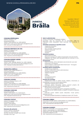 WWW.GHIDULPRIMARIILOR.RO 173Suprafa%u021b%u0103: 4.766 km%u00b2Popula%u021bie: 388.816 locuitoriRe%u0219edin%u021b%u0103 de jude%u021b: Br%u0103ilaPopula%u021bia re%u0219edin%u021bei de jude%u021b: 234.201 locuitoriJUDE%u021aULBr%u0103ilaCOMUNA B%u0102R%u0102GANULAdres%u0103: Victoriei, nr. 15Cod po%u0219tal: 817005Telefon: 0239-663009; Fax: 0239-663103; Adresa de e-mail: primariabaraganulbr@yahoo.comURL: www.primariabaraganul.roCOMUNA BERTE%u015eTII DE JOSAdres%u0103: Principal%u0103, nr. 27Cod po%u0219tal: 817010Telefon: 0239-699909; Fax: 0239-699855; Adresa de e-mail: bertestiidejos@br.e-adm.roURL: http://www.bertestiidejos.ro/COMUNA BORDEI VERDECod po%u0219tal: 817020Telefon: 0239- 696088, 696090; Fax: 0239- 696090; Adresa de e-mail: primaria.bordeiverde@yahoo.comURL: http://primariabordeiverde.ro/MUNICIPIUL BR%u0102ILAAdres%u0103: Pia%u0163a Independen%u0163ei, nr. 1Cod po%u0219tal: 810210Telefon: 0239-694947; Fax: 0239-692394; Adresa de e-mail: mb@pmbr.roURL: www.primariabraila.roCOMUNA CAZA%u015eUAdres%u0103: str.Rimnicu Sarat ,nr 211Cod po%u0219tal: 817180Telefon: 0239-695369; Fax: 0239-695369; Adresa de e-mail: primariacazasu@yahoo.comURL: https://www.cazasu.ro/COMUNA CHISCANICod po%u0219tal: 817025Telefon: 0239-664011; Fax: 0239-664011; Adresa de e-mail: primariachiscani@yahoo.comURL: http://primariachiscani.ro/COMUNA CIOCILEAdres%u0103: Principal%u0103, nr. 84Cod po%u0219tal: 817030Telefon: 0239-699210; Adresa de e-mail: primariaciocile@yahoo.comURL: https://comunaciocile.ro/Persoane din primarie:Primar: Valentin%u00a0Mangiurea%u00a0Viceprimar: Maria Meiro%u015fuSecretar General:%u00a0Giorgian Sorin%u00a0Istrate%u00a0Contabil: Gina Tu%u0163%u0103Sate %u00een administra%u021bie:Ciocile, Chichine%u0163u, Chioib%u0103%u015fe%u015fti, Od%u0103ieniSuprafa%u021ba:%u00a0 7714 ha; Intravilan:%u00a0 315 ha; Extravilan:%u00a0 7399 ha; Popula%u021bia:%u00a0 2780; Gospod%u0103rii:%u00a0 1002; Locuin%u021be:%u00a0 1161; Gr%u0103dini%u021be:%u00a0 2; %u0218coli:%u00a02; Activitati economice si specifice zonei:Cre%u015fterea animalelorCultura plantelorMici activit%u0103%u0163i me%u015fte%u015fug%u0103re%u015ftiAteliere mecaniceVulcanizareComer%u021bObiective turistice:Monumentul eroilorBisericile ortodoxe din satele componente comunei CiocileAd%u0103p%u0103tori din Piatr%u0103, vechi de peste 200 ani, %u00eenscrise %u00een L.M.I., monumentul eroilorEvenimente:Zilele localit%u0103%u0163ii, ultima s%u00e2mbat%u0103 %u0219i duminic%u0103 din luna Iulie%u00cent%u00e2lnirea cu Fiii SatuluiHramul bisericii %u201cAdormirea Maicii Domnului%u201d - 15 AugustBotezul Cailor (6 Ianuarie)Facilit%u00e3%u0163i oferite investitorilor:Colaborare %u015fi cooperareSprijin %u00een elaborarea actelor administrativeFor%u0163%u0103 de munc%u0103 t%u00e2n%u0103r%u0103Telefonie digital%u0103Cablu%u00a0InternetConcesionare terenFacilit%u0103%u0163i fiscaleProiecte de investi%u0163ii:Modernizare str%u0103zi %u00een satele Ciocile, Od%u0103ieni, Chichinetu %u0219i Chioib%u0103se%u0219ti, comuna Ciocile jude%u021bul Br%u0103ilaRepara%u021bie%u00a0capital%u0103%u00a0c%u0103min cultural%u00cenfiin%u021bare%u00a0 sistem fotovoltaic pentru consum propriu de energie electric%u0103 comuna Ciocile, jude%u021bul Br%u0103ilaEficientizare iluminat publicAchizi%u021bia unei autospeciale pentru stingerea incendiilorExecu%u021bie lucr%u0103ri cl%u0103dire %u0219coala cu clasele V-VIII pentru obtinere aviz ISUExecu%u021bie%u00a0 lucr%u0103ri cl%u0103dire %u0219coala Alexandru Turtoi pentru obtinere aviz ISU%u00cenfiin%u021bare perdele forestiere %u0219i %u00eemp%u0103durire teren UAT CiocileCOMUNA CIRE%u015eUCod po%u0219tal: 817035; Telefon: 0239-623749; Fax: 0239-638434; Adresa de e-mail: primariaciresu@yahoo.comURL: https://cjbraila.ro/dm/portal.nsf/COMUNA DUDE%u015eTIAdres%u0103: str. Primariei ,nr 6; Cod po%u0219tal: 817040Telefon: 0239-663415; Fax: 0239-663494; Adresa de e-mail: office@comunadudesti.rodudestibraila@yahoo.comURL: http://www.comunadudesti.ro/
