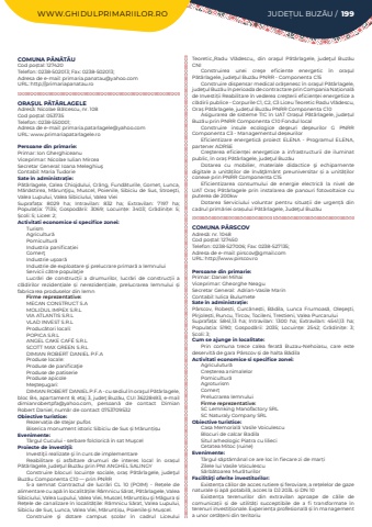 WWW.GHIDULPRIMARIILOR.RO JUDE%u021aUL BUZ%u0102U / 199COMUNA P%u0102N%u0102T%u0102UCod po%u0219tal: 127420Telefon: 0238-502013; Fax: 0238-502013; Adresa de e-mail: primaria.panatau@yahoo.comURL: http://primariapanatau.roORA%u0218UL P%u0102T%u00c2RLAGELEAdres%u0103: Nicolae B%u0103lcescu, nr. 108Cod po%u0219tal: 053735Telefon: 0238-550001; Adresa de e-mail: primaria.patarlagele@yahoo.comURL: www.primariapatarlagele.roPersoane din primarie:Primar: Ion%u00a0Gherghiceanu%u00a0Viceprimar: Nicolae Iulian%u00a0Mircea%u00a0Secretar General:%u00a0Ioana%u00a0Meleghiu%u015fContabil: Maria%u00a0TudorieSate %u00een administra%u021bie:P%u0103t%u00e2rlagele, Calea Chiojdului, Cr%u00e2ng, Fund%u0103turile, Gornet, Lunca, M%u0103n%u0103stirea, M%u0103run%u0163i%u015fu, Muscel, Poienile, Sibiciu de Sus, Stroe%u015fti, Valea Lupului, Valea Sibiciului, Valea VieiSuprafa%u021ba:%u00a0 8029 ha; Intravilan:%u00a0 832 ha; Extravilan:%u00a0 7197 ha; Popula%u021bia:%u00a0 7135; Gospod%u0103rii:%u00a0 3069; Locuin%u021be:%u00a0 3403; Gr%u0103dini%u021be:%u00a0 5; %u0218coli:%u00a05; Licee:%u00a02; Activitati economice si specifice zonei:TurismAgricultur%u0103Pomicultur%u0103Industria panifica%u021bieiComer%u0163Industrie u%u015foar%u0103Industrie de exploatare %u015fi prelucrare primar%u0103 a lemnului Servicii c%u0103tre popula%u0163ieLucr%u0103ri de construc%u021bii a drumurilor, lucr%u0103ri de construc%u021bii a cl%u0103dirilor reziden%u021biale %u0219i nereziden%u021biale, prelucrarea lemnului %u0219i fabricarea produselor din lemnFirme reprezentative:MECAN CONSTRUCT S.AMOLIDUL IMPEX S.R.LVIA ATLANTIS S.R.LVLAD INVEST S.R.LProduc%u0103tori locali:POPICA S.R.LANGEL CAKE CAF%u00c9 S.R.LSCOTT MAX GREEN S.R.LDIMIAN ROBERT DANIEL P.F.AProduse locale:Produse de panifica%u0163ieProduse de patiserieProduse apicoleMe%u015fte%u015fugari:DIMIAN ROBERT DANIEL P.F.A - cu sediul %u00een ora%u015ful P%u0103t%u00e2rlagele, bloc B4, apartament 8, etaj 3, jude%u0163 Buz%u0103u, CUI 36228493, e-mail dimianrobertpfa@yahoo.com, persoan%u0103 de contact Dimian Robert Daniel, num%u0103r de contact 0753709532Obiective turistice:Rezerva%u021bia de stejar pufos Biserica monument istoric Sibiciu de Sus %u0219i M%u0103run%u021bi%u0219uEvenimente:T%u00e2rgul Cucului - serbare folcloric%u0103 %u00een sat Mu%u015fcelProiecte de investi%u0163ii:Investi%u0163ii realizate %u015fi %u00een curs de implementareReabilitare %u0219i asfaltare drumuri de interes local %u00een ora%u0219ul P%u0103t%u00e2rlagele, jude%u0163ul Buz%u0103u prin PNI ANGHEL SALINGYConstruire blocuri locuin%u021be sociale, ora%u0219 P%u0103t%u00e2rlagele, jude%u0163ul Buz%u0103u Componenta C10 %u2014 prin PNRRS-a semnat Contractul de lucr%u0103ri CL 10 (POIM) - Re%u021bele de alimentare cu ap%u0103 %u00een localit%u0103%u021bile: R%u00e2mnicu S%u0103rat, P%u0103t%u00e2rlagele, Valea Sibiciului, Valea Lupului, Valea Viei, Muscel, M%u0103run%u021bi%u0219u %u015fi M%u0103gura %u0219i Re%u021bele de canalizare %u00een localit%u0103%u021bile: R%u00e2mnicu S%u0103rat, Valea Lupului, Sibiciu de Sus, Lunca, Valea Viei, M%u0103run%u021bi%u0219u, Poienile %u015fi Mu%u0219cel.Construire %u015fi dotare campus %u0219colar %u00een cadrul Liceului Teoretic,,Radu Vl%u0103descu,, din ora%u015ful P%u0103t%u00e2rlagele, jude%u0163ul Buz%u0103u CNIConstruirea unei cre%u015fe eficiente energetic %u00een ora%u015ful P%u0103t%u00e2rlagele, jude%u0163ul Buz%u0103u PNRR - Componenta C15Construire dispensar medical or%u0103%u015fenesc %u00een ora%u015ful P%u0103t%u00e2rlagele, jude%u0163ul Buz%u0103u %u00een perioada de contractare prin Compania Na%u021bional%u0103 de Investi%u021bii Reabilitare %u00een vederea cre%u015fterii eficien%u021bei energetice a cl%u0103dirii publice - Corpurile C1, C2, C3 Liceu Teoretic Radu Vl%u0103descu, Ora%u0219 P%u0103t%u00e2rlagele, jude%u021bul Buz%u0103u PNRR Componenta C10Asigurarea de sisteme TIC %u00een UAT Ora%u0219ul P%u0103t%u00e2rlagele, jude%u021bul Buz%u0103u prin PNRR Componenta C10 Fondul localConstruire insule ecologice de%u015feuri de%u015feurilor G PNRR Componenta C3 - Managementul de%u0219eurilorEficientizare energetic%u0103 proiect ELENA - Programul ELENA, partener ADRSECre%u015fterea eficien%u021bei energetice a infrastructurii de iluminat public, %u00een ora%u0219 P%u0103t%u00e2rlagele, jude%u0163ul Buz%u0103uDotarea cu mobilier, materiale didactice %u015fi echipamente digitale a unit%u0103%u021bilor de %u00eenv%u0103%u0163%u0103m%u00e2nt preuniversitar %u0219i a unit%u0103%u021bilor conexe prin PNRR Componenta C15Eficientizarea consumului de energie electric%u0103 la nivel de UAT Ora%u0219 P%u0103t%u00e2rlagele prin instalarea de panouri fotovoltaice cu puterea de 200kw Dotarea Serviciului voluntar pentru situa%u021bii de urgen%u021b%u0103 din cadrul prim%u0103riei ora%u0219ului P%u0103t%u00e2rlagele, Jude%u0163ul Buz%u0103uCOMUNA P%u00c2RSCOVAdres%u0103: nr. 1048Cod po%u0219tal: 127450Telefon: 0238-527006; Fax: 0238-527135; Adresa de e-mail: pirscov@gmail.comURL: http://www.pirscov.roPersoane din primarie:Primar: Daniel MihaiViceprimar: Gheorghe NeaguSecretar General: %u00a0Adrian-Vasile MarinContabil:%u00a0Iulica BulumeteSate %u00een administra%u021bie:P%u00e2rscov, Robe%u0219ti, Curc%u0103ne%u0219ti, B%u0103dila, Lunca Frumoas%u0103, Ole%u015fe%u015fti, P%u00eerjole%u0219ti, Runcu, T%u00eercov, Tocileni, Trestieni, Valea PurcaruluiSuprafa%u021ba:%u00a0 5841,13 ha; Intravilan:%u00a0 1300 ha; Extravilan:%u00a0 4541,13 ha; Popula%u021bia:%u00a0 5190; Gospod%u0103rii:%u00a0 2035; Locuin%u021be:%u00a0 2542; Gr%u0103dini%u021be:%u00a0 3; %u0218coli:%u00a03; Cum se ajunge in localitate:Prin comuna trece calea ferat%u0103%u00a0 Buzau-Nehoiasu, care este deservit%u0103%u00a0de gara P%u00e2rscov %u0219i de halta B%u0103dilaActivitati economice si specifice zonei:Agriculutur%u0103Cre%u0219terea animalelorPomicultur%u0103AgroturismComer%u021bPrelucrarea lemnuluiFirme reprezentative:SC Lemnking Manofactory SRL SC Naturaly Company SRLObiective turistice:Casa