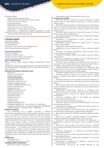 204 / JUDE%u021aUL BUZ%u0102U WWW.GHIDULPRIMARIILOR.ROENERGIE VERDE %u201cModernizarea pie%u021bei comunaleModernizarea %u0219i extinderea C%u0103minului Cultural%u00cenfiin%u021barea unei punct SVSUSus%u021binerea bisericiiReabilitarea Cimitirului EroilorConstruirea unui nou cimitir comunalDigitalizarea serviciilor oferite de prim%u0103rieAmenajarea %u0219i modernizarea sediului prim%u0103riei %u0219i curtea exterioara, inclusiv construirea unei hale de depozitare %u0219i arhivare Actualizare Plan Urbanistic GeneralCOMUNA SMEENICod po%u0219tal: 127595Telefon: 0238-732503; Fax: 0238-732549; Adresa de e-mail: primaria.smeeni@gmail.comURL: http://www.comunasmeeni.ro/Persoane din primarie:Primar: Ion%u00a0AndreiViceprimar: R%u0103zvan NiculaSecretar General: Anghel Luigi%u00a0%u00a0St%u0103nescu%u00a0Contabil: Irina Elena Corbea-Te%u015fcanSate %u00een administra%u021bie:B%u0103laia, Smeeni, Albe%u015fti, Moisica, C%u0103l%u0163una, Uda%u0163i-M%u00e2nzu, Uda%u0163iLucieniSuprafa%u021ba:%u00a010477, 08 ha; Intravilan:%u00a0683, 34 ha; Extravilan:%u00a09793, 74 ha; Popula%u021bia:%u00a06464; Gospod%u0103rii:%u00a02173; Locuin%u021be:%u00a02642; Gr%u0103dini%u021be:%u00a04; %u0218coli:%u00a08; Licee:%u00a01; Activitati economice si specifice zonei:Agricultur%u0103Comer%u0163 cu am%u0103nuntulCre%u015fterea animalelorFirme reprezentative:CEREANIM SMEENI S.AAGRICOLA CAMPICCO S.R.LGHIVECI FLORENTIN P.F.AFLORIN %u0218I ADRIAN AGRICOL S.R.LMARIN VALERIAN PFACARMEN TAS S.R.LMARTAC ETNO AGRO S.R.LPROFI ROM FOOD S.R.L MCA COMERCIAL S.R.LProduc%u0103tori locali: CARMEN TAS S.R.LProduse locale:Produse lactate Companii reprezentative: CEREANIM SMEENI S.A. - BUGA STELICA %u2013 0728034474GHIVECI FLORENTIN P.F.A - GHIVECI FLORENTIN %u2013 0762289327 CARMEN TAS S.R.L. - STERE CULUS - 0731648060Obiective turistice:Situl arheologic de la Albe%u0219ti cuprinde o a%u0219ezare apar%u021bin%u00e2nd%u00a0culturii Boian%u00a0din neoliticul mijlociu (mileniul al V-lea %u00ee.e.n.) %u0219i una dat%u00e2nd din epoca migra%u021biilor (cultura Cerneahov, secolul al IV-lea e.n.). Situl de la nord-vest de satul Moisica cuprinde dou%u0103 a%u0219ez%u0103ri similare %u0219i %u00een plus %u00eenc%u0103 una din perioada Halstatt (secolele al XII-lea%u2013al V-lea %u00ee.e.n.). Un alt sit aflat tot l%u00e2ng%u0103 Moisica, spre Albe%u0219ti, con%u021bine o a%u0219ezare medieval%u0103 timpurie atribuit%u0103%u00a0 culturii Dridu%u00a0 din secolele al IX-lea%u2013al X-lea. Situl de la Smeeni, aflat %u00een zona foste baze furajere %u0219i c%u0103tre S%u0103lcioara, con%u021bine dou%u0103 necropole%u00a0%u2014 una neolitic%u0103 din mileniile al VI-lea%u2013al V-lea %u0219i una din epoca migra%u021biilor (cultura Cerneahov). Situl din punctul %u201eLa Pascoli%u201d de la Uda%u021bi-Lucieni cuprinde o a%u0219ezare din epoca migra%u021biilor (cultura Cerneahov, secolele al III-lea%u2013al IV-lea) %u0219i una medieval%u0103 timpurie apar%u021bin%u00e2nd culturii Dridu (secolele al IX-lea%u2013al X-lea).Evenimente:T%u00e2rg s%u0103pt%u0103m%u00e2nalFlorile C%u0103lm%u0103%u0163uiului (luna iunie)Facilit%u00e3%u0163i oferite investitorilor:Reducerea taxelor %u0219i impozitelor Racordarea gratuit%u0103 la sistemele de ap%u0103 %u0219i canalProiecte de investi%u0163ii:%u00cenfiin%u021bare re%u021bea de canalizare %u0219i sta%u021bie de epurare %u00een satele Albe%u0219ti, Caltuna, Udati-Manzu, Udati-Lucieni, comuna Smeeni, jude%u021bul Buz%u0103u%u00cenfiin%u021bare re%u021bea de canalizare %u0219i sta%u021bie de epurare, extinderea %u0219i reabilitarea re%u021belei de alimentare cu ap%u0103, sta%u021bie de pompare, sta%u021bie tratare %u0219i rezervor de stocare %u00een comuna Smeeni, sat Smeeni, jude%u021bul Buz%u0103uExtindere re%u021bea canalizare %u0219i sta%u021bie de epurare %u00een comuna Smeeni, sat Smeeni, jude%u021bul Buz%u0103uExtindere canalizare %u00een comuna Smeeni, satele Balaia, Smeeni, Moisica, jude%u021bul Buz%u0103uExtinderea %u0219i modernizarea (inclusiv dotarea) Liceului Tehnologic Agricol SmeeniReabilitare drumuri publice de interes local %u00een comuna Smeeni, jude%u021bul%u00a0Buz%u0103uReactualizare Plan Urbanistic GeneralModernizare drumuri agricole %u00een comuna Smeeni, jude%u021bul Buz%u0103uExtindere %u0219i echipare ambulatoriu Spital de Boli Cronice Comuna Smeeni, jude%u021bul Buz%u0103uConstruire %u0219i dotare cre%u0219%u0103%u00a0 %u00een%u00a0 sat Smeeni, comuna Smeeni, jude%u021bul Buz%u0103uConstruire gr%u0103dini%u021b%u0103%u00a0 cu program normal 4 s%u0103li de grup%u0103%u00a0 %u00een comuna Smeeni, sat Smeeni,jude%u021bul Buz%u0103u%u00cenfiin%u021bare sistem inteligent de distribu%u021bie gaze naturale %u00een comunele Smeeni-satele apar%u021bin%u0103toare Smeeni %u0219i Uda%u021bi-M%u00e2nzu %u0219i Ghera%u0219eni %u2013 sat apar%u021bin%u0103tor Gher%u0103%u0219eni, Jude%u021bul Buz%u0103uExtindere/%u00eenfiin%u021bare sistem inteligent de distribu%u021bie gaze naturale %u00een comuna Smeeni- satele apar%u021bin%u0103toare : B%u0103laia, Moisica, Albe%u0219ti, C%u0103l%u021buna %u0219i Uda%u021bi Lucieni, jude%u021bul Buz%u0103uRenovare integrat%u0103 blocuri %u00een comuna Smeeni, jude%u021bul Buz%u0103u%u00a0Achizi%u021bie microbuz nepoluant %u00een comuna Smeeni, jude%u021bul Buz%u0103u + Realizare sta%u021bii pentru vehicule electrice %u00een comuna SmeeniReabilitare seismic%u0103%u00a0%u0219i %u00eembun%u0103t%u0103%u021birea eficien%u021bei energetice %u00een cadrul %u0218colii Gimnaziale din sat Smeeni, comuna Smeeni, jude%u021bul Buz%u0103uEficientizarea consumului de enrgie electric%u0103%u00a0la UAT comuna Smeeni, jude%u021bul Buz%u0103u prin instalarea de panouri fotovoltaice %u0219i pompe de c%u0103ldur%u0103Reabilitarea, modernizarea, dotarea %u0219i extinderea unui dispensar medical %u00een sat Smeeni, comuna Smeeni, jude%u021bul Buz%u0103uConstruire C%u0103min Cultural sat Albe%u0219ti, comuna Smeeni, jude%u021bul Buz%u0103uConstruire dispensar uman %u00een sat Albe%u0219t