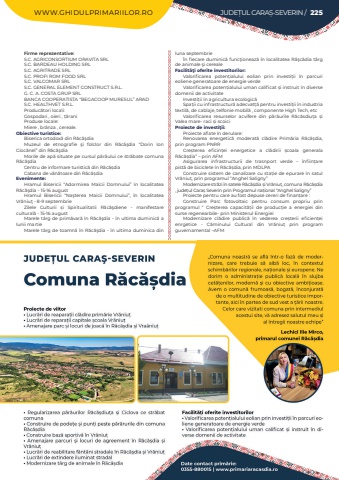 WWW.GHIDULPRIMARIILOR.RO JUDE%u021aUL CARA%u0218-SEVERIN / 225Firme reprezentative:S.C. AGRICONSORTIUM ORAVITA SRLS.C. BARDEAU HOLDING SRL S.C. AGRITRADE SRLS.C. PROFI ROM FOOD SRLS.C. VALCOMAR SRLS.C. GENERAL ELEMENT CONSTRUCT S.R.L.G. C. A. COSTA GRUP SRLBANCA COOPERATISTA %u201cBEGACOOP MURESUL%u201d ARADS.C. HEALTHVET S.R.L.Produc%u0103tori locali:Gospodari , oieri , %u021b%u0103raniProduse locale: Miere , br%u00e2nza , cereale. Obiective turistice:Biserica ortodox%u0103 din R%u0103c%u0103%u015fdiaMuzeul de etnografie %u015fi folclor din R%u0103c%u0103%u015fdia %u201cDorin Ion Cioc%u0103nel%u201d din R%u0103c%u0103%u015fdiaMorile de ap%u0103 situate pe cursul p%u00e2r%u00e2ului ce str%u0103bate comuna R%u0103c%u0103%u015fdiaCentru de informare turistic%u0103 din R%u0103c%u0103%u0219diaCabana de v%u00e2n%u0103toare din R%u0103c%u0103%u0219diaEvenimente:Hramul Bisericii %u201cAdormirea Maicii Domnului%u201d %u00een localitatea R%u0103c%u0103%u015fdia - 15-16 augustHramul Bisericii %u201cNa%u015fterea Maicii Domnului%u201d,%u00a0 %u00een localitatea Vr%u0103niu%u0163 - 8-9 septembrieZilele Culturii %u0219i Spiritualitatii R%u0103c%u0103%u015fdiene - manifestare cultural%u0103 - 15-16 augustMarele t%u00e2rg de prim%u0103var%u0103 %u00een R%u0103c%u0103%u015fdia - %u00een ultima duminic%u0103 a lunii martieMarele t%u00e2rg de toamn%u0103 %u00een R%u0103c%u0103%u015fdia - %u00een ultima duminica din luna septembrie %u00cen fiecare duminic%u0103 func%u0163ioneaz%u0103 %u00een localitatea R%u0103%u015fc%u0103dia t%u00e2rg de animale %u015fi cerealeFacilit%u00e3%u0163i oferite investitorilor:Valorificarea poten%u021bialului eolian prin investi%u021bii %u00een parcuri eoliene generatoare de energie verdeValorificarea poten%u021bialului uman calificat %u0219i instruit %u00een diverse domenii de activitateInvesti%u021bii %u00een agricultura ecologic%u0103Spa%u021bii cu infrastructur%u0103%u00a0adecvat%u021b%u0103%u00a0pentru investi%u021bii %u00een industria textil%u0103, de cablaje, telfonie mobil%u0103%u00a0, componente High Tech, etcValorificarea resurselor acvifere din p%u00e2r%u00e2urile R%u0103c%u0103sdiu%u021ba %u0219i Valea mare- raci %u0219i scoiciProiecte de investi%u0163ii:Proiecte aflate %u00een derulare:Renovarea energetic%u0103%u00a0 moderat%u0103%u00a0 cl%u0103dire Prim%u0103ria R%u0103c%u0103%u0219dia, prin program PNRRCre%u0219terea eficin%u021bei energetice a cl%u0103dirii %u0219coala generala R%u0103c%u0103%u0219dia%u201d %u2013 prin AFMAsigurarea infrastructurii de trasnport verde %u2013 %u00eenfiin%u021bare pist%u0103%u00a0de biciclete %u00een R%u0103c%u0103%u0219dia, prin MDLPAConstruire sistem de canalizare cu sta%u021bie de epurare %u00een satul Vr%u0103niu%u021b,%u00a0prin programul %u201cAnghel Saligny%u201dModernizare str%u0103zi %u00een satele R%u0103c%u0103%u0219dia %u0219i Vr%u0103niu%u021b, comuna R%u0103c%u0103%u0219dia , jude%u021bul Cara%u0219%u00a0Severin prin Programul na%u021bional %u201cAnghel Saligny%u201dProiecte pentru care au fost depuse cereri de finan%u021bare :Construire Parc fotovoltaic pentru consum propriu prin programul %u201c Cre%u0219terea capacit%u0103%u021bii de produc%u021bie a energiei din surse regenearbile- prin Ministerul EnergieiModernizare cl%u0103dire public%u0103%u00a0 %u00een vederea cre%u0219terii eficien%u021bei enrgetice - C%u0103minului Cultural din Vr%u0103niu%u021b prin program guvernamental %u2013AFM