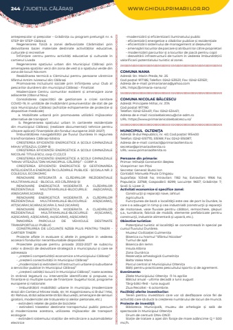 244 / JUDE%u021aUL C%u0102L%u0102RA%u0218I WWW.GHIDULPRIMARIILOR.ROantepre%u0219colar %u0219i pre%u0219colar %u2013 Gr%u0103dini%u021ba cu program prelungit nr. 4 STEP BY STEP C%u0103l%u0103ra%u0219iRegenerarea fizic%u0103 a zonei defavorizate C%u0103r%u0103midari prin dezvoltarea bazei materiale destinate activit%u0103%u021bilor educative, culturale %u0219i recreative%u00cenfiin%u021bare centru pentru activit%u0103%u021bi educative %u0219i culturale %u00een cartierul LivadaRegenerarea spa%u021biului urban din Municipiul C%u0103l%u0103ra%u0219i prin amenajarea spa%u021biilor verzi din zona de vest %u0219i a spa%u021biului verde din zona de locuit NavromReabilitarea termic%u0103 a C%u0103minului pentru persoane v%u00e2rstnice Sf%u00e2ntul Antim Ivireanul din C%u0103l%u0103ra%u0219iPromovarea incluziunii sociale prin %u00eenfiin%u021barea unui Club al pescarilor dun%u0103reni din municipiul C%u0103l%u0103ra%u0219i - FinalizatModernizare Centru comunitar existent %u0219i amenajare zone adiacente (Oborul Nou)Consolidarea capacit%u0103%u021bii de gestionare a crizei sanitare COVID-19, %u00een unit%u0103%u021bile de %u00eenv%u0103%u021b%u0103m%u00e2nt preuniversitar de stat de pe raza Municipiului C%u0103l%u0103ra%u0219i (achizi%u021bie echipamente de protec%u021bie %u0219i dispozitive medicale)a. Mobilitate urban%u0103 prin promovarea utiliz%u0103rii mijloacelor alternative de transportb. Regenerarea spa%u021biului urban %u00een cartierele reziden%u021biale din municipiul C%u0103l%u0103ra%u0219i; (realizare documenta%u021bii tehnice pentru viitoare aplica%u021bii finan%u021babile din fonduri europene 2021-2027)%u00cembun%u0103t%u0103%u021birea navigabilit%u0103%u021bii pe fluviul Dun%u0103rea %u00een regiunea transfrontaliera C%u0103l%u0103ra%u0219i-SilistraCRE%u0218TEREA EFICIEN%u021aEI ENERGETICE A %u0218COLII GIMNAZIALE MIHAI VITEAZUL CORP BCRE%u0218TEREA EFICIEN%u021aEI ENERGETICE A %u0218COLII GIMNAZIALE NICOLAE TITULESCU, corp C1,C2,C3CRE%u0218TEREA EFICIEN%u021aEI ENERGETICE A %u0218COLII GIMNAZIALE %u201dMIHAI VITEAZUL%u201dDIN MUNICIPIUL C%u0102L%u0102R%u0218I%u201d - CORP ACRE%u0218TEREA EFICIEN%u021aEI ENERGETICE %u0218I GESTIONAREA INTELIGENT%u0102%u00a0A ENERGIEI %u00ceN CL%u0102DIRILE PUBLICE - %u0218COALA NR. 2 COLEGIUL ECONOMICRENOVARE INTEGRAT%u0102 A CL%u0102DIRILOR REZIDEN%u021aIALE MULTIFAMILIALE - BLOCUL A13 C%u0102L%u0102RA%u0218I %u0218IRENOVARE ENERGETIC%u0102%u00a0 MODERAT%u0102%u00a0 A CL%u0102DIRILOR REZIDEN%u021aIALE MULTIFAMILIALE-BLOCURILE: A6(SCARA2), A18(SCARA1,SCARA2)RENOVARE ENERGETIC%u0102%u00a0 MODERAT%u0102%u00a0 A CL%u0102DIRILOR REZIDEN%u021aIALE MULTIFAMILIALE-BLOCURILE: A15(SCARA1), A17(SCARA1,SCARA2,SCARA 3, N43 (SCARA1)RENOVARE ENERGETICA MODERATA A CLADIRILOR REZIDENTIALE MULTIFAMILIALE-BLOCURILE: A1(SCARA1), A2(SCARA1), A3(SCARA1), A4(SCARA1), A5(SCARA1)%u00ceNNOIREA PARCULUI DE VEHICULE DESTINATE TRANSPORTULUI PUBLICCONSTRUIREA DE LOCUIN%u021aE NZEB PLUS PENTRU TINERI - CARTIER TINERIProiecte aflate in evaluare si altele in pregatire in vederea accesarii fondurilor nerambursabile disponibile:Proiectele propuse pentru prioada 2022-2027 se subscriu celor 4 direc%u021bii de dezvoltare strategic%u0103 a municipiului %u0219i care se adreseaza-%u00a0%u201ecre%u0219terii competivit%u0103%u021bii economice a Municipiului C%u0103l%u0103ra%u0219i%u201d-%u00a0%u201ecre%u0219terii conectivit%u0103%u021bii %u00een Municipiul C%u0103l%u0103ra%u0219i%u201d-%u00a0%u201emodernizarii %u0219i extinderii infrastructurii urbane %u0219i suburbane a serviciilor publice %u00een Municipiul C%u0103l%u0103ra%u0219i%u201d-%u00a0%u201ecre%u0219terii calit%u0103%u021bii locuirii %u00een Municipiul C%u0103l%u0103ra%u0219i%u201d, toate acestea %u00een str%u00e2ns%u0103%u00a0 legatur%u0103%u00a0 cu interven%u021biile identificate %u0219i propuse, cu finan%u021bare %u0219i multiple surse de finan%u021bare: bugetul local, programe europene %u0219i na%u021bionale:- %u00eembun%u0103t%u0103%u021birii mobilit%u0103%u021bii urbane %u00een municipiu (modernizare strazi din Cartierul Mircea Voda, str. M. Kogalniceanu si B-dul 1 Mai, str Rahova, str%u0103zi adiacente str%u0103zii Bucure%u0219ti, amenajare de sensuri giratorii, moderniz%u0103ri ale trotuarelor %u0219i aleilor pietonale, etc.)-%u00a0extinderii re%u021belei de piste de biciclete-%u00a0 extinderii traseelor destinate transportului public precum %u0219i modernizarea acestora, utilizarea mijloacelor de transport ecologice-%u00a0extinderii sistemului sta%u021biilor de re%u00eenc%u0103rcare a automobilelor electrice-moderniz%u0103rii %u0219i eficientizarii iluminatului public-%u00a0eficientiz%u0103rii energetice a cl%u0103dirilor publice %u0219i reziden%u021biale-%u00a0eficientiz%u0103rii sistemului de management al de%u0219eurilor-%u00a0amenaj%u0103rii locurilor de parcare %u0219i atribuirii lor c%u0103tre proprietari-%u00a0moderniz%u0103rii parcurilor %u0219i a locurilor de joac%u0103%u00a0pentru copii-%u00a0dezvolt%u0103rii infrastructurii de turism %u00een vederea %u00eembun%u0103t%u0103%u021birii valorificarii potentialului turistic al zonei.COMUNA NANAAdres%u0103: Str. Marin Preda, Nr. 25Cod po%u0219tal: 917185; Telefon: 0242-531531; Fax: 0242-531531; Adresa de e-mail: primarianana@yahoo.comURL: https://primaria-nana.ro/COMUNA NICOLAE B%u0102LCESCUAdres%u0103: Principele Mihai, nr. 37ACod po%u0219tal: 917190Telefon: 0242-534411; Fax: 0242-534411; Adresa de e-mail: nicolaebalcescu@cl.e-adm.roURL: https://www.primarianicolaebalcescu.ro/MUNICIPIUL OLTENI%u0162AAdres%u0103: B-dul Republicii, nr. 40; Cod po%u0219tal: 915400Telefon: 0242-515770, 515169; Fax: 0242-515087; Adresa de e-mail: contact@primariaoltenita.rosecretar@primariaoltenita.roURL: www.primariaoltenita.roPersoane din primarie:Primar: Mihai%u021b%u0103%u00a0Constantin Be%u015fteaViceprimar: Ion Pi%u021boi%u00a0Secretar General: Butoi IonContabil: Manuela Paula Cr%u00eenga%u0219uSuprafa%u021ba:%u00a0 10348 ha; Intravilan:%u00a0 1182 ha; Extravilan:%u00a0 9166 ha; Pop