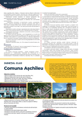 252 / JUDE%u021aUL CLUJ WWW.GHIDULPRIMARIILOR.ROMare, A%u0219chileu Mic, Fodora , Cristorel %u0219i Dorna. Biserici reformate %u00een localit%u0103%u021bile Cristorel, Fodora , A%u0219chileu Mic. Casa de rug%u0103ciune %u00een localita%u021bile Fodora %u0219i Cristorel. Schit ortodox %u00een localitatea FodoraPoten%u021bialul turistic existent %u00een arealul geografic din administra%u021bia comunei relativ modest este reprezentat de-%u00a0 Poten%u021bialul turistic peisagistic al reliefului din vecinatatea satului Dorna-%u00a0 Poten%u021bialul climateric %u0219i bioclimatic turistic caracteristic zonelor colinare amplasate la altitudini cuprinse %u00eentre 300 %u0219i 700 metrii. Aceasta ofera indici climatici favorabili practic%u0103rii de activit%u0103%u021bi turistice %u00een aer liber, mai ales practicarea aeroterapiei %u0219i helioterapieiPoten%u021bialul turistic antropic reprezentat de cele dou%u0103%u00a0biserici de lemn, monumente istorice %u0219i prin m%u0103n%u0103stirea de la CristorelAmenajarea teritoriului, urbanism %u0219i locuin%u021be , servicii publice de gospod%u0103rire comunal%u0103La nivelul comunei A%u0219chileu , sunt %u00eenregistrate un num%u0103r de 905 locuin%u021be. Dintre aceste locuibile sunt 750, iar restul sunt unele p%u0103r%u0103site, nelocuibile iar o parte temporar, la sf%u0103r%u0219itul s%u0103pt%u0103m%u00e2nii sau %u00een vacan%u021be %u0219i concediu, ace%u0219tia av%u00e2nd locuin%u021ba la Cuj-NapocaLa nivelul comunei nu avem servicii de gospod%u0103rire comunal%u0103Relnex spa &Cabin Caban%u0103 %u00een A%u0219chileu Mare , Nr. 27 %u0219i caban%u0103 Turistic%u0103 Fodora, Nr. 151Evenimente:S%u0103rb%u0103toarea %u201dFii Satului%u201d care se organizeaz%u0103 %u00een fiecare an, %u00een ultima s%u00e2mb%u0103t%u0103 %u0219i duminic%u0103 a lunii AugustFacilit%u00e3%u0163i oferite investitorilor:Comer%u021bLa nivelul comunei A%u0219chileu , exist%u0103%u00a0 magazine mixte , alimentare %u0219i 1 nealimentar, materiale de construc%u021bii %u0219i 2 magazine mixte apartin%u00e2nd Cooperatiei de Consum A%u0219chileu care func%u021bioneaz%u0103%u00a0 %u00een localitatea Cristorel %u0219i A%u0219chileu Mic, %u00een celelalte localit%u0103%u021bi fiind desfin%u021bateStarea de s%u0103n%u0103tate %u0219i educa%u021bie a popula%u021bieiLa nivelul comunei A%u0219chileu , exist%u0103%u00a0un Dispensar Uman %u00een care func%u021bioneaz%u0103%u00a0un medic de familie. Exist%u0103%u00a0un cabinet stomatologic dar de aproximatiov 3 ani nu mai func%u021bioneaz%u0103%u00a0. Exist%u0103%u00a01 farmacie la nivelul comunei care func%u021bioneaza de 2 ori pe s%u0103pt%u0103m%u00e2na , suficient pentru asigurarea cu medicamente a popula%u021biei. Nu sunt spitale, ambulan%u021ba apar%u021bin%u00e2nd de Municipiul Cluj- NapocaEducatieLa nivelul Comunei A%u0219chileu exist%u0103%u00a0 1 %u0218coal%u0103%u00a0 cu clasele I-VIII. Gr%u0103dini%u021ba %u00een localita%u021bile Cristorel, construc%u021bie nou%u0103%u00a0 terminat%u0103%u00a0 %u00een anul 2016, %u0219i %u00een localitatea A%u0219chileu Mic. Transportul elevilor se face cu cele dou%u0103%u00a0 microbuse %u0219colare care asigur%u0103%u00a0 transportul elevilor din toate localit%u0103%u021bile comunei . Num%u0103rul elevilor este de 160, acesta fiind %u00een sc%u0103dere. Aproximativ toate cadrele didactice vin de la Cluj- Napoca, doar dou%u0103%u00a0locuiesc %u00een comuna A%u0219chileu . %u0218coala Gimnazial%u0103, are condi%u021bii bune , a fost reabilitat%u0103%u00a0, singura problema fiind autorizarea acesteia, din lipsa apei potabile%u00a0. Din acest punct de vedere s-au luat masuri pentru Construirea unei sta%u021bii de potabilizare a apei. %u0218colile sunt %u00eengr%u0103dite de jur %u00eemprejur iar paza%u00a0este asigurat%u0103%u00a0de firma specializat%u0103CulturaLa nivelul comunei A%u0219chileu exist%u0103%u00a0 c%u0103mine culturale %u00een localitatea A%u0219chileu Mic, reabilitat %u00een anul 2018. Exist%u0103%u00a0 o sal%u0103%u00a0 de festivit%u0103%u021bi %u00een localitatea A%u0219chileu Mare urm%u00e2nd s%u0103%u00a0fie construit un C%u0103min cultural, 1 bibliotec%u0103%u00a0Comunal%u0103%u00a0%u0219i 1 %u0219colaraActivitatea %u00een domeniul tineretului %u0219i sportuluiLa nivelul comunei exist%u0103%u00a0 1 singur teren de sport, la %u0218coala Gimnazial%u0103%u00a0 , teren care urmeaza s%u0103%u00a0 fie construit , teren sintetic pentru sport, construit din fonduri europene prin Gall Polorissum. Exist%u0103%u00a0un teren %u00een localitatea Fodora care urmeaz%u0103%u00a0sa fie reabilitat pentru teren de sport, fotbal pentru tineretCombaterea s%u0103r%u0103ciei %u0219i %u0219omajului