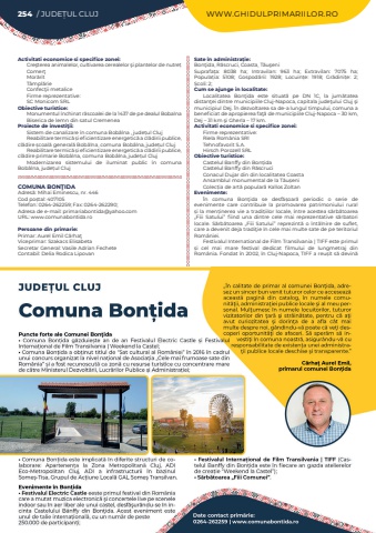 254 / JUDE%u021aUL CLUJ WWW.GHIDULPRIMARIILOR.ROActivitati economice si specifice zonei:Cre%u015fterea animalelor, cultivarea cerealelor %u015fi plantelor de nutre%u021bComer%u0163Mor%u0103ritT%u00e2mpl%u0103rieConfec%u0163ii metaliceFirme reprezentative: SC Monicom SRLObiective turistice:Monumentul %u00eenchinat r%u0103scoalei de la 1437 de pe dealul BobalnaBiserica de lemn din satul CremeneaProiecte de investi%u0163ii:Sistem de canalizare %u00een comuna Bob%u00e2lna , jude%u021bul ClujReabilitare termic%u0103%u00a0%u0219i eficientizare energetic%u0103%u00a0a cl%u0103dirii publice, cl%u0103dire %u0219coal%u0103 general%u0103 Bob%u00e2lna, comuna Bob%u00e2lna, jude%u021bul ClujReabilitare termic%u0103 %u0219i eficientizare energetic%u0103%u00a0a cl%u0103dirii publice, cl%u0103dire primarie Bob%u00e2lna, comuna Bob%u00e2lna, jude%u021bul ClujModernizarea sistemului de iluminat public %u00een comuna Bob%u00e2lna, jude%u021bul ClujCOMUNA BON%u0162IDAAdres%u0103: Mihai Eminescu, nr. 446Cod po%u0219tal: 407105Telefon: 0264-262259; Fax: 0264-262290; Adresa de e-mail: primariabontida@yahoo.comURL: www.comunabontida.roPersoane din primarie:Primar: Aurel Emil C%u0103rha%u0163Viceprimar: Szakacs ElisabetaSecretar General: Vasile Adrian FecheteContabil: Delia Rodica LipovanSate %u00een administra%u021bie:Bon%u0163ida, R%u0103scruci, Coasta, T%u0103u%u015feniSuprafa%u021ba:%u00a0 8038 ha; Intravilan:%u00a0 963 ha; Extravilan:%u00a0 7075 ha; Popula%u021bia:%u00a0 5108; Gospod%u0103rii:%u00a0 1928; Locuin%u021be:%u00a0 1918; Gr%u0103dini%u021be:%u00a0 2; %u0218coli:%u00a02; Cum se ajunge in localitate:Localitatea Bon%u0163ida este situat%u0103 pe DN 1C, la jum%u0103tatea distan%u0163ei dintre municipiile Cluj-Napoca, capitala jude%u0163ului Cluj %u015fi municipiul Dej. %u00cen dezvoltarea sa de-a lungul timpului, comuna a beneficiat de apropierea fa%u0163%u0103 de municipiile Cluj-Napoca %u2013 30 km, Dej %u2013 31 km %u015fi Gherla %u2013 17 km.Activitati economice si specifice zonei:Firme reprezentative: Riela Rom%u00e2nia SRlTehnofavorit S.A.Hirsch Porozell SRLObiective turistice:Castelul Banffy din Bon%u021bidaCastelul Banffy din R%u0103scruciConacul Dujar din din localitatea CoastaAnsamblul monumental de la T%u0103u%u0219eniColec%u021bia de art%u0103 popular%u0103 Kallos ZoltanEvenimente:%u00cen comuna Bon%u0163ida se desf%u0103%u0219oar%u0103 periodic o serie de evenimente care contribuie la promovarea patrimoniului rural %u0219i la men%u021binerea vie a tradi%u021biilor locale, %u00eentre acestea s%u0103rb%u0103toarea %u201eFiii Satului%u201d fiind una dintre cele mai reprezentative s%u0103rbatori locale. S%u0103rb%u0103toarea %u201eFiii Satului%u201d reprezint%u0103 o %u00eent%u00e2lnire de suflet, care a devenit deja tradi%u0163ie %u00een cele mai multe sate de pe teritoriul Rom%u00e2niei.Festivalul International de Film Transilvania | TIFF este primul %u0219i cel mai mare festival dedicat filmului de lungmetraj din Rom%u00e2nia. Fondat %u00een 2002, %u00een Cluj-Napoca, TIFF a reu%u0219it s%u0103 devin%u0103