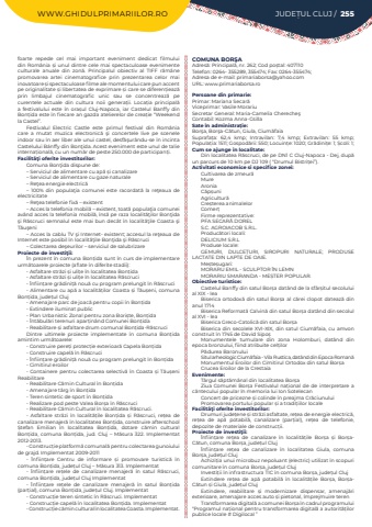 WWW.GHIDULPRIMARIILOR.RO JUDE%u021aUL CLUJ / 255foarte repede cel mai important eveniment dedicat filmului din Rom%u00e2nia %u0219i unul dintre cele mai spectaculoase evenimente culturale anuale din zon%u0103. Principalul obiectiv al TIFF r%u0103m%u00e2ne promovarea artei cinematografice prin prezentarea celor mai inovatoare %u0219i spectaculoase filme ale momentului care pun accent pe originalitate %u0219i libertatea de exprimare %u0219i care se diferen%u021bieaz%u0103 prin limbajul cinematografic unic sau se concentreaz%u0103 pe curentele actuale din cultura noii genera%u021bii. Loca%u021bia principal%u0103 a festivalului este %u00een ora%u0219ul Cluj-Napoca, iar Castelul Banffy din Bon%u021bida este %u00een fiecare an gazda atelierelor de crea%u021bie %u201cWeekend la Castel%u201d.Festivalul Electric Castle este primul festival din Rom%u00e2nia care a mutat muzica electronic%u0103 %u015fi concertele live pe scenele indoor sau %u00een aer liber ale unui castel, desf%u0103%u015fur%u00e2ndu-se %u00een incinta Castelului B%u00e1nffy din Bon%u0163ida. Acest eveniment este unul de talie interna%u021bional%u0103, cu un num%u0103r de peste 250.000 de participan%u021bi.Facilit%u00e3%u0163i oferite investitorilor:Comuna Bon%u0163ida dispune de:%u2013 Serviciul de alimentare cu ap%u0103 %u0219i canalizare%u2013 Serviciul de alimentare cu gaze naturale%u2013 Re%u0163ea energie electric%u0103%u2013 100% din popula%u0163ia comunei este racordat%u0103 la re%u0163eaua de electricitate%u2013 Re%u0163ea telefonie fix%u0103 %u2013 existent%u2013 Acces la telefonia mobil%u0103 %u2013 existent, toat%u0103 popula%u0163ia comunei av%u00e2nd acces la telefonia mobil%u0103, %u00eens%u0103 pe raza localit%u0103%u0163ilor Bon%u0163ida %u015fi R%u0103scruci semnalul este mai bun dec%u00e2t %u00een localit%u0103%u0163ile Coasta %u015fi T%u0103u%u015feni%u2013 Acces la cablu TV %u015fi Internet- existent; accesul la re%u0163eaua de Internet este posibil %u00een localit%u0103%u0163ile Bon%u0163ida %u015fi R%u0103scruci %u2013 Colectarea de%u015feurilor %u2013 serviciul de salubrizareProiecte de investi%u0163ii:%u00cen prezent %u00een comuna Bon%u021bida sunt %u00een curs de implementare urm%u0103toarele proiecte (aflate %u00een diferite stadii):-%u00a0Asfaltare str%u0103zi %u0219i uli%u021be %u00een localitatea Bon%u021bida-%u00a0Asfaltare str%u0103zi %u0219i uli%u021be %u00een localitatea R%u0103scruci-%u00a0%u00cenfiin%u021bare gr%u0103dini%u021b%u0103 nou%u0103 cu program prelungit %u00een R%u0103scruci-%u00a0Alimentare cu ap%u0103 a localit%u0103%u021bilor Coasta %u0219i T%u0103u%u0219eni, comuna Bon%u021bida, jude%u021bul%u00a0Cluj-%u00a0Amenajare parc de joac%u0103 pentru copii %u00een Bon%u021bida-%u00a0Extindere iluminat public-%u00a0Plan Urbanistic Zonal pentru zona Bori%u0219te, Bon%u021bida-%u00a0%u00cent%u0103bul%u0103ri terenuri apar%u021bin%u00e2nd Comunei Bon%u021bida-%u00a0Reabilitare %u0219i asfaltare drum comunal Bon%u021bida-R%u0103scruciDintre ultimele proiecte implementate %u00een comuna Bon%u021bida amintim urm%u0103toarele:-%u00a0Construire pere%u021bi protec%u021bie exterioar%u0103 Capela Bon%u021bida-%u00a0Construire capel%u0103 %u00een R%u0103scruci-%u00a0%u00cenfiin%u021bare gr%u0103dini%u021b%u0103 nou%u0103 cu program prelungit %u00een Bon%u021bida-%u00a0Cimitirul eroilor-%u00a0Containere pentru colectarea selectiv%u0103 %u00een Coasta %u0219i T%u0103u%u0219eni Reabilitare- Reabilitare C%u0103min Cultural %u00een Bon%u021bida-%u00a0Amenajare t%u00e2rg %u00een Bon%u021bida-%u00a0Teren sintetic de sport %u00een Bon%u021bida-%u00a0Realizare pod peste Valea Bor%u0219a %u00een R%u0103scruci-%u00a0Reabilitare C%u0103min Cultural %u00een localitatea R%u0103scruci.-%u00a0 Asfaltare str%u0103zi %u00een localit%u0103%u021bile Bon%u021bida %u0219i R%u0103scruci, re%u021bea de canalizare menajer%u0103 %u00een localitatea Bon%u021bida, construire afterschool %u0218tefan Emilian %u00een localitatea Bon%u021bida, dotare c%u0103min cultural Bon%u021bida, comuna Bon%u021bida, jud. Cluj %u2013 M%u0103sura 322. Implementat 2012-2013.-%u00a0Construc%u021bie platform%u0103 comunal%u0103 pentru colectarea gunoiului de grajd. Implementat 2009-2011-%u00a0 %u00cenfiin%u021bare Centru de informare %u0219i promovare turistic%u0103 %u00een comuna Bon%u021bida, jude%u021bul Cluj %u2013 M%u0103sura 313. Implementat-%u00a0 %u00cenfiin%u021bare re%u021bele de canalizare menajer%u0103 %u00een satul R%u0103scruci, comuna Bon%u021bida, jude%u021bul%u00a0Cluj Implementat-%u00a0 %u00cenfiin%u021bare re%u021bele de canalizare menajer%u0103 %u00een satul Bon%u021bida (par%u021bial), comuna Bon%u021bida, jude%u021bul%u00a0Cluj. Implementat-%u00a0Construc%u021bie teren sintetic %u00een R%u0103scruci. Implementat-%u00a0Construc%u021bie capel%u0103 %u00een localitatea Bon%u021bida. Implementat -%u00a0Construc%u021bie c%u0103min cultural %u00een localitatea Coasta. Implementat.COMUNA BOR%u015eAAdres%u0103: Principal%u0103, nr. 262; Cod po%u0219tal: 407110Telefon: 0264- 355289, 355474; Fax: 0264-355474; Adresa de e-mail: primariaborsa@yahoo.comURL: www.primariaborsa.roPersoane din primarie:Primar: Mariana Secar%u0103Viceprimar: Vasile MorariuSecretar General: Maria-Camelia Chereche%u015fContabil: Kozma Anna-CsillaSate %u00een administra%u021bie:Bor%u015fa, Bor%u015fa-C%u0103tun, Giula, Cium%u0103faiaSuprafa%u021ba:%u00a0 62,4 kmp; Intravilan:%u00a0 7,4 kmp; Extravilan:%u00a0 55 kmp; Popula%u021bia:%u00a01511; Gospod%u0103rii:%u00a0550; Locuin%u021be:%u00a01020; Gr%u0103dini%u021be:%u00a01; %u0218coli:%u00a01; Cum se ajunge in localitate:Din localitatea R%u0103scruci, de pe DN1 C Cluj-Napoca - Dej, dup%u0103 un parcurs de 10 km pe DJ 109 ( %u201cDrumul Bistri%u021bei%u201d).Activitati economice si specifice zonei:Cultivarea de zmeur%u0103MureAroniaC%u0103p%u0219uniAgricultur%u0103Cre%u0219terea animalelorComer%u021bFirme reprezentative:PFA SECAR%u0102 DORELS.C. AGROIACOB S.R.L.Produc%u0103tori locali:DELICIUM S.R.LProduse locale:GE