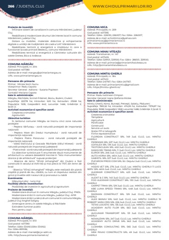266 / JUDE%u021aUL CLUJ WWW.GHIDULPRIMARIILOR.ROProiecte de investi%u0163ii:%u00cenfiin%u021bare sistem de canalizare %u00een comuna M%u0103n%u0103stireni, jude%u021bul ClujReabilitare %u0219i modernizare drumuri de interes local %u00een comuna M%u0103n%u0103stireni, jude%u021bul ClujDotare cu mobilier, materiale didactice %u015fi echipamente digitale a unit%u0103%u0163ii de %u00eenv%u0103%u0163%u0103m%u00e2nt din cadrul UAT M%u0103n%u0103stireniReabilitarea termic%u0103 %u0219i energetic%u0103 a imobilului %u00een care a func%u021bionat %u0218coala primar%u0103 Bedeciu, comuna M%u0103n%u0103stireniReabilitarea termic%u0103 %u0219i energetic%u0103 a C%u0103minelor culturale din satele Dretea, Bica %u0219i ArdeovaCOMUNA M%u0102RG%u0102UAdres%u0103: Principal%u0103, nr. 204Cod po%u0219tal: 407380Adresa de e-mail: margau@primariamargau.roURL: www.primariamargau.roPersoane din primarie:Primar:%u00a0 Mircea Sorin%u00a0Suciu%u00a0Viceprimar: Radu CapotaSecretar General:%u00a0 Adriana - Susana%u00a0PopteanContabil: Mariana%u00a0Capota%u00a0Sate %u00een administra%u021bie:M%u0103rg%u0103u, R%u0103chi%u021bele, Scrind-Fr%u0103sinet, Bociu,%u00a0Buteni, CiuleniSuprafa%u021ba:%u00a0 22078 ha; Intravilan:%u00a0 520 ha; Extravilan:%u00a0 21558 ha; Popula%u021bia:%u00a0 1535; Gospod%u0103rii:%u00a0 642; Locuin%u021be:%u00a0 1466; Gr%u0103dini%u021be:%u00a0 2; %u0218coli:%u00a02; Activitati economice si specifice zonei:Cre%u015fterea animalelorAgroturismObiective turistice:%u00cen teritoriul comunei M%u0103rg%u0103u se %u00eenscriu cinci zone naturale protejate:- Pe%u015ftera V%u00e2rfura%u015fu - zon%u0103 natural%u0103 protejat%u0103 de importan%u0163%u0103 na%u0163ional%u0103- Pe%u015ftera Mare din Dealul Humpleului - zon%u0103 natural%u0103 de importan%u0163%u0103 na%u0163ional%u0103- Pe%u015ftera Piatra Ponorului - zon%u0103 natural%u0103 protejat%u0103 de importan%u0163%u0103 na%u0163ional%u0103- Valea Stanciului %u015fi Cascada R%u0103chi%u0163ele (V%u0103lul Miresei) - zon%u0103 natural%u0103 protejat%u0103 de importan%u0163%u0103 jude%u0163ean%u0103- Piatra Ars%u0103 - zon%u0103 natural%u0103 protejat%u0103 de importan%u0163%u0103 jude%u0163ean%u0103Ca obiective turistice pot fi enumerate dou%u0103 monumente de arhitectur%u0103 cu valoare deosebit%u0103 %u00eenscrise %u00een %u201clista monumentelor istorice %u015fi de arhitectur%u0103%u201d supuse protec%u0163iei:- Biserica de lemn %u201cSfin%u0163ii Arhangheli%u201d din Ciuleni a fost construit%u0103 %u00een secolul al XVIII-lea %u015fi mai precis la 1707, din lemn de brad- Biserica %u201cSfin%u0163ii Arhangheli%u201d M%u0103rg%u0103u este realizat%u0103 din piatr%u0103 cioplit%u0103 %u015fi piatr%u0103 de r%u00e2u, cl%u0103dit%u0103, cu turn al clopotului realizat din grinzi %u015fi %u00eenvelite at%u00e2t naosul c%u00e2t %u015fi pronaosul cu tabl%u0103Evenimente:M%u0103suri%u015ful oilor - luna maiFacilit%u00e3%u0163i oferite investitorilor:Posibilit%u0103%u0163i de investire %u00een agricultur%u0103 %u015fi agroturismProiecte de investi%u0163ii:Modernizare drumuri %u00een comuna M%u0103rg%u0103u, jude%u021bul Cluj- PNDLModernizare str%u0103zi %u00een comuna M%u0103rg%u0103u, jude%u021bul Cluj- AFIRModernizare str%u0103zi rurale %u0219i drum comunal %u00een comuna M%u0103rg%u0103u, jude%u021bul Cluj-Anghel SalignyAmenajare centru %u00een satele M%u0103rg%u0103u %u0219i R%u0103chi%u021beleExtindere iluminat public Parc pentru copiiCOMUNA M%u0102RI%u015eELAdres%u0103: Principal%u0103, nr. 610Cod po%u0219tal: 407390Telefon: 0264-334161,0264-334162; Fax: 0264-891936; Adresa de e-mail: marisel@cj.e-adm.roURL: http://www.primariamarisel.ro/COMUNA MICAAdres%u0103: Principal%u0103, nr. 209Cod po%u0219tal: 407395Telefon: 0264- 226130, 226007; Fax: 0264- 226007; Adresa de e-mail: achizitiimica@yahoo.comprimariamicacj@primariamica.roURL: www.primariamica.roCOMUNA MIHAI VITEAZUAdres%u0103: Transilvaniei, nr. 147Cod po%u0219tal: 407405Telefon: 0264-329101, 329100; Fax: 0264- 286101, 329100; Adresa de e-mail: primaria@primariamihaiviteazu.ro URL: http://primariamihaiviteazu.roCOMUNA MINTIU GHERLIIAdres%u0103: Principal%u0103, nr. 184Cod po%u0219tal: 407410Telefon: 0264-241767; Fax: 0264-241767; Adresa de e-mail: primariamintiu@gmail.comURL: https://mintiu-gherlii.ro/Persoane din primarie:Primar: Radu Iustinean C%u00eempanSecretar General:%u00a0Ioana %u015etefania Miclea%u00a0Sate %u00een administra%u021bie:Mintiu Gherlii, Nima, Bune%u015fti, Petre%u015fti, Salatiu, P%u0103dureniSuprafa%u021ba:%u00a0 7851,52 ha; Intravilan:%u00a0 474,95 ha; Extravilan:%u00a0 7376,97 ha; Popula%u021bia:%u00a03598; Gospod%u0103rii:%u00a01258; Locuin%u021be:%u00a01486; Gr%u0103dini%u021be:%u00a03; %u0218coli:%u00a03; Activitati economice si specifice zonei:Cre%u0219terea animalelorT%u00e2mpl%u0103rieAgricultur%u0103Panifica%u021bieConstruc%u021biiService-uri autoSta%u021bie ITP si tahografeFirme reprezentative:FLOREAN CONSTRUCT SRL 149 Jud. CLUJ, Loc. MINTIU GHERLIIPERENNIS SRL 537 Jud. CLUJ, Loc. MINTIU GHERLIICOFALEX SRL 139 Jud. CLUJ, Loc. MINTIU GHERLIITEOTONCLEAN SRL 402 Jud. CLUJ, Loc. MINTIU GHERLIIMAXIGORI TRANS SRL 11 Jud. CLUJ, Loc. MINTIU GHERLIIELIROX SRL 246 Jud. CLUJ, Loc. MINTIU GHERLIIAUTO HORIA SRL 461A Jud. CLUJ, Loc. MINTIU GHERLIIGABISTIL SRL 327 Jud. CLUJ, Loc. MINTIU GHERLIIPUFAROM PROD COM SRL Str. Dejului Jud. CLUJ, Loc. MINTIU GHERLIIHODIS VET SRL 276 Jud. CLUJ, Loc. MINTIU GHERLII 11 LUCS SERV SRL 461A Jud. CLUJ, Loc. MINTIU GHERLIIALEXMAR CONSTRUCT SRL 423 Jud. CLUJ, Loc. MINTIU GHERLIIALEXIT & C SRL 140 Jud. CLUJ, Loc. MINTIU GHERLIIFOD ALEXMAR CONSTRUCT SRL 130 Jud. CLUJ, Loc. MINTIU GHERLIICARPET TRMA SRL 129 Jud. CLUJ, Loc. MINTIU GHERLIIKBE LUMA SPEED TRANS SRL 448 Jud. CLUJ, Loc. MINTIU GHERLIIRADMAN CONSTRUCT SRL 129 Jud. CLUJ, Loc. MINTIU GHERLIIALEX BANAV SRL 540 Jud. CLUJ, Loc. MINTIU GHERLII 19 ROBERT SARA CRIS SRL 226 Jud. CLUJ, Loc. MINTIU GHERLIITETAS LOGISTIC SRL 135 Jud. CLUJ, Loc. MINTIU GHERLIIACADEMY AUTO FLOR SRL 563 Jud. CLUJ,