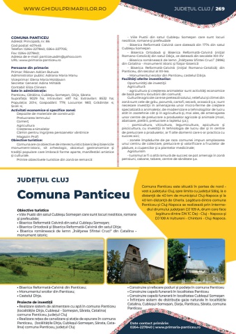 WWW.GHIDULPRIMARIILOR.RO JUDE%u021aUL CLUJ / 269COMUNA PANTICEUAdres%u0103: Principal%u0103, nr. 86Cod po%u0219tal: 407445Telefon: 0264-227840, 0264-227705; Fax: 0264-227840; Adresa de e-mail: panticeuadm@yahoo.comURL: www.primaria-panticeu.roPersoane din primarie:Primar: R%u0103zvan Adrian ButuzaAdministrator public: Adriana Maria ManuViceprimar: Elena Maria MoldovanSecretar General: Adina Mih%u0103il%u0103Contabil: Eliza C%u00eeineanSate %u00een administra%u021bie:Panticeu, C%u0103t%u0103lina, Cuble%u015fu Some%u015fan, D%u00eerja, S%u0103rataSuprafa%u021ba:%u00a0 9029 ha; Intravilan:%u00a0 497 ha; Extravilan:%u00a0 8532 ha; Popula%u021bia:%u00a0 2014; Gospod%u0103rii:%u00a0 779; Locuin%u021be:%u00a0 983; Gr%u0103dini%u021be:%u00a0 4; %u0218coli:%u00a04; Activitati economice si specifice zonei:Depozite de materiale de construc%u021biiPrelucrarea lemnuluiComer%u0163AgriculturaCre%u0219terea animalelorC%u0103min pentru %u00eengrijirea persoanelor v%u00e2rstniceMagazin ProfiObiective turistice:Comuna are ca obiective de interes turistic bisericile %u015fi bisericile monument-istoric, sit arheologic, obiceiuri gastronomice %u015fi tradi%u0163ii populare care %u00eembrac%u0103 forme aparte, manifest%u0103ri artistice %u015fi culturale.Printre obiectivele turistice din zon%u0103 se remarc%u0103:- Viile Pustii din satul Cuble%u015fu Some%u015fan care sunt locuri neolitice, romane %u015fi prefeudale- Biserica Reformat%u0103 Calvin%u0103 care dateaz%u0103 din 1774 din satul Cuble%u015fu Some%u015fan- Biserica Ortodox%u0103 %u015fi Biserica Reformat%u0103-Calvin%u0103 (ini%u0163ial Romano-Catolic%u0103) din satul D%u00e2rja, ce dateaz%u0103 din secolele XIII-XV- Biserica rom%u00e2neasc%u0103 de lemn %u201e%u00cen%u0103l%u0163area Sfintei Cruci%u201d (1896) din Catalina - monument istoric %u015fi foi%u015for-biseric%u0103- Biserica Reformat%u0103-Calvin%u0103 (ini%u0163ial Romano-Catolic%u0103) din Panticeu, din secolul al XII-lea.- Monumentul eroilor din Panticeu, castelul D%u00e2rja.Facilit%u00e3%u0163i oferite investitorilor:Oportunit%u0103%u0163i de investi%u0163iiAgricultur%u0103- agricultura %u015fi cre%u015fterea animalelor sunt activit%u0103%u0163i economice de baz%u0103 pentru locuitorii din comun%u0103;Culturile agricole care se preteaz%u0103 solului, reliefului %u015fi climei din zon%u0103 sunt cele de gr%u00e2u, porumb, cartofi, secar%u0103, orzoaic%u0103 %u015f.a.; sunt necesare investi%u0163ii %u00een amenajarea unor micro-ferme de cre%u015ftere specializat%u0103 a animalelor, de modernizare a tehnologiilor de lucru at%u00e2t %u00een zootehnie c%u00e2t %u015fi %u00een agricultur%u0103 %u015fi, mai ales, de amenajarea unor centre de prelucrare a produselor agricole %u015fi animale (mori, abatoare, piel%u0103rii, prelucrare a laptelui %u015f.a.);- pomicultura, viticultura, legumicultura, apicultura %u015fi piscicultura, cu investi%u0163ii %u00een tehnologia de lucru dar %u015fi %u00een centre de prelucrare a produselor, ar fi alte domenii care s-ar practica cu succes aici;- zonele %u00eemp%u0103durite de pe raza comunei impun amplasarea unui centru de colectare, prelucrare %u015fi valorificare a fructelor de p%u0103dure, a ciupercilor %u015fi a plantelor medicinale;Agroturism- turismul ar fi o alt%u0103 ramur%u0103 de succes: se pot amenaja %u00een zon%u0103 pensiuni, cabane, tabere, centre de s%u0103n%u0103tate %u015f.a.