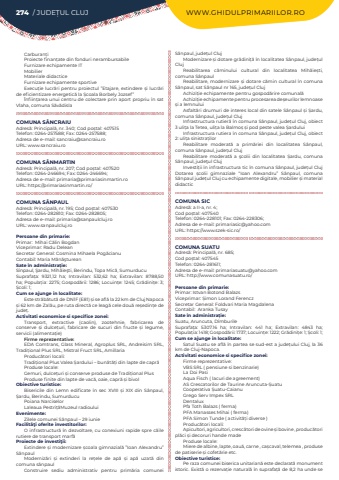 274 / JUDE%u021aUL CLUJ WWW.GHIDULPRIMARIILOR.ROCarburan%u021biProiecte finan%u021bate din fonduri nerambursabileFurnizare echipamente ITMobilierMateriale didacticeFurnizare echipamente sportiveExecu%u021bie lucr%u0103ri pentru proiectul %u201dEtajare, extindere %u0219i lucr%u0103ri de eficientizare energetic%u0103 la %u0218coala Borbely Jozsef%u201d%u00cenfiin%u021barea unui centru de colectare prin aport propriu %u00een sat Vlaha, comuna S%u0103v%u0103dislaCOMUNA S%u00c2NCRAIUAdres%u0103: Principal%u0103, nr. 340; Cod po%u0219tal: 407515Telefon: 0264-257588; Fax: 0264-257588; Adresa de e-mail: sancraiu@sancraiu.roURL: www.sancraiu.roCOMUNA S%u00c2NMARTINAdres%u0103: Principal%u0103, nr. 207; Cod po%u0219tal: 407520Telefon: 0264-246694; Fax: 0264-246694; Adresa de e-mail: primaria@primariasinmartin.roURL: https://primariasinmartin.ro/COMUNA S%u00c2NPAULAdres%u0103: Principal%u0103, nr. 195; Cod po%u0219tal: 407530Telefon: 0264-282810; Fax: 0264-282805; Adresa de e-mail: primaria@sanpaulcluj.roURL: www.sanpaulcluj.roPersoane din primarie:Primar:%u00a0 Mihai C%u0103lin BogdanViceprimar: Radu DeleanSecretar General: Cosmina Mihaela%u00a0Pog%u0103cianu%u00a0Contabil: Maria M%u0103n%u0103%u015ftureanSate %u00een administra%u021bie:S%u00eenpaul, %u015eardu, Mih%u0103ie%u015fti, Berindu, Topa Mic%u0103, SumurducuSuprafa%u021ba:%u00a0 9321,12 ha; Intravilan:%u00a0 532,62 ha; Extravilan:%u00a0 8788,50 ha; Popula%u021bia:%u00a02275; Gospod%u0103rii:%u00a01286; Locuin%u021be:%u00a01245; Gr%u0103dini%u021be:%u00a03; %u0218coli:%u00a01; Cum se ajunge in localitate:Este str%u0103b%u0103tut%u0103 de DN1F (E81) %u0219i se afl%u0103 la 22 km de Cluj Napoca %u0219i 62 km de Zal%u0103u, pe ruta direct%u0103 ce leag%u0103 cele dou%u0103 re%u0219edin%u021be de jude%u021b.Activitati economice si specifice zonei:Transport, extractive (caolin), zootehnie, fabricarea de conserve %u0219i dulce%u021buri, fabricare de sucuri din fructe %u0219i legume, servicii (alimenta%u021bie)Firme reprezentative:EDA Comtrans, Glass Mineral, Agroplus SRL, Andreisim SRL, Tradi%u021bional Plus SRL, Mistral Fruct SRL, AmillariaProduc%u0103tori locali:Tradi%u021bional Plus Valea %u0218ardului %u2013 bun%u0103t%u0103%u021bi din lapte de capr%u0103Produse locale:Gemuri, dulce%u021buri %u0219i conserve produse de Tradi%u021bional PlusProduse finite din lapte de vac%u0103, oaie, capr%u0103 %u0219i bivolObiective turistice:Bisericile din Lemn edificate %u00een sec XVIII %u0219i XIX din S%u00e2npaul, %u0218ardu, Berindu, SumurducuPoiana NarciselorLaleaua Pestri%u021b%u0103Muzeul radiouluiEvenimente:Zilele comunei S%u00e2npaul %u2013 29 iunieFacilit%u00e3%u0163i oferite investitorilor:O infrastructur%u0103 %u00een dezvoltare, cu conexiuni rapide spre c%u0103ile rutiere de transport marf%u0103Proiecte de investi%u0163ii:Extindere %u0219i modernizare %u0219coala gimnazial%u0103 %u201dIoan Alexandru%u201d S%u00e2npaulModerniz%u0103ri %u0219i extinderi la re%u021bele de ap%u0103 %u0219i ap%u0103 uzat%u0103 din comuna s%u00e2npaulConstruire sediu administrativ pentru prim%u0103ria comunei S%u00e2npaul, jude%u021bul ClujModernizare %u0219i dotare gr%u0103dini%u021b%u0103%u00a0%u00een localitatea S%u00e2npaul, jude%u021bul ClujReabilitarea c%u0103minului cultural din localitatea%u00a0 Mih%u0103ie%u0219ti, comuna%u00a0S%u00e2npaulReabilitare, modernizare %u0219i dotare c%u0103min cultural %u00een comuna S%u00e2npaul, sat S%u00e2npaul nr 165, jude%u021bul ClujAchizi%u021bie echipamente pentru gospod%u0103rire comunal%u0103Achizi%u021bie echipamente pentru procesarea de%u0219eurilor lemnoase %u0219i a lemnuluiAsfalt%u0103ri drumuri de interes local din satele S%u00e2npaul %u0219i %u0218ardu, comuna S%u00e2npaul, jude%u021bul ClujInfrastructura rutier%u0103 %u00een comuna S%u00e2npaul, jude%u021bul Cluj, obiect 3 uli%u021ba la Tetea, uli%u021ba la Balmo%u0219 %u0219i pod peste valea %u0218arduluiInfrastructura rutiera %u00een comuna S%u00e2npaul, jude%u021bul Cluj, obiect 2: uli%u021ba sinistra%u021bilorReabilitare moderat%u0103 a prim%u0103riei din localitatea S%u00e2npaul, comuna S%u00e2npaul, jude%u021bul ClujReabilitare moderat%u0103 a %u015fcolii din localitatea %u0218ardu, comuna S%u00e2npaul, jude%u0163ul ClujInvesti%u021bii %u00een infrastructura tic %u00een comuna S%u00e2npaul, jude%u021bul ClujDotarea %u0219colii gimnaziale %u201cIoan Alexandru%u201d S%u00e2npaul, comuna S%u00e2npaul jude%u021bul Cluj cu echipamente digitale, mobilier %u0219i material didacticCOMUNA SICAdres%u0103: a II-a, nr. 4; Cod po%u0219tal: 407540Telefon: 0264-228101; Fax: 0264-228306; Adresa de e-mail: primariasic@yahoo.comURL: https://www.szek-sic.ro/COMUNA SUATUAdres%u0103: Principal%u0103, nr. 685; Cod po%u0219tal: 407545Telefon: 0264-281611; Adresa de e-mail: primariasuatu@yahoo.comURL: http://www.comunasuatu.ro/Persoane din primarie:Primar:%u00a0Istvan Botond Balazs%u00a0Viceprimar: %u0218imon Lorand FerenczSecretar General: Foldvari Maria MagdalenaContabil: %u00a0Aranka TusaySate %u00een administra%u021bie:Suatu, Aruncuta, D%u00eemburileSuprafa%u021ba:%u00a0 5307.16 ha; Intravilan:%u00a0 441 ha; Extravilan:%u00a0 4843 ha; Popula%u021bia:%u00a01418; Gospod%u0103rii:%u00a01737; Locuin%u021be:%u00a01222; Gr%u0103dini%u021be:%u00a01; %u0218coli:%u00a01; Cum se ajunge in localitate:Satul Suatu se afl%u0103%u00a0%u00een partea se sud-est a jude%u021bului Cluj, la 36 km de Cluj-Napoca.Activitati economice si specifice zonei:Firme reprezentative:VBS SRL ( pensiune si benzinarie)La Doi PasiAqua Fisch ( lacuri de agreement)AS Crescatorilor de Taurine Aruncuta-%u0218uatuCooperativa %u0218uatu-CaianuGrego Serv Impex SRLDentaluxPfa Toth Balazs ( ferma)PFA Manasses Mihai ( ferma)PFA Simon Tunde ( activit%u0103%u021bi diverse )Produc%u0103tori locali:Apicultori, agricultori, cresc%u0103tori de ovine %u0219i bovine , produc%u0103tori pl%u0103ci %u0219i decoruri hande madeProduse locale:Miere de albine, lapte, oau%u0103, carne , ca%u0219caval, telemea , produse de patiserie %u0