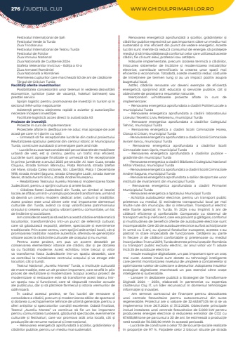276 / JUDE%u021aUL CLUJ WWW.GHIDULPRIMARIILOR.ROFestivalul Interna%u021bional de %u0218ahFestivalul Verde la TurdaZiua TricoloruluiFestivalul Interna%u021bional de Teatru TurdaFestivalul de FolclorZiua Imnului NationalZiua Na%u021bional%u0103 de Cur%u0103%u021benie 2024%u00a0%u0218tafeta Veteranilor Invictus %u2013 Edi%u021bia a XI-aZiua Armatei Rom%u00e2nieiZiua Na%u021bional%u0103 a Rom%u00e2nieiPremierea cuplurilor care marcheaz%u0103 50 de ani de c%u0103s%u0103torieT%u00e2rgul de Cr%u0103ciun TurdaFacilit%u00e3%u0163i oferite investitorilor:Posibilitatea concesion%u0103rii unor terenuri %u00een vederea dezvolt%u0103rii economice, turistice (case de vacan%u0163%u0103, hoteluri balneare) sau prest%u0103ri serviciiSprijin logistic pentru promovarea de investi%u0163ii %u00een turism %u015fi %u00een sectorul IMM-urilor nepoluanteAsisten%u0163%u0103 pentru ob%u0163inerea rapid%u0103 a avizelor %u015fi autoriza%u0163iilor necesare %u00eenceperii investi%u0163iei Facilitate logistic%u0103: acces direct la autostrada A3Proiecte de investi%u0163ii:Proiecte %u00een curs de implementare:Proiectele aflate %u00een desf%u0103%u0219urare ne aduc mai aproape de acel acas%u0103 pe care ni-l dorim cu to%u021bii:- Urmeaz%u0103 s%u0103 fie recep%u021bionate lucr%u0103rile din cadrul proiectului Revitalizarea spa%u021biului pietonal din centrul istoric al Municipiului Turda, construire autobaz%u0103 %u0219i amenajare park and ride.- Lucr%u0103rile au avansat considerabil pe coridoarele de mobilitate urban%u0103 de vest, est %u0219i centru, pentru un trafic mai eficient. Lucr%u0103rile sunt aproape finalizate %u0219i urmeaz%u0103 s%u0103 fie recep%u021bionate %u00een prima jum%u0103tate a anului 2025 pe strazile: Al. Ioan Cuza, strada Clujului, strada Simion B%u0103rnu%u021biu, Pia%u021ba Roman%u0103, strada %u0218tefan cel Mare, strada Calea Victoriei, Str. Libert%u0103%u021bii, Pia%u021ba 1 Decembrie 1918, strada Andrei %u0218aguna, strada Gheorghe Laz%u0103r, strada Axente Sever, strada Avram Iancu, strada Andrei Mure%u0219anu.%u00a0- Reabilitarea Teatrului Aureliu Manea %u0219i modernizarea fostei Judec%u0103torii, pentru a sprijini cultura %u0219i artele locale.- Cl%u0103direa fostei Judec%u0103torii din Turda, un simbol al istoriei locale, se afl%u0103 acum %u00eentr-un amplu proces de transformare, urm%u00e2nd s%u0103 devin%u0103 un centru modern dedicat artei, culturii %u0219i tradi%u021biilor. Acest proiect este unul dintre cele mai importante demersuri culturale din Turda, av%u00e2nd ca scop valorificarea patrimoniului ora%u0219ului %u0219i crearea unui spa%u021biu vibrant pentru comunitate, un loc de %u00eent%u00e2lnire %u0219i socializare.Am considerat esen%u021bial s%u0103 red%u0103m aceast%u0103 cl%u0103dire emblematic%u0103 locuitorilor, transform%u00e2nd-o %u00eentr-un punct de referin%u021b%u0103 cultural, care s%u0103 g%u0103zduiasc%u0103 expozi%u021bii, ateliere, spectacole %u0219i evenimente tradi%u021bionale. Prin acest centru, vom sprijini at%u00e2t arti%u0219tii locali, c%u00e2t %u0219i promovarea tradi%u021biilor noastre autentice, oferindu-le genera%u021biilor viitoare acces la r%u0103d%u0103cinile culturale ale ora%u0219ului %u0219i nu numai.Pentru acest proiect, am pus un accent deosebit pe conservarea elementelor istorice ale cl%u0103dirii, dar %u0219i pe dotarea sa cu facilit%u0103%u021bi moderne. Acest echilibru %u00eentre trecut %u0219i viitor va transforma fosta Judec%u0103torie %u00eentr-un spa%u021biu deosebit, care va contribui la revitalizarea centrului ora%u0219ului %u0219i va atrage at%u00e2t locuitori, c%u00e2t %u0219i turi%u0219ti.Teatrul Na%u021bional %u201eAureliu Manea%u201d Turda, o institu%u021bie cultural%u0103 de mare tradi%u021bie, este un alt proiect important, care se afl%u0103 %u00een plin proces de revitalizare %u0219i modernizare. Scopul acestui proiect de modernizare si restaurare este s%u0103 transforme acest teatru %u00eentrun spa%u021biu nou %u0219i func%u021bional, care s%u0103 r%u0103spund%u0103 nevoilor actuale ale publicului, dar %u0219i s%u0103 p%u0103streze farmecul %u0219i istoria vremurilor de odihnioar%u0103.%u00cen cadrul acestui proiect, se fac lucr%u0103ri de renovare %u0219i consolidare a cl%u0103dirii, precum %u0219i modernizarea s%u0103lilor de spectacol %u0219i dotarea cu echipamente tehnice de ultim%u0103 genera%u021bie, pentru a oferi arti%u0219tilor %u0219i spectatorilor condi%u021bii excelente. Odat%u0103 finalizat, Teatrul %u201eAureliu Manea%u201d va continua s%u0103 fie un loc important pentru comunitatea turdean%u0103, g%u0103zduind spectacole, evenimente culturale %u0219i festivaluri, care vor promova at%u00e2t arta local%u0103, c%u00e2t %u0219i produc%u021biile de renume na%u021bional %u0219i interna%u021bional.- Renovarea energetic%u0103 aprofundat%u0103 a %u0219colilor, gr%u0103dini%u021belor %u0219i cl%u0103dirilor publice, pentru un mediu mai sustenabil.Renovarea energetic%u0103 aprofundat%u0103 a %u0219colilor, gr%u0103dini%u021belor %u0219i cl%u0103dirilor publice reprezint%u0103 un pas important c%u0103tre un mediu mai sustenabil %u0219i mai eficient din punct de vedere energetic. Aceste lucr%u0103ri sunt menite s%u0103 reduc%u0103 consumul de energie, s%u0103 protejeze mediul %u0219i s%u0103 %u00eembun%u0103t%u0103%u021beasc%u0103 confortul celor care utilizeaz%u0103 aceste cl%u0103diri, fie c%u0103 sunt elevi, profesori sau cet%u0103%u021beni.M%u0103surile implementate, precum izolarea termic%u0103 a cl%u0103dirilor, %u00eenlocuirea sistemelor de %u00eenc%u0103lzire %u0219i modernizarea instala%u021biilor electrice, contribuie semnificativ la crearea unor spa%u021bii mai eficiente %u0219i economice. Totodat%u0103, aceste investi%u021bii reduc costurile de %u00eentre%u021binere pe termen lung %u0219i au un impact pozitiv asupra bugetului local.Astfel, cl%u0103dirile renovate vor deveni exemple de eficien%u021b%u0103 energetic%u0103, sprijinind at%u00e2t educa%u021bia %u0219i serviciile publice, c%u00e2t %u0219i obiec