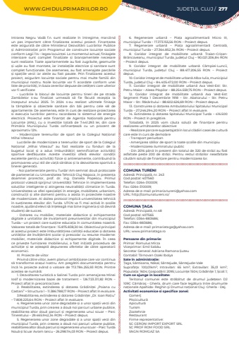 WWW.GHIDULPRIMARIILOR.RO JUDE%u021aUL CLUJ / 277Intrarea Negru Vod%u0103 f.n. sunt realizate %u00een %u00eentregime, marc%u00e2nd un pas important c%u0103tre finalizarea acestui proiect. Finan%u021barea este asigurat%u0103 de c%u0103tre Ministerul Dezvolt%u0103rii Lucr%u0103rilor Publice %u0219i Administra%u021biei prin Programul de construire locuin%u021be sociale conform Legii 114 %u2013 legea locuin%u021bei. La momentul actual, finisajele interioare sunt complet finalizate %u0219i bran%u0219amentele necesare sunt realizate. Toate apartamentele au fost zugr%u0103vite, geamurile %u0219i u%u0219ile au fost montate, iar instala%u021biile electrice %u0219i sanitare sunt complet func%u021bionale. De asemenea, au fost amenajate parc%u0103rile %u0219i spa%u021biile verzi iar aleile au fost pavate. Prin finalizarea acestui proiect, asigur%u0103m locuin%u021be sociale pentru mai multe familii din municipiul nostru. Noile locuin%u021be vor fi acordate conform unei liste de priorit%u0103%u021bi, %u00een baza cererilor depuse de cet%u0103%u021beni care ulterior vor fi verificate%u2022 Lucr%u0103rile la blocul de locuin%u021be pentru tineri de pe strada Zambilelor s-au finalizat urmeaz%u0103 s%u0103 fie f%u0103cut%u0103 recep%u021bia la %u00eenceputul anului 2025. %u00cen 2024 s-au realizat ultimele finisaje la t%u00e2mpl%u0103rie %u0219i obiectele sanitare din b%u0103i pentru cele 48 de apartamente. De asemenea, este %u00een curs de realizare proiectarea si execu%u021bia lucr%u0103rilor pentru racordarea la sistemul de energie electric%u0103. Proiectul este finan%u021bat de Agen%u021bia Na%u021bional%u0103 pentru Locuin%u021be (ANL), cu o investi%u021bie total%u0103 de 7.441.293 lei, din care Prim%u0103ria Municipiului Turda cofinan%u021beaz%u0103 cu un procent de aproximativ 12%.%u2022 Modernizare terenurilor de sport de la Colegiul Na%u021bional Mihai ViteazulLucr%u0103rile de modernizare a terenurilor de sport de la Colegiul Na%u021bional %u201eMihai Viteazul%u201d au fost realizate cu fonduri de la bugetul local %u0219i a adus %u00eembun%u0103t%u0103%u021biri semnificative activit%u0103%u021bii sportive desf%u0103%u0219urate. Aceste investi%u021bii ofer%u0103 elevilor condi%u021bii excelente pentru activit%u0103%u021bi fizice %u0219i antrenamente, contribuind la promovarea unui stil de via%u021b%u0103 s%u0103n%u0103tos %u0219i la dezvoltarea sportiv%u0103 a tinerei genera%u021bii.%u2022 Noi parteneriate pentru Turda! Am semnat dou%u0103 protocoale de parteneriat cu Universitatea Tehnic%u0103 Cluj-Napoca, %u00een prezen%u021ba doamnei prorector, prof. dr. ing. Daniela Popescu. Primul protocol vizeaz%u0103 sprijinul Universit%u0103%u021bii Tehnice %u00een implementarea solu%u021biilor inteligente %u0219i atingerea neutralit%u0103%u021bii climatice %u00een Turda. Universitatea va oferi speciali%u0219ti %u00een energie, mobilitate, urbanism, construc%u021bii %u0219i alte domenii pentru a asista %u00een proiectele noastre de modernizare. Al doilea protocol implic%u0103 universitatea tehnic%u0103 %u00een sus%u021binerea elevilor din Turda. UTCN va fi mai activ%u0103 %u00een %u0219colile noastre, ajut%u00e2nd elevii s%u0103 %u00een%u021beleag%u0103 mai bine ingineria %u0219i s%u0103 devin%u0103 studen%u021bi de succes.%u2022 Dotarea cu mobilier, materiale didactice %u0219i echipamente digitale a unitatilor de invatamant preuniversitar din municipiul Turda.%u2013 un proiect care sus%u021bine educa%u021bia %u00een comunitatea noastr%u0103. Valoarea total%u0103 de finan%u021bare : 15.875.838,30 lei. Obiectivul principal al acestui proiect este %u00eembun%u0103t%u0103%u021birea calit%u0103%u021bii educa%u021biei %u0219i dotarea unit%u0103%u021bilor de %u00eenv%u0103%u021b%u0103m%u00e2nt %u0219colar %u0219i prescolar cu resurse moderne: mobilier, materiale didactice %u0219i echipamente digitale. %u00cen ceea ce prive%u0219te furnizarea mobilierului, a fost ini%u021biat%u0103 procedura de achizi%u021bie %u0219i se a%u0219teapt%u0103 depunerea ofertelor de c%u0103tre operatorii economici.%u00a0III. Proiecte de viitorPrivind c%u0103tre viitor, avem planuri ambi%u021bioase care vor continua s%u0103 transforme ora%u0219ul nostru. Am preg%u0103titi documenta%u021bia pentru %u00eenc%u0103 14 proiecte av%u00e2nd o valoare de 713.784.255,93 RON. Printre acestea se num%u0103r%u0103:1. Dezvoltarea turistic%u0103 a Salinei Turda prin amenajarea Minei Iosif %u0219i modernizarea bazei de tratament %u2013 126.723.311,82 RON %u2013 Proiect aflat %u00een precontractare.2. Reabilitarea, extinderea %u0219i dotarea Gr%u0103dini%u021bei %u201ePoiana cu Castani%u201d + Structura 1 %u2013 11.386.788,17 RON %u2013 Proiect aflat %u00een evaluare.3.Reabilitarea, extinderea %u0219i dotarea Gr%u0103dini%u021bei %u201eDr. Ioan Ra%u021biu%u201d %u2013 7.808.225,64 RON %u2013 Proiect aflat %u00een evaluare.4. Regenerarea unor zone degradate %u0219i a unor spa%u021bii verzi din municipiul Turda, prin crearea a dou%u0103 noi parcuri urbane publice, reabilitarea altor dou%u0103 parcuri %u0219i regenerarea unui scuar %u2013 Parc Tineretului %u2013 29.465.942,34 RON %u2013 Proiect depus.5. Regenerarea unor zone degradate %u0219i a unor spa%u021bii verzi din municipiul Turda, prin crearea a dou%u0103 noi parcuri urbane publice, reabilitarea altor dou%u0103 parcuri %u0219i regenerarea unui scuar %u2013 Parc Turda Nou%u0103 %u0219i Scuar Avram Iancu %u2013 26.298.114,03 RON %u2013 Proiect depus.6. Regenerare urban%u0103 %u2013 Pia%u021ba agroalimentar%u0103 Micro III, municipiul Turda %u2013 17.373.155,56 RON %u2013 Proiect depus.7. Regenerare urban%u0103 %u2013 Pia%u021ba agroalimentar%u0103 Central%u0103, municipiul Turda %u2013 27.364.852,34 RON %u2013 Proiect depus.8. Coridor integrat de mobilitate urban%u0103 Traian-Cri%u0219anBr%u00e2ncoveanu, municipiul Turda, jude%u021bul Cluj %u2013 90.021.206,84 RON %u2013 Proiect depus.9. Coridor integrat de mobilitate urban%u0103 C%u00e2mpiei-Luncii, municipiul Turda, jude%u021bul Cluj %u2013 88.41