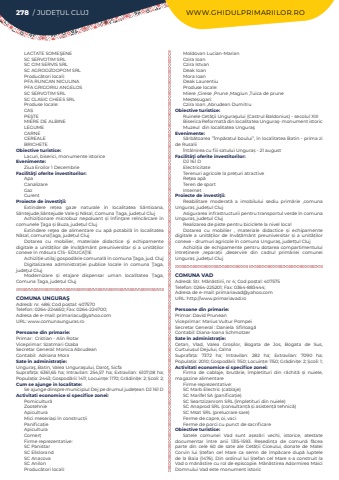 278 / JUDE%u021aUL CLUJ WWW.GHIDULPRIMARIILOR.ROLACTATE SOME%u015eENESC SERVOTIM SRLSC CIM SERVIS SRLSC AGROOZOOPOM SRL Produc%u0103tori locali:PFA RUNCAN NICULINAPFA GRIGORIU ANGELOSSC SERVOTIM SRLSC CLASIC CHEES SRLProduse locale:CA%u0218PE%u015eTEMIERE DE ALBINELEGUMECARNECEREALEBRICHETEObiective turistice:Lacuri, biserici, monumente istoriceEvenimente:Ziua Eroilor 1 DecembrieFacilit%u00e3%u0163i oferite investitorilor:ApaCanalizareGaz CurentProiecte de investi%u0163ii:Extindere re%u021bea gaze naturale %u00een localitatea S%u00e2ntioana, S%u00e2ntejude,S%u00e2ntejude Vale %u015fi N%u01cesal, Comuna %u021aaga, jude%u021bul%u00a0ClujAchizi%u021bionare microbuz nepoluant %u0219i %u00eenfin%u0163are re%u00eenc%u0103rcare %u00een comunele %u0162aga %u0219i Buza, jude%u021bul ClujExtindere re%u0163ea de alimentare cu ap%u0103%u00a0 potabil%u0103 %u00een localitatea N%u01cesal, comuna%u0162aga, jude%u021bul ClujDotarea cu mobilier, materiale didactice %u015fi echipamente digitale a unit%u0103%u021bilor de %u00eenv%u0103%u0163%u0103m%u00e2nt preuniversitar %u0219i a unit%u0103%u021bilor conexe %u00een m%u0103sura C15- EDUCA%u0162IEAchizi%u021bie utilaj gospod%u0103rie comunal%u0103 %u00een comuna %u0162aga, jud. ClujDigitalizarea administra%u021biei publice locale %u00een comuna %u0162aga, jude%u0163ul ClujModernizare %u0219i etajare dispensar uman localitatea %u021aaga, Comuna %u021aaga, jude%u021bul ClujCOMUNA UNGURA%u015eAdres%u0103: nr. 486; Cod po%u0219tal: 407570Telefon: 0264-224650; Fax: 0264-224700; Adresa de e-mail: primariacu@yahoo.comURL: www.comunaunguras.roPersoane din primarie:Primar:%u00a0%u00a0Cristian - Alin RotarViceprimar: Szatmari CsabaSecretar General: Monica%u00a0AbrudeanContabil:%u00a0 Adriana%u00a0MoraSate %u00een administra%u021bie:Ungura%u015f, Batin, Valea Ungura%u015fului, Daro%u0163, SicfaSuprafa%u021ba:%u00a06361,65 ha; Intravilan:%u00a0254,57 ha; Extravilan:%u00a06107,08 ha; Popula%u021bia:%u00a02443; Gospod%u0103rii:%u00a01411; Locuin%u021be:%u00a01170; Gr%u0103dini%u021be:%u00a02; %u0218coli:%u00a02; Cum se ajunge in localitate:Se ajunge dinspre municipiul Dej pe drumul jude%u021bean DJ 161 DActivitati economice si specifice zonei:Pomicultur%u0103ZootehnieApiculturaMici meseria%u0219i %u00een construc%u021biiPanifica%u021bieApiculturaComer%u021bFirme reprezentative:SC PanistarSC ElislorandSC AnacovaSC AnilonProduc%u0103tori locali:Moldovan Lucian-MarianCzira IoanCzira IstvanDeak IoanMora IoanDeak LaurentiuProduse locale:Miere ,Cirese ,Prune ,Magiun ,Tuica de pruneMe%u0219te%u0219ugari: Czira Ioan ,Abrudean DumitruObiective turistice:Ruinele Cet%u0103%u0163ii Ungura%u015fului (Castrul Baldonius) - secolul XIIIBiserica Reformat%u0103 din localitatea Ungura%u015f- monument istoricMuzeul%u00a0 din localitatea Ungura%u015fEvenimente:S%u0103rb%u0103toarea %u201d%u00cemp%u0103ratul boului%u201d, %u00een localitatea Batin - prima zi de Rusalii%u00cent%u00e2lnirea cu fiii satului Ungura%u0219 - 21 augustFacilit%u00e3%u0163i oferite investitorilor:DJ 161 DElectricitateTerenuri agricole la pre%u021buri atractiveRe%u021bea ap%u0103Teren de sport InternetProiecte de investi%u0163ii:Reabilitare moderat%u0103 a imobilului sediu prim%u0103rie ,comuna Ungura%u0219%u00a0,jude%u021bul ClujAsigurarea infrastructurii pentru transportul verde %u00een comuna Ungura%u0219, jude%u021bul ClujRealizarea de piste pentru biciclete la nivel localDotarea cu mobilier , materiale didactice %u0219i echipamente digitale a unit%u0103%u021bilor de %u00eenv%u0103%u021b%u0103m%u00e2nt preuniversitar %u0219i a unit%u0103%u021bilor conexe - drumuri agricole %u00een comuna Ungura%u0219, judet%u021bul ClujAchizi%u021bia de echipamente pentru dotarea compartimentului %u00eentre%u021binere ,repara%u021bii ,deservire din cadrul prim%u0103riei comunei Ungura%u0219%u00a0,jude%u021bul ClujCOMUNA VADAdres%u0103: Str. M%u0103n%u0103stirii, nr 4; Cod po%u0219tal: 407575Telefon: 0264-225201; Fax: 0364-883444; Adresa de e-mail: primariavad@yahoo.comURL: http://www.primariavad.roPersoane din primarie:Primar: David%u00a0Prunean%u00a0Viceprimar: Marius%u00a0Vultur PompeiSecretar General : Daniela%u00a0%u00a0Sf%u00eerloag%u0103%u00a0Contabil: Diana-Ioana%u00a0SchmotzerSate %u00een administra%u021bie:Cetan, Vlad, Valea Gro%u0219ilor, Bogata de Jos, Bogata de Sus, Curtuiu%u0219ul Dejului, CalnaSuprafa%u021ba:%u00a0 7372 ha; Intravilan:%u00a0 282 ha; Extravilan:%u00a0 7090 ha; Popula%u021bia:%u00a02010; Gospod%u0103rii:%u00a01150; Locuin%u021be:%u00a01150; Gr%u0103dini%u021be:%u00a02; %u0218coli:%u00a01; Activitati economice si specifice zonei:Firma de cablaje, brut%u0103rie, %u00eempletituri din r%u0103chit%u0103 %u0219i nuiele, magazine alimentareFirme reprezentative:SC Marb Electric (cablaje)SC Marifel SA (panifica%u021bie)SC Seartzizanrom SRL (%u00eempletituri din nuiele)SC Anaprod SRL (consultan%u021b%u0103 %u0219i asisten%u021b%u0103 tehnic%u0103)SC Msat SRL (prelucrare sare)Ferme de capre, oi, vaciFerme de porci cu punct de sacrificareObiective turistice:Satele comunei Vad sunt a%u0219ez%u0103ri vechi, istorice, atestate documentar %u00eentre anii 1315-1593. Re%u0219edin%u021ba de comun%u0103 f%u0103cea parte din cele 60 de sate ale Cet%u0103%u021bii Ciceului, donate de Matei Corvin lui %u0218tefan cel Mare ca semn de %u00eemp%u0103care dup%u0103 luptele de la Baia (1476). Din ordinul lui %u0218tefan cel Mare s-a construit la Vad o m%u0103n%u0103stire cu rol de episcopie. M%u0103n%u0103stirea Adormirea Maici Domnului Vad este monument istoric