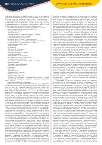 292 / JUDE%u021aUL CONSTAN%u021aA WWW.GHIDULPRIMARIILOR.ROm, 2 st%u00e2lpi galvaniza%u021bi cu %u00een%u0103l%u021bimea de 8 m, iar pe ace%u0219tia prin intermediul bra%u021belor de montaj se vor ata%u0219a l%u0103mpi tip LED, 62 de buc%u0103%u021bi de 220V/50w, respectiv 8 buc%u0103%u021bi l%u0103mpi LED 220V/ 100W.Dotarea Direc%u021bia de Gestionare a Domeniului Public %u0219i Privat Prim%u0103ria Municipiului Medgidia a investit de-a lungul anilor %u0219i %u00een dotarea Direc%u021biei de Gestionare a Domeniului Public %u0219i Privat, fiind achizi%u021bionate urm%u0103toarele ma%u0219ini, utilaje %u0219i scule:-%u00a0Tractora%u015f tuns gazon cu colector Husqvarna %u2013 2 buc%u0103%u021bi;-%u00a0Platform%u0103 modul pentru schel%u0103 %u2013 3 buc%u0103%u021bi;-%u00a0Rotopercutor Bosch;-%u00a0Foarfec%u0103 crengi;-%u00a0C%u0103rucior mobil de iriga%u0163ii cu aspersor %u2013 3 buc%u0103%u021bi;-%u00a0Ma%u015fin%u0103 tuns iarb%u0103 Stihl %u2013 4 buc%u0103%u021bi;- Cositoare um%u0103r Stihl - 10 buc%u0103%u021bi;-%u00a0Emondor Stihl %u2013 2 buc%u0103%u021bi; %u2022 Motofier%u0103str%u0103u;-%u00a0Plac%u0103 compactoare reversibil%u0103; %u2022 Pomp%u0103 submersibil%u0103;-%u00a0Cositoare um%u0103r cu motor termic %u2013 4 buc%u0103%u021bi;-%u00a0Ma%u015fin%u0103 de tuns gazon Toro;-%u00a0Motounealt%u0103;-%u00a0Scarificator;-%u00a0Tractora%u015f de tuns gazon;-%u00a0Aparat sudur%u0103/nituit;-%u00a0Ma%u015fin%u0103 tuns gazon %u2013 3 buc%u0103%u021bi;-%u00a0Ma%u015fin%u0103 de rindeluit;-%u00a0Rotopercutor cu acumulator;-%u00a0Polizor unghiular cu acumulatori;-%u00a0Ma%u015fin%u0103 de g%u0103urit electric%u0103;-%u00a0Fier%u0103str%u0103u cu motor termic( drujb%u0103) %u2013 2 buc%u0103%u021bi;-%u00a0Fier%u0103str%u0103u sabie;-%u00a0Transpalet manual hidraulic; - Cositoare um%u0103r %u2013 5 buc%u0103%u021bi;-%u00a0Demolator;-%u00a0Generator;-%u00a0Aparat sudur%u0103;-%u00a0Trus%u0103 lipit %u0163evi - 2 buc%u0103%u021bi;- Ghilotin%u0103 pavele;-%u00a0Pomp%u0103 %u00eenalt%u0103 presiune;-%u00a0Tractora%u015f de tuns gazon TORO cu co%u015f de colectare %u2013 2 buc%u0103%u021bi;-%u00a0Tractora%u015f de tuns gazon Husqvarna %u2013 2 buc%u0103%u021bi; %u2022 Autoutilitar%u0103 3,5 to %u2013 2 buc%u0103%u021bi;-%u00a0Autoutilitar%u0103 3,5 to 7+1 ( carosat%u0103).Spitalul Municipal Medgidia reprezint%u0103 cea mai important%u0103 unitate sanitar%u0103 situat%u0103 %u00een inima Dobrogei, care deserve%u0219te anual peste un sfert din locuitorii jude%u021bului Constan%u021ba, cet%u0103%u021beni din municipiul Medgidia dar %u0219i din localit%u0103%u021bile %u00eenvecinate. %u00cen urma unor investitii de aproximativ 100.000.000 lei f%u0103cute pentru reabilitarea %u0219i dotarea cu aparatur%u0103 de ultima generatie, al%u0103turi de formarea unei echipe medicale de un %u00eenalt nivel profesional, spitalul ofer%u0103 %u00een acest moment servicii de %u00eenalt%u0103 calitate pacien%u021bilor jude%u021bului Constan%u021ba. Spitalul Municipal Medgidia este amplasat pe o suprafa%u021b%u0103 de 21.525 metri p%u0103tra%u021bi, este structurat pe 4 nivele %u0219i dispune de 310 paturi pentru spitalizare continu%u0103 %u00een sec%u021biile %u0219i compartimentele sale, fiind principalul furnizor de servicii medicale din centrul jude%u021bului, av%u00e2nd urm%u0103toarele sec%u021bii: 1. Sec%u021bia Medicin%u0103 Intern%u0103, care cuprinde %u0219i: %u2022 Compartiment diabet zaharat, nutri%u021bie %u0219i boli metabolice %u2022 Compartiment reumatologie %u2022 Compartiment recuperare, medicin%u0103 fizic%u0103 %u0219i balneologie %u2022 Compartiment cardiologie %u2022 Cabinet endocrinologie 2. Sec%u021bia Obstetric%u0103 %u2013 Ginecologie 3. Sec%u021bia Neonatologie, care cuprinde %u0219i Compartiment prematuri 4. Sec%u021bia Pediatrie care cuprinde %u0219i Compartiment recuperare pediatric%u0103 5. Sec%u021bia Chirurgie General%u0103 care cuprinde %u0219i: %u2022 Compartiment oftalmologie %u2022 Compartiment ORL %u2022 Compartiment ortopedie %u0219i traumatologie 6. Sec%u021bia ATI, care cuprinde %u0219i Compartiment pentru copii 7. Sec%u021bia Neurologie 8. Compartiment de primiri urgen%u021be. Totodat%u0103, Spitalul Municipal Medgidia asigur%u0103 %u0219i asisten%u021b%u0103 medical%u0103 prin spitalizare de zi prin 40 de paturi %u00eemp%u0103r%u021bite pe principalele specialit%u0103%u021bi. Asisten%u021ba medical%u0103 de specialitate se acord%u0103 pacien%u021bilor Spitalului Municipal Medgidia %u0219i prin: %u2022 Laboratorul de analize medicale; %u2022 Laboratorul de anatomie patologic%u0103; %u2022 Laboratorul de recuperare, medicin%u0103 fizic%u0103 %u0219i balneologie; %u2022 Cabinet de planificare familial%u0103; %u2022 Cabinet de oncologie medical%u0103; %u2022 Dispensar TBC; %u2022 Compartiment endoscopie digestiv%u0103; %u2022 Laborator de radiologie %u0219i imagistic%u0103 medical%u0103 ( dotat cu instala%u021bie RX, 2 instala%u021bii CT %u0219i o instala%u021bie RMN) . Dac%u0103 %u00een anul 2016 unitatea sanitar%u0103 era aproape %u00een colaps, %u00eenregistr%u00e2nd datorii de peste 5.000.000 lei (furnizori, servicii, salaria%u021bi %u0219i ANAF), serviciile medicale l%u0103sau mult de dorit iar pacien%u021bii erau nevoi%u021bi s%u0103 %u00ee%u0219i cumpere singuri medicamentele, %u00een acest moment, fondurile europene %u0219i partenerii str%u0103ini atra%u0219i au repozi%u021bionat, %u00eencet, dar sigur, Spitalul Municipal Medgidia pe harta spitalelor atractive %u0219i sigure pentru pacien%u021bi. Aceste investi%u021bii nu ar fi fost posibile f%u0103r%u0103 sprijinul %u0219i implicarea total%u0103 a Agen%u021biei de Cooperare %u0219i Coordonare Turc%u0103 %u2013 TIKA, Ambasadei Statelor Unite ale Americii la Bucure%u0219ti, Clubului Rotary %u201eCetate Tomis%u201d %u0219i societ%u0103%u021bii Sterk Plast SRL din Medgidia. Rezultatul investi%u021biilor realizate a fost certificat de ordinul 268/04.08.2020 prin care Spitalul Municipal Medgidia a fost reclasificat din