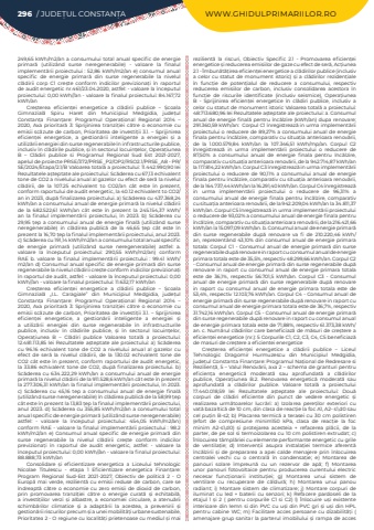 296 / JUDE%u021aUL CONSTAN%u021aA WWW.GHIDULPRIMARIILOR.RO249,65 kWh/m2/an a consumului total anual specific de energie primar%u0103 (utiliz%u00e2nd surse neregenerabile) - valoare la finalul implement%u0103rii proiectului : 52,86 kWh/m2/an e) consumul anual specific de energie primar%u0103 din surse regenerabile la nivelul cl%u0103dirii corp C1 cre%u0219te conform indicilor previziona%u021bi %u00een raportul de audit energetic nr.461/23.04.2020, astfel: - valoare la %u00eenceputul proiectului: 0,00 kWh//an - valoare la finalul proiectului: 84.167,72 kWh/anCre%u0219terea eficien%u021bei energetice a cl%u0103dirii publice %u2013 %u0218coala Gimnazial%u0103 Spiru Haret din Municipiul Medgidia, jude%u021bul Constan%u021ba Finan%u021bare: Programul Opera%u021bional Regional 2014 %u2013 2020, Axa prioritar%u0103 3: Sprijinirea tranzi%u021biei c%u0103tre o%u00a0 economie cu emisii sc%u0103zute de%u00a0carbon, Prioritatea de investi%u021bii 3.1. %u2013 Sprijinirea eficien%u021bei energetice, a gestion%u0103rii inteligente a energiei %u0219i a utiliz%u0103rii energiei din surse regenerabile %u00een infrastructurile publice, inclusiv %u00een cl%u0103dirile publice, %u0219i %u00een sectorul locuin%u021belor, Opera%u021biunea B %u2013 Cl%u0103diri publice si Programul Regional Sud Est 2021-2027, apelul de proiecte PRSE/372/PRSE_P2/OP2/RSO2.1/PRSE_A8 - PR/SE/2024/Etapa/2.1/B Valoarea total%u0103 a proiectului: 11.442.990,90 lei Rezultatele a%u0219teptate ale proiectului: Sc%u0103derea cu 67,13 echivalent tone de CO2 a nivelului anual al gazelor cu efect de ser%u0103 la nivelul cl%u0103dirii, de la 107.25 echivalent to CO2/an c%u00e2t este %u00een prezent, conform raportului de audit energetic, la 40.12 echivalent to CO2/an in 2023, dup%u0103 finalizarea proiectului. a) Sc%u0103derea cu 437.368,24 kWh/an a consumului anual de energie primar%u0103 la nivelul cl%u0103dirii de la 682.522,61 kWh/an c%u00e2t este %u00een prezent la 245.154,37 kWh/an la finalul implement%u0103rii proiectului, %u00een 2023. b) Sc%u0103derea cu 29,95 %u021bep a consumului anual de energie final%u0103 (utiliz%u00e2nd surse neregenerabile) in cl%u0103direa public%u0103 de la 46,65 %u021bep c%u00e2t este %u00een prezent la 16,70 %u021bep la finalul implement%u0103rii proiectului, anul 2023. c) Sc%u0103derea cu 191,14 kWh/m2/an a consumului total anual specific de energie primar%u0103 (utiliz%u00e2nd surse neregenerabile) astfel: a. valoare la %u00eenceputul proiectului: 290,55 kWh/m2/an) conform RAE b. valoare la finalul implement%u0103rii proiectului : 99.41 kWh/m2/an d) Consumul anual specific de energie primar%u0103 din surse regenerabile la nivelul cl%u0103dirii cre%u0219te conform indicilor previziona%u021bi %u00een raportul de audit, astfel: - valoare la %u00eenceputul proiectului: 0,00 kWh//an - valoare la finalul proiectului: 11.632,17 kWh/anCre%u0219terea eficien%u021bei energetice a cl%u0103dirii publice %u2013 %u0218coala Gimnazial%u0103 %u201eI.L. Caragiale%u201d din Municipiul Medgidia, jude%u021bul Constan%u021ba Finan%u021bare: Programul Opera%u021bional Regional 2014 %u2013 2020, Axa prioritar%u0103 3: Sprijinirea tranzi%u021biei c%u0103tre o%u00a0 economie cu emisii sc%u0103zute de%u00a0carbon, Prioritatea de investi%u021bii 3.1. %u2013 Sprijinirea eficien%u021bei energetice, a gestion%u0103rii inteligente a energiei %u0219i a utiliz%u0103rii energiei din surse regenerabile %u00een infrastructurile publice, inclusiv %u00een cl%u0103dirile publice, %u0219i %u00een sectorul locuin%u021belor, Opera%u021biunea B %u2013 Cl%u0103diri publice Valoarea total%u0103 a proiectului: 12.481.113,85 lei Rezultatele a%u0219teptate ale proiectului: a) Sc%u0103derea cu 96.16 echivalent tone de CO2 a nivelului anual al gazelor cu efect de ser%u0103 la nivelul cl%u0103dirii, de la 130.02 echivalent tone de CO2 c%u00e2t este %u00een prezent, conform raportului de audit energetic, la 33.86 echivalent tone de CO2, dup%u0103 finalizarea proiectului. b) Sc%u0103derea cu 634.222,29 kWh/an a consumului anual de energie primar%u0103 la nivelul cl%u0103dirii de la 911.528,6 kWh/an c%u00e2t este %u00een prezent la 277.306,31 kWh/an la finalul implement%u0103rii proiectului, %u00een 2023. c) Sc%u0103derea cu 45,16 tep a consumului anual de energie final%u0103 (utiliz%u00e2nd surse neregenerabile) %u00een cl%u0103direa public%u0103 de la 58,99 %u021bep c%u00e2t este %u00een prezent la 13,83 %u021bep la finalul implement%u0103rii proiectului, anul 2023. d) Sc%u0103derea cu 355,85 kWh/m2/an a consumului total anual specific de energie primar%u0103 (utiliz%u00e2nd surse neregenerabile) astfel: - valoare la %u00eenceputul proiectului: 454,05 kWh/m2/an) conform RAE - valoare la finalul implement%u0103rii proiectului : 98.2 kWh/m2/an e) Consumul anual specific de energie primar%u0103 din surse regenerabile la nivelul cl%u0103dirii cre%u0219te conform indicilor previziona%u021bi %u00een raportul de audit energetic, astfel: - valoare la %u00eenceputul proiectului: 0,00 kWh//an - valoare la finalul proiectului: 88.888,73 kWh/anConsolidare %u0219i eficientizare energetica a Liceului tehnologic Nicolae Titulescu - etapa 1 Eficientizare energetica Finan%u021bare: Program Regional Sud-Est 2021-2027, Obiectiv de politic%u0103 2 - O Europ%u0103 mai verde, rezilient%u0103 cu emisii reduse de carbon, care se %u00eendreapt%u0103 c%u0103tre o economie cu zero emisii de dioxid de carbon, prin promovarea tranzi%u021biei c%u0103tre o energie curat%u0103 %u0219i echitabil%u0103, a investi%u021biilor verzi %u0219i albastre, a economiei circulare, a atenu%u0103rii schimb%u0103rilor climatice %u0219i a adapt%u0103rii la acestea, a prevenirii %u0219i gestion%u0103rii riscurilor precum %u0219i a unei mobilit%u0103%u021bi urbane sustenabile, Prioritatea 2 - O regiune cu localit%u0103%u021bi prietenoase cu mediul %u0219i mai rezilient%u0103 la riscuri, Obiectiv Specific 2.1 - Promovarea eficien%u021bei energetice %u0219i reducerea emisiilor de gaze cu efect de ser%u0103, 