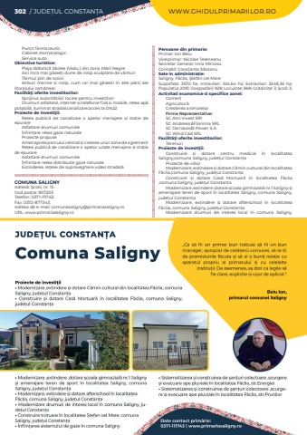 302 / JUDE%u021aUL CONSTAN%u021aA WWW.GHIDULPRIMARIILOR.ROPunct farmaceuticCabinet stomatologicService autoObiective turistice:Plaja s%u0103lbatic%u0103 S%u0103cele (Vadu ) din zona M%u0103rii NegreAici %u00eenc%u0103 mai g%u0103se%u0219ti dune de nisip sculptate de v%u00e2nturiT%u0103rmul plin de scoiciIerburi marine %u0219i nisip, cum rar mai g%u0103se%u0219ti %u00een alte p%u0103r%u021bi ale litoralului rom%u00e2nescFacilit%u00e3%u0163i oferite investitorilor:Sprijinul autorit%u0103%u021bilor locale pentru investitoriDrumuri asfaltate, internet %u0219i telefonie fix%u0103 %u0219i mobile, re%u021bea ap%u0103 potabil%u0103, iluminat stradal,canalizare,acces la DN22Proiecte de investi%u0163ii:Re%u021bea public%u0103%u00a0 de canalizare a apelor menajere %u0219i sta%u021bie de epurareAsfaltare drumuri comunale%u00cenfiin%u021bare re%u021bea gaze naturaleProiecte propuseAmenajarea parcului central %u0219i crearea unor zone de agrementRe%u021bea public%u0103%u00a0de canalizare a apelor uzate menajere %u0219i sta%u021bie de epurareAsfaltare drumuri comunale%u00cenfiin%u021bare re%u021bea distribu%u021bie gaze naturaleExtinderea re%u021belei de supraveghere video stradal%u0103COMUNA SALIGNYAdres%u0103: %u015ecolii, nr. 15Cod po%u0219tal: 907203Telefon: 0371-111743; Fax: 0372-877343; Adresa de e-mail: comunasaligny@primariasaligny.roURL: www.primariasaligny.roPersoane din primarie:Primar: Ion BeiuViceprimar: Nicolae TeleneanuSecretar General: Irina M%u00eeniosuContabil: Constan%u021ba Sibi%u0219anuSate %u00een administra%u021bie:Saligny, F%u0103clia, %u015etefan cel MareSuprafa%u021ba:%u00a0 3570 ha; Intravilan:%u00a0 324,64 ha; Extravilan:%u00a0 3248,36 ha; Popula%u021bia:%u00a02091; Gospod%u0103rii:%u00a0928; Locuin%u021be:%u00a0869; Gr%u0103dini%u021be:%u00a03; %u0218coli:%u00a03; Activitati economice si specifice zonei:Comer%u021bAgricultur%u0103Cre%u0219terea animalelorFirme Reprezentative:SC Ami Invest SRlSC Andreea &Florinna SRLSC Cernavod%u0103 Power S.ASC Wind Cad SRLFacilit%u00e3%u0163i oferite investitorilor:TerenuriProiecte de investi%u0163ii:Construire %u0219i dotare centru medical %u00een localitatea Saligny,comuna Saligny, jude%u021bul Constan%u021baProiecte de viitorModernizare ,extindere %u0219i dotare C%u0103min cultural din localitatea F%u0103clia,comuna Saligny, jude%u021bul Constan%u021baConstruire %u0219i dotare Cas%u0103%u00a0 Mortuar%u0103%u00a0 %u00een localitatea F%u0103clia ,comuna Saligny, jude%u021bul Constan%u021baModernizare ,extindere ,dotare %u0219coala gimnazial%u0103%u00a0nr.1 Saligny%u00a0%u0219i amenajare teren de sport %u00een localitatea Saligny, comuna Saligny, jude%u021bul Constan%u021baModernizare, extindere %u0219i dotare afterschool %u00een localitatea F%u0103clia, comuna Saligny, jude%u021bul Constan%u021baModernizare drumuri de interes local %u00een comuna Saligny,