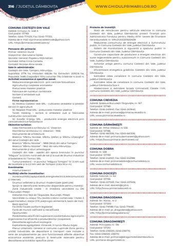 316 / JUDE%u021aUL D%u00c2MBOVI%u021aA WWW.GHIDULPRIMARIILOR.ROCOMUNA COSTE%u015eTII DIN VALEAdres%u0103: Crinului, nr. 448 ACod po%u0219tal: 137165Telefon: 0245-717025; Fax: 0245-717212; Adresa de e-mail: d.primariacostestivale@yahoo.comURL: https://primariacostestivale.ro/Persoane din primarie:Primar: Valentin Dun%u0103Viceprimar: Zoe Iuliana OpreaSecretar General: Popescu Ni%u0163%u0103 AdrianContabil: Mihai Crina CameliaContabil: Nicolae Alina IonelaSate %u00een administra%u021bie:Coste%u015ftii din Vale, Tom%u015fani, M%u0103run%u0163i%u015fuSuprafa%u021ba:%u00a0 2776 ha; Intravilan:%u00a0 682,84 ha; Extravilan:%u00a0 2093,16 ha; Popula%u021bia:%u00a03485; Gospod%u0103rii:%u00a01014; Locuin%u021be:%u00a01116; Gr%u0103dini%u021be:%u00a04; %u0218coli:%u00a04; Activitati economice si specifice zonei:Reducere energie electric%u0103 - prin centrale fotovoltaiceAgricultur%u0103 %u015fi cre%u015fterea animalelorPrelucrarea maselor plasticeFabricare de nutre%u021buri combinateSortare %u0219i ambalare ou%u0103Comer%u021bFirme reprezentative:SC Moteco Coste%u0219ti Vale SRL - cultivarea cerealelor %u0219i prest%u0103ri servicii %u00een agricultur%u0103SC Ralplast Prod SRL - prelucrarea maselor plasticeToneli Holding - sortare %u0219i ambalare ou%u0103 %u0219i fabricarea nutre%u021burilor concentrateSC Ecosfer Energy SRL - producere energie electric%u0103 prin centrale electrice fotovoltaice%u00a0Obiective turistice:Casa memorial%u0103 a scriitorului I.C. VissarionMorm%u00e2ntul scriitorului I.C. Vissarion - 1955Monumente de arhitectur%u0103:Biserica %u201cSf%u00e2ntu Nicolae, Sf%u00e2ntu %u015etefan %u015fi Sf%u00e2ntu Gheorghe%u201d din satul Coste%u015ftii din ValeBiserica %u201cSf%u00e2ntu Nicolae%u201d - 1898 (1842) din satul Tom%u015faniBiserica %u201cSf%u00e2ntu Nicolae%u201d - 1842 din satu M%u0103run%u0163i%u015fu.Monumente %u015fi situri arheologice:Coste%u015ftii din Vale - a%u015fez%u0103ri din epoca bronzului %u00een punctul %u201cM%u0103gura%u201d la 0,5 km nord-vest de sat %u015fi la sud de drumul industrial al balastierei SC Tarmac SRLTurnul preistoric - %u00een punctul %u201cM%u0103gura Tom%u015fani%u201d la 1,5 km sud de localitate %u015fi la 2,0 km vest de Tom%u015fani (cota 161,4 m)Evenimente:Hramul bisericiiFacilit%u00e3%u0163i oferite investitorilor:Acces la utilit%u0103%u0163i (ap%u0103 potabil%u0103, energie electric%u0103, telecomunica%u021bii %u0219i internet)Drumuri asfaltate %u015fi drumuri modernizate (pietruite)Sprijin la identificarea terenurilor disponibile pentru investi%u0163iiZon%u0103 industrial%u0103 creat%u0103 - %u00een imediata vecin%u0103tate cu DN 7-Bucure%u015fti-Pite%u015ftiDistan%u0163e mici fa%u0163%u0103 de T%u00e2rgovi%u015fte, Bucure%u015fti, Pite%u015ftiVecin%u0103tate cu ora%u015ful Titu (exist%u0103 4%u00a0b%u0103nci comerciale, 1 hotel, 3 supermarketuri, sta%u0163ie CFR, pia%u0163%u0103 agro-alimentar%u0103, bazin de %u00eenot)Baz%u0103 sportiv%u0103Facilit%u0103%u021bi fiscale conform legisla%u021bieiFor%u021b%u0103 de munc%u0103 calificat%u0103 %u0219i necalificat%u0103Oportunit%u0103%u021bi:Posibilitatea valorific%u0103rii superioare a poten%u021bialului agricol prin organizarea mai eficent%u0103 a produc%u0103torilor (cooperare)Dezvoltarea agriculturii ecologiceExploatarea agregatelor minerale, %u00een lunca R%u00e2ului Arge%u0219Planul Urbanistic General al comunei cuprinde Zona pentru unit%u0103%u021bi industriale, de depozitare %u0219i transport care include o serie de amplasamente pe care func%u021bioneaz%u0103 diferite obiective economice existente, precum %u0219i terenurile rezervate pentru dezvoltarea activit%u0103%u021bilor specifice zoneiProiecte de investi%u0163ii:Sta%u021bii de re%u00eenc%u0103rcare pentru vehicule electrice %u00een comuna Coste%u0219tii din Vale, judetul D%u00e2mbovi%u021ba: proiect finan%u021bat prin Administra%u021bia Fondului pentru Mediu AFM -cerere de finan%u021bare neranbursabila nr. SRIL01202231600638Reducerea consumului de energie electric%u0103%u00a0 a iluminatului public, %u00een Comuna Coste%u0219tii din Vale, jude%u021bul Dambovi%u021baSistem de monitorizare %u0219i siguran%u021b%u0103 a spa%u021biului public %u00een Comuna Coste%u0219tii din Vale, Jude%u021bul D%u00e2mbovi%u021baConstruire capacitate de producere a energiei electrice din surse regenerabile pentru autoconsum %u00een Comuna Coste%u0219tii din Vale, Jude%u021bul D%u00e2mbovi%u021baAchizi%u021bie utilaje pentru comuna Coste%u0219tii din Vale, jude%u021bul D%u00e2mbovi%u021baEficientizare energetica gr%u0103dini%u021ba Coste%u0219tii din Vale, jude%u021bul D%u00c2mbovi%u021baExtindere re%u021bea canalizare %u00een comuna Coste%u0219tii din Vale, jude%u021bul D%u00e2mbovi%u021baExtindere re%u021bea de canalizare %u00een comuna Coste%u0219tii din Vale, jude%u021bul D%u00e2mbovi%u021ba faza IIModernizare %u0219i extindere %u0218coala Gimnazial%u0103%u00a0 Clasele I-VIII, comuna Coste%u0219tii din Vale, jude%u021bul D%u00e2mbovi%u021baCOMUNA CREVEDIAAdres%u0103: %u015eoseaua Bucure%u015fti-T%u00e2rgovi%u015fte, nr. 167Cod po%u0219tal: 137180Telefon: 0245-241840; Fax: 0245-241840; Adresa de e-mail: primarie@primariacrevedia.roURL: www.primariacrevedia.roCOMUNA D%u0102RM%u0102NE%u015eTIAdres%u0103: str. Mihai Viteazul, nr 530Cod po%u0219tal: 137185Telefon: 0245-661306; Fax: 0245-661306; Adresa de e-mail: primaria.darmanesti@yahoo.comURL: https://www.primaria-darmanesti.ro/COMUNA DOBRAAdres%u0103: nr. 538Cod po%u0219tal: 137190Telefon: 0245-242001; Fax: 0245-242188; Adresa de e-mail: primariadobra@comunadobra.roURL: www.comunadobra.roCOMUNA DOICE%u015eTIAdres%u0103: Coloniei, nr. 62Cod po%u0219tal: 137195Telefon: 0245-227023; Fax: 0245-227506; Adresa de e-mail: doicesti@cjd.roURL: http://www.primariadoicesti.roCOMUNA DRAGODANAAdres%u0103: Str. Kocsa , nr 2Cod po%u0219tal: 137200Telefon: 0245-719189; Fax: 0245-719491; Adresa de e-mail: pr_dragodana@yahoo.comURL: http://primariadragodana.ro/COMUNA DRAGOMIRE%u015eTIAdres%u0103: Principala, nr. 