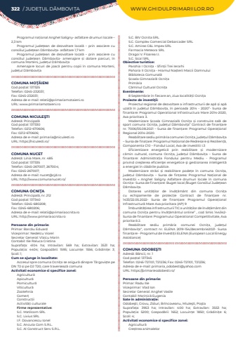 322 / JUDE%u021aUL D%u00c2MBOVI%u021aA WWW.GHIDULPRIMARIILOR.ROProgramul na%u021bional Anghel Saligny- asfaltare drumuri locale %u2013 2,3 kmProgramul jude%u021bean de dezvoltare local%u0103%u00a0 %u2013 prin asociere cu consiliul jude%u021bean D%u00e2mbovi%u021ba- asfaltare 1,7 kmProgramul jude%u021bean de dezvoltare local%u0103%u00a0 %u2013 prin asociere cu consiliul jude%u021bean D%u00e2mbovi%u021ba- amenajare %u0219i dotare parcuri, %u00een comuna Morteni, jude%u021bul D%u00e2mbovi%u021baAmenajare locuri de joac%u0103%u00a0 pentru copii %u00een comuna Morteni, jude%u021bul D%u00e2mbovi%u021baCOMUNA MO%u0162%u0102IENICod po%u0219tal: 137325Telefon: 0245-232031; Fax: 0245-232031; Adresa de e-mail: relatii@primariamotaieni.roURL: www.primariamotaieni.roCOMUNA NICULE%u015eTIAdres%u0103: Principal%u0103Cod po%u0219tal: 137330Telefon: 0212-670606; Fax: 0212-670606; Adresa de e-mail: primaria@niculesti.roURL: https://niculesti.ro/COMUNA NUCETAdres%u0103: Linia Mare, nr. 485Cod po%u0219tal: 137335Telefon: 0245-267007, 267004; Fax: 0245-267007; Adresa de e-mail: nucet@cjd.roURL: http://www.comunanucet.ro/COMUNA OCNI%u0162AAdres%u0103: Principal%u0103, nr. 212Cod po%u0219tal: 137340Telefon: 0245-680208; Fax: 0245-680206; Adresa de e-mail: relatii@primariaocnita.roURL: http://www.primariaocnita.roPersoane din primarie:Primar: Barc%u0103u EduardViceprimar: Nedelcu ViorelSecretar General: Vlaicu MarinContabil: Ilie Raluca CristinaSuprafa%u021ba:%u00a0 4104 ha; Intravilan:%u00a0 569 ha; Extravilan:%u00a0 3531 ha; Popula%u021bia:%u00a0 4404; Gospod%u0103rii:%u00a0 1595; Locuin%u021be:%u00a0 1556; Gr%u0103dini%u021be:%u00a0 3; %u0218coli:%u00a01; Cum se ajunge in localitate:Accesul spre comuna Ocni%u021ba se asigur%u0103 dinspre T%u00e2rgovi%u0219te pe DN 72 %u0219i pe DJ 720, care traverseaz%u0103 comunaActivitati economice si specifice zonei:Agricultur%u0103Apicultur%u0103Pomicultur%u0103Viticultur%u0103ZootehniaComer%u021bConstruc%u021bii Activit%u0103%u021bi culturaleFirme reprezentative:S.C. Matilcom SRLS.C. Livius SRLI.F. Dovancescu IonelS.C. Ancuta Com S.R.L.S.C. Al Construct Serv S.R.L.S.C. BIV Ocnita SRLS.C. Complex Comercial Debarcader SRLS.C. Amiras C&L Impex SRLFarmacia Meteora SRLDragoi V. Floarea I.I. S.C. Sical SRLObiective turistice:Parohia I Ocni%u021ba - Sfin%u021bii Trei IerarhiPahoria II Ocni%u021ba - Hramul Na%u0219terii Maicii DomnuluiBiblioteca Comunal%u0103%u0218coala Gimnazial%u0103 Ocni%u021baPrim%u0103ria%u00a0C%u0103minul Cultural Ocni%u021baEvenimente:8 Septembrie %u00een fiecare an, ziua localit%u0103%u021bii Ocni%u021baProiecte de investi%u0163ii:Proiectul regional de dezvoltare a infrastructurii de ap%u0103 %u0219i ap%u0103 uzat%u0103 %u00een jude%u021bul D%u00e2mbovi%u021ba, %u00een perioada 2014 - 2020%u201d- Sursa de finantare: Programul Operational Infrastructura Mare 2014-2020, Axa prioritara 3.Modernizare %u0218coala Gimnazial%u0103 Ocni%u021ba %u0219i construire sal%u0103 de sport comuna Ocni%u021ba, jude%u021bul D%u00e2mbovi%u021ba%u201d Contract de finan%u021bare nr. 7006/05.08.2021 %u2013 Sursa de finan%u021bare: Programul Opera%u021bional Regional 2014-2020.Reabilitare sediu prim%u0103ria comunei Ocni%u021ba, jude%u021bul D%u00e2mbovi%u021ba %u2013 Sursa de fina%u021bare: Programul Na%u021bional de Redresare %u0219i Rezilien%u021b%u0103, Componenta C10 %u2013 Fondul Local, Axa de investitii I.3Eficientizare energetic%u0103 prin reabilitare %u0219i modernizare c%u0103min cultural, comuna Ocni%u021ba, jude%u021bul D%u00e2mbovi%u021ba %u2013 Sursa de finantare: Administra%u021bia Fondului pentru Mediu - Programul privind cre%u015fterea eficien%u0163ei energetice %u015fi gestionarea inteligent%u0103 a energiei %u00een cl%u0103dirile publice.Modernizare str%u0103zi %u0219i reabilitare pode%u021be %u00een comuna Ocni%u021ba, jude%u021bul D%u00e2mbovi%u021ba %u2013 Sursa de fin%u021barea: Programul Na%u021bional de Investi%u021bii %u00ab Anghel Saligny Asfaltare drumuri locale %u00een comuna Ocni%u021ba- Sursa de finan%u021bare: Buget local /Buget Consiliul Jude%u021bean D%u00e2mbovi%u021ba.Dotarea unit%u0103%u021bilor de %u00eenv%u0103%u021b%u0103m%u00e2nt din comuna Ocni%u021ba cu echipamente de protec%u021bie Contract de finan%u021bare nr. 1433/22.05.2022- Sursa de finan%u021bare: Programul Opera%u021bional Infrastructur%u0103 Mare Axa prioritara (AP) 9%u00cembun%u0103t%u0103%u021birea infrastructurii TIC a unit%u0103%u021bilor de %u00eenv%u0103%u021b%u00e2m%u00e2nt din comuna Ocni%u021ba pentru %u00eenv%u0103%u021b%u0103m%u00e2ntul online%u201d , cod Smis 144342- Sursa de finantare: Programului Operational Competitivitate, Axa prioritar%u0103 2. Reabilitare sediu prim%u0103ria comunei Ocni%u021ba, jude%u021bul D%u00e2mbovi%u021ba%u201c, contract nr. ELENA 2019-154/decembrie2021- Sursa finan%u021bare - Programul de Investi%u021bii ELENA (European Local Energy Assistance)COMUNA ODOBE%u015eTIAdres%u0103: B%u0103ncii, nr. 1Cod po%u0219tal: 137345Telefon: 0245-721101, 721236; Fax: 0245-721101, 721236; Adresa de e-mail: primaria_odobesti@yahoo.comURL: https://primarieodobesti.ro/Persoane din primarie:Primar: Radu IlieViceprimar: Vlad IonSecretar General: Anghel VasileContabil: Marinic%u0103 EugeniaSate %u00een administra%u021bie:Odobe%u015fti, Crovu, Ziduri, Br%u00eencoveanu, Miule%u015fti, Po%u015ftaSuprafa%u021ba:%u00a0 3953 ha; Intravilan:%u00a0 400 ha; Extravilan:%u00a0 3553 ha; Popula%u021bia:%u00a0 5200; Gospod%u0103rii:%u00a0 1652; Locuin%u021be:%u00a0 1850; Gr%u0103dini%u021be:%u00a0 6; %u0218coli:%u00a04; Activitati economice si specifice zonei:Agricultur%u0103Cre%u0219trea animalelor