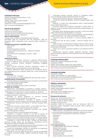 324 / JUDE%u021aUL D%u00c2MBOVI%u021aA WWW.GHIDULPRIMARIILOR.ROCOMUNA POTLOGIAdres%u0103: Constantin Br%u00e2ncoveanu, nr. 63Cod po%u0219tal: 137370Telefon: 0245-722401, 0245-722492; Fax: 0245-722492; Adresa de e-mail: primariapotlogi@yahoo.comURL: www.primariapotlogi.roPersoane din primarie:Primar: Viorel Dr%u0103ghiciViceprimar: Marian AnghelSecretar General: Gabriela Elena Buc%u015fenaru%u00a0Contabil: Elena Simona Vl%u0103sceanuSate %u00een administra%u021bie:Potlogi, Pitaru, Vl%u0103sceni, Rom%u00e2ne%u015fti, Podul CristineiSuprafa%u021ba:%u00a0 5199 ha; Intravilan:%u00a0 670 ha; Extravilan:%u00a0 4592 ha; Popula%u021bia:%u00a0 8970; Gospod%u0103rii:%u00a0 2401; Locuin%u021be:%u00a0 2694; Gr%u0103dini%u021be:%u00a0 4; %u0218coli:%u00a04; Activitati economice si specifice zonei:Agricultur%u0103Comer%u0163Extrac%u0163ie agregate minerale Industrie prelucrarea lemnului - fabric%u0103 de mobil%u0103Construc%u0163iiExtrac%u0163ie %u015fi sortare agregate minerale - balastTurismExtrac%u0163ie petrolObiective turistice:Existen%u0163a pe teritoriul comunei a palatului Br%u00e2ncovenesc construit la 1698 de c%u0103tre Constantin Br%u00e2ncoveanu, din p%u0103cate neredat circuitului turistic, apar%u0163ine Consiliului Jude%u0163ean D%u00e2mbovi%u0163aBust %u00eenchinat pictorului Nicolae Grigorescu, n%u0103scut %u00een localitatea Pitaru, sat component al comunei PotlogiBiserica Adormirea Maicii Domnului din localitatea Pitaru, care p%u0103streaz%u0103 pictura original%u0103 aflat%u0103 %u00eentr-o stare avansat%u0103 de degradareEvenimente:Ziua comunei - 15 august%u00cen fiecare zi de luni - t%u00e2rg s%u0103pt%u0103m%u00e2nal de bunuri de consumFacilit%u00e3%u0163i oferite investitorilor:Prim%u0103ria de%u0163ine %u00een proprietate terenuri care pot fi concesionate sau %u00eenchiriate la pre%u0163uri negociabileZon%u0103 industrial%u0103 creat%u0103Reduceri impozit pe teren pentru investitoriProiecte de investi%u0163ii:Restaurarea, Consolidarea %u0219i punerea %u00een valoare cultural %u2013turistic%u0103%u00a0a monumentului istoric Biserica Adormirii Maici Domului %u2013Str%u00e2mbeanu din satul Pitaru, Comuna Potlogi- %u00cen derulareReabilitare, modernizare %u0219i dotare c%u0103min cultural %u00een comuna Potlogi, sat Vl%u0103sceni -%u00cen derulare%u00cenfiin%u021bare %u0219i dotare gr%u0103dini%u021ba %u00een comuna Potlogi, Jude%u021bul%u00a0D%u00e2mbovi%u021ba, sat Rom%u0103ne%u0219ti- %u00cen derulareConsolidare, modernizare, extindere %u0219i dotare a %u0218colii gimnaziale din Comuna Potlogi, sat Rom%u00e2ne%u0219ti PNDL-%u00cen derulareModernizare drumuri de interes %u00een comuna Potlogi PNDL FinalizatConstruire locuin%u021be sociale pentru comunit%u0103%u021bile de romi, 3 module cu un nr de 21 unit%u0103%u021bi locative ANL FinalizatLocuin%u021be pentru tineri destinate %u00eenchirierii, sat Potlogi, Comuna Potlogi ANL FinalizatConstruire c%u0103min cultural Potlogi CNI FinalizatGr%u0103dini%u021ba cu program normal cu trei S%u0103li de grup%u0103%u00a0 sat Rom%u00e2ne%u0219ti, Comuna Potlogi Ministerul %u00cenv%u0103%u021bm%u00e2ntului FinalizatModernizare dumuri de inters local %u00een Comuna Potlogi, Jude%u021bul D%u00e2mbovi%u021ba (centura ocolitoare) Anghel Saligny%u00a0 %u00cen implementareGradini%u021ba cu 4 S%u0103li (3 S%u0103li de clasa + library) sat Rom%u00e2ne%u0219ti, Comuna Potlogi Ready set go-cre%u0219terea rezultatelor privind dezvoltarea timpurie a copiilor rromi FinalizatRe%u021bea integrat%u0103%u00a0wireless de de acces la internet exterior cu 50 de zone de acces la internet Buget local FinalizatLucr%u0103ri de Amenajare trotuare %u0219i elemente de asigurarea scurgerii apelor DJ711A Buget local Finalizat%u00a0Amenajare trotuare, spa%u021bii de parcare %u0219i accese la propriet%u0103%u021bi pe DJ401A, Comuna Potlogi, Jude%u021bul D%u00e2mbovi%u021ba Buget local FinalizatAmenajare gira%u021bie, trotuare, parc%u0103ri %u0219i%u00a0 scurgerea apelor, Comuna Potlogi, Jude%u021bul D%u00e2mbovi%u021ba PJDL FinalizatMemorialul Nicolae Grigorescu%u00a0 Buget local FinalizatLucr%u0103ri de construc%u021bii Stadion comunal Potlogi Buget local FinalizatDotarea cu sistem de supraveghere video a administra%u021biei locale%u00a0 PNDR 19.2 Finalizat%u00cenfiin%u021bare sistem de canalizare menajer%u0103%u00a0 %u00een satele Pitaru %u0219i Vl%u0103sceni, comuna Potlogi, jude%u021bul D%u00e2mbovi%u021ba Anghel Saligny%u00a0 %u00cen implementareExtindere re%u021bea distribu%u021bie gaze naturale %u00een comuna Potlogi, jude%u021bul D%u00e2mbovi%u021ba Anghel Saligny%u00a0 %u00cen evaluareConstruire %u0219i dotare Cre%u0219%u0103 %u00een Comuna Potlogi , sat Rom%u0103ne%u0219ti, jude%u021bul D%u00e2mbovi%u0219a %u2013 tip Cre%u0219p%u00a0Mic%u0103%u00a0PNRR %u00cen derulareConstruire piste de biciclete %u00een comuna Potlogi PNRR %u00cen derulareConstruire sal%u0103%u00a0 de sport %u0219colar%u0103%u00a0 , comuna Potlogi CNI %u00cen derulareRe%u021bea de ap%u0103%u00a0%u00een sat Rom%u00e2ne%u0219ti, Potlogi, Vl%u0103sceni, Pitaru, Podul Cristinii %u0219i canalizare sat Rom%u00e2ne%u0219ti, Potlogi, Podul Cristinii POIM %u00cen procedura de licita%u021bieCentru de zi pentru persoane v%u00e2rstnice, sat Vlasceni POR %u00cen derulareModernizare drumuri s%u0103te%u0219ti Topora%u0219i, Slamnei, Garlei, Bisericii, Zavoiului, Bisericii, Fanica Stanescu, Fdt.Calin Buget local %u00cen derulareCOMUNA PRODULE%u015eTIAdres%u0103: STR. Soseaua T%u00e2rgovi%u0219tei NR. 622Cod po%u0219tal: 137375Telefon: 0245-243643, 243641; Fax: 0245-243641; Adresa de e-mail: primaria.produlesti@yahoo.comURL: https://www.primariaprodulesti.ro/COMUNA PUCHENICod po%u0219tal: 137285Telefon: 0245-670515; Fax: 0245-670515; Adresa de e-mail: primariapucheni@yahoo.comURL: http://www.primariapucheni.ro/ORA%u0218UL PUCIOASAAdres%u0103: F%u00e2nt%u00e2nelor, nr. 7Cod po%u0219tal: 135400Telefon: 0245-606133, 606134, 232277; Fax: 0245-760484; Adresa de e-mail: info@primpuc.roURL: https://www.primpuc.roPersoa