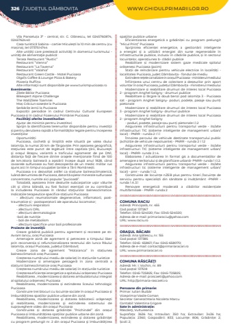 326 / JUDE%u021aUL D%u00c2MBOVI%u021aA WWW.GHIDULPRIMARIILOR.ROVila Panselu%u021ba 3* - central, str. C. Ol%u0103nescu, tel 0245760874, 0245762440Casa turistic%u0103 Sabina %u2013 cartier Micule%u0219ti la 10 min de centru (cu ma%u0219ina), tel 0737514744Alte unit%u0103%u0163i care presteaz%u0103 activit%u0103%u0163i %u00een domeniul turismului - unit%u0103%u0163i de alimenta%u0163ie public%u0103:Terasa Restaurant %u201dRustic%u201dRestaurant %u201dVienna%u201dRestaurant %u201dLa Taverna%u201dRestaurant %u201dValahia%u201dRestaurant Green Castle - Motel PucioasaOlga\\%u2019s Coffee & Lounge Pizza & BakeryPizzeria RuffinoAlte informa%u0163ii sunt disponibile pe www.turismpucioasa.roEvenimente:Zilele B%u0103ilor PucioasaBikexpert Alpine ChallengeThe WallZilele ToamneiMo%u0219 Cr%u0103ciun sose%u0219te la PucioasaSerb%u0103rile iernii la Pucioasa Expozi%u021bii periodice %u00een cadrul Centrului Cultural European Pucioasa %u0219i %u00een cadrul Foaierului Prim%u0103riei PucioasaFacilit%u00e3%u0163i oferite investitorilor:Ajutor de minimis pentru investitoriSprijin la identificarea terenurilor disponibile pentru investi%u0163ii %u0219i pentru derularea rapid%u0103 a formalit%u0103%u0163ilor legale pentru %u00eenceperea investi%u0163iilorOportunit%u0103%u021biPucioasa, cochet%u0103 %u015fi lini%u015ftit%u0103 este situat%u0103 pe valea r%u00e2ului Ialomi%u0163a, la numai 20 km de T%u00e2rgovi%u0219te. Prin a%u015fezarea geografic%u0103, sta%u0163iunea este punct de leg%u0103tur%u0103 %u00eentre capitala %u0163%u0103rii, Bucure%u015fti %u015fi ora%u015ful Bra%u015fov, variant%u0103 a traficului aglomerat de pe DN1, distan%u0163a fa%u0163%u0103 de fiecare dintre ora%u015fele men%u0163ionate fiind de 100 de km.Istoria balnear%u0103 a a%u015fez%u0103rii %u00eencepe dup%u0103 anul 1828, c%u00e2nd izvoarele sulfuroase au fost descoperite de un medic militar rus ajuns aici %u00een timpul ocupa%u021biei %u021bariste a %u021a%u0103rii Rom%u00e2ne%u0219ti.Pucioasa%u00a0 s-a dezvoltat astfel ca sta%u021biune balneoclimateric%u0103, lu%u00e2nd denumirea de Pucioasa, datorit%u0103 apelor minerale sulfuroase concentrate, numite aici popular %u201dpucioas%u0103%u201d.Totodat%u0103, a%u015fezarea %u00eentre dealurile subcarpatice u%u015for v%u0103lurite c%u00e2t %u015fi clima bl%u00e2nd%u0103, au fost factori esen%u0163iali ce au contribuit la includerea Pucioasei %u00een r%u00e2ndul sta%u0163iunilor balneoclimatice.Indica%u021biile terapeutice specifice sta%u021biunii Pucioasa:- afec%u021biuni reumatismale degenerative, inflamatorii, posttraumatice %u0219i - postoperatorii ale aparatului locomotor;- afec%u021biuni respiratorii- afectiuni ORL- afec%u021biuni dermatologice%u00a0-boli de nutri%u021bie- boli de metabolism- afec%u021biuni specifice unor boli profesionaleProiecte de investi%u0163ii:Creare gr%u0103din%u0103%u00a0 public%u0103%u00a0 pentru agrement %u0219i recreere pe str. Avram Iancu, ora%u0219%u00a0PucioasaAmenajare zon%u0103%u00a0 de agrement %u0219i petrecere a timpului liber prin reconversia %u0219i refunctionalizarea terenului din lunca R%u00e2ului Ialomi%u021ba, ora%u0219ul Pucioasa, jude%u021bul D%u00e2mbovi%u021bCreare zona de agrement %u201dMotaianca%u201d %u00een sta%u021biunea balneoclimatic%u0103 ora%u0219 PucioasaCre%u0219terea num%u0103rului mediu de salaria%u021bi %u00een sta%u021biunile turisticeModernizare %u0219i amenajare peisager%u0103 %u00een zona central%u0103 a sta%u021biunii balneoclimatice ora%u0219 PucioasaCre%u0219terea num%u0103rului mediu de salaria%u021bi %u00een sta%u021biunile turisticeCre%u0219terea eficien%u021bei energetice a spitalului or%u0103%u0219enesc PucioasaReabilitarea , modernizarea %u0219i dotarea ambulatoriului integrat al spitalului or%u0103%u0219enesc PucioasaReabilitarea, modernizarea %u0219i extinderea liceului tehnologic PucioasaConstruire trei blocuri cu locuin%u021be sociale %u00een ora%u0219ul Pucioasa %u0219i %u00eembun%u0103t%u0103%u021birea spa%u021biilor publice urbane din zon%u0103Reabilitarea, modernizarea %u015fi dotarea bibliotecii or%u0103%u015fene%u015fti %u015fi reabilitarea, modernizarea %u015fi extinderea sistemului de supraveghere video din ora%u015ful PucioasaConstruirea %u0219i dotarea gr%u0103dini%u021bei %u201dPrichindel%u201d din ora%u0219ul Pucioasa %u0219i %u00eembun%u0103t%u0103%u021birea spa%u021biilor publice urbane din zon%u0103Reabilitarea, modernizarea, extinderea %u015fi dotarea gr%u0103dini%u0163ei cu program prelungit nr. 2 din ora%u015ful Pucioasa %u015fi %u00eembun%u0103t%u0103%u0163irea spa%u0163iilor publice urbaneEficientizarea energetic%u0103 a gr%u0103dini%u021bei cu program prelungit %u201dMicul Prin%u021b%u201d PucioasaSprijinirea eficien%u021bei energetice, a gestion%u0103rii inteligente a energiei %u0219i a utiliz%u0103rii energiei din surse regenerabile %u00een infrastructurile publice, inclusiv %u00een cl%u0103dirile publice, %u0219i %u00een sectorul locuin%u021belor, opera%u021biunea b- cl%u0103diri publiceReabilitare %u0219i modernizare sistem gaze medicale spitalul or%u0103%u0219enesc Pucioasa (poim)Sta%u021bii de re%u00eenc%u0103rcare pentru vehicule electrice %u00een localit%u0103%u021bi - localitatea Pucioasa, jude%u021b D%u00e2mbovi%u021ba - fondul de mediuExtindere re%u021bele canalizare in ora%u0219ul Pucioasa - ministerul mediului%u00cenfiin%u021barea unui centru de colectare a de%u0219eurilor prin aport voluntar %u00een ora%u0219 Pucioasa, jude%u021bul D%u00e2mbovi%u021ba - ministerul mediuluiModernizare %u0219i reabilitare drumuri de interes local Pucioasa 2 - program Anghel Saligny - drumuri publiceReabilitare %u0219i l%u0103rgire la dou%u0103 benzi pod ialomi%u021ba 3 - Pucioasa sat - program Anghel Saligny- poduri, pode%u021be, pasaje sau pun%u021bi pietonaleModernizare %u0219i reabilitare drumuri de interes local Pucioasa 3 - program Anghel Saligny- drumuri publiceModernizare %u0219i reabilitare drumuri de interes local Pucioasa 2 - program Anghel Saligny- poduri, pode%u021be, pasaje sa