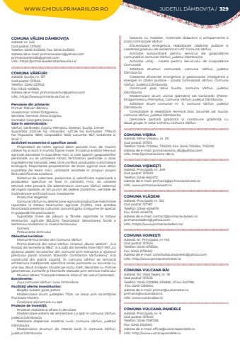 WWW.GHIDULPRIMARIILOR.RO JUDE%u021aUL D%u00c2MBOVI%u021aA / 329COMUNA V%u0102LENI D%u00c2MBOVI%u0162AAdres%u0103: nr. 543Cod po%u0219tal: 137500Telefon: 0245-243320; Fax: 0245-243320; Adresa de e-mail: primariavaleni@yahoo.comprimariavalenidb@gmail.comURL: https://primariavalenidambovita.ro/COMUNA V%u00c2RFURIAdres%u0103: %u015euvi%u0163a, nr. 137Cod po%u0219tal: 137505Telefon: 0245-233102; Fax: 0345-401826; Adresa de e-mail: primariavarfuri@yahoo.comURL: https://www.primaria-varfuri.roPersoane din primarie:Primar:%u00a0R%u0103zvan B%u0103naruViceprimar: Viorel Dr%u0103goescuSecretar General: Alina GogioiuContabil: Georgeta StoicaSate %u00een administra%u021bie:V%u00e2rfuri, C%u00e2rl%u0103ne%u015fti, Cojoiu, Meri%u015foru, State%u015fti, %u015euvi%u0163a, UlmetSuprafa%u021ba:%u00a0 2221,46 ha; Intravilan:%u00a0 427,36 ha; Extravilan:%u00a0 1794,10 ha; Popula%u021bia:%u00a0 1800; Gospod%u0103rii:%u00a0 1603; Locuin%u021be:%u00a0 967; Gr%u0103dini%u021be:%u00a0 2; %u0218coli:%u00a01; Activitati economice si specifice zonei:Proprietarii de teren agricol de%u021bin parcele mici, de maxim c%u00e2teva ha, %u0219i sunt %u00een num%u0103r foarte mare. %u00cen cadrul acestor terenuri agricole parcelate %u00een suprafe%u021be mici, %u0219i care apar%u021bin gospod%u0103riilor personale, nu se utilizeaz%u0103%u00a0 nitra%u021bi, fertilizatori, pesticide, ci doar %u00eengr%u0103%u0219%u0103minte naturale, ceea ce le confer%u0103%u00a0produselor o etichetare ecologic%u0103. Majoritatea proprietarilor de teren agricol care de%u021bin suprafe%u021be de teren mici, utilizeaz%u0103%u00a0 recoltele %u00een scopuri proprii f%u0103r%u0103%u00a0valorificarea acestoraSistemul de colectare, prelucrare %u0219i valorificare superioar%u0103%u00a0 a produselor specifice se face %u00een cantit%u0103%u021bi mici, iar utilarea tehnic%u0103%u00a0 este precar%u0103. De asemenea,%u00een comuna V%u00e2rfuri sistemul de irigatii lipse%u0219te, iar din punct de vedere zootehnic, centrele de %u00eens%u0103m%u00e2n%u021bare artificial%u0103%u00a0sunt inexistenteProductie VegetalaComuna V%u00e2rfuri nu de%u021bine zone agricole productive %u00eensemnate raportate la totalul terenurilor agricole (11,29%), %u00eens%u0103%u00a0 acestea favorizeaz%u0103%u00a0prezen%u021ba culturilor: porumb,gr%u00e2u %u0219i legume (%u00een special %u00een gospod%u0103riile particulare)Suprafa%u0163a mare de p%u0103%u0219uni %u0219i f%u00e2ne%u021be raportate la totalul terenurilor agricole (82,02%) favorizeaz%u0103%u00a0 dezvoltarea facil%u0103%u00a0 a sectorului zootehnic la nivelul teritoriuluiComer%u0163Prelucrarea lemnuluiObiective turistice:Monumentul eroilor din Comuna V%u00e2rfuriPrima biseric%u0103 din satul V%u00e2rfuri. Hramul %u201eBuna Vestire%u201d. %u201eS-a fondat din temelie la 1862%u201d. S-a zidit din temelie %u00eentre 1907-1911 %u201ecu ajutorul ob%u015ftei locuitorilor din comun%u0103 prin st%u0103ruin%u0163a %u015fi ajutorul preotului paroh Iconom Stavrofor Constantin V%u00e2rfureanu%u201d. Era construit%u0103 din piatr%u0103 cioplit%u0103. %u00cen comuna V%u00e2rfuri se remarc%u0103 arhitectura tradi%u0163ional%u0103, specific%u0103 zonei pomicole cu locuin%u0163e cu una sau dou%u0103 %u00eenc%u0103peri, situate pe soclu %u00eenalt, decorate cu motive geometrice, avimorfe %u015fi fitomorfe realizate prin tehnica traforuluiMuzeul s%u0103tesc %u201cCasa p%u0103rinteasc%u0103. Altarul%u201d din satul Carlane%u0219tiEvenimente:Ziua comunei V%u00e2rfuri- luna OctombrieFacilit%u00e3%u0163i oferite investitorilor:Bog%u0103%u0163ii subsol: gaze, petrolModernizare drum jude%u0163ean 710A, ce trece prin localit%u0103%u0163iile Pucioasa-Moreni.Finalizare alimentare cu ap%u0103Proiecte de investi%u0163ii:Proiecte realizate %u0219i aflate %u00een derulareModernizare sistem de alimentare cu ap%u0103%u00a0%u00een comuna V%u00e2rfuri, jude%u021bul D%u00e2mbovi%u021baRealizare dispensar medical rural, comuna V%u00e2rfuri, jude%u021bul D%u00e2mbovi%u021baModernizare drumuri de interes local %u00een comuna V%u00e2rfuri, jude%u021bul D%u00e2mbovi%u021baDotarea cu mobilier, materiale didactice %u0219i echipamente a %u0219colii Gimnaziale V%u00e2rfuriEficientizare energetic%u0103, reabilitarea cl%u0103dirilor publice %u0219i cre%u0219terea gradului de rezilienta al UAT Comuna V%u00e2rfuriAchizi%u021bie autoutilitar%u0103%u00a0 pentru serviciul de gospod%u0103rire comunal%u0103%u00a0al comunei V%u00e2rfuri, jude%u021bul D%u00e2mbovi%u021baAchizi%u021bie utilaj - nacela pentru Serviciului de Gospod%u0103rire Comunal%u0103Asfaltare drumuri comunale, comuna V%u00e2rfuri, jude%u021bul D%u00e2mbovi%u021baCre%u0219terea eficien%u021bei energetice %u0219i gestionarea inteligent%u0103%u00a0 a energiei %u00een cl%u0103diri publice - %u0219coala Gimnazial%u0103%u00a0 V%u00e2rfuri, Comuna V%u00e2rfuri, Jude%u021bul D%u00e2mbovi%u021baConstruire pod, satul Suvita, comuna V%u00e2rfuri, jude%u021bul D%u00e2mbovi%u021baModernizare drum vicinal (p%u0103m%u00e2nt) sat Carlane%u0219ti (PietreDragomirescu-Pompiliu), Comuna V%u00e2rfuri, jude%u021bul D%u00e2mbovi%u021baAsfaltare drum comunal nr. 5, comuna V%u00e2rfuri, jude%u021bul D%u00e2mbovi%u021baConsolidare %u0219i reabilitare termic%u0103%u00a0 bloc locuin%u021be sat Suvita, comuna V%u00e2rfuri, jude%u021bul D%u00e2mbovi%u021baDemolare par%u021bial%u0103%u00a0 gr%u0103dini%u021b%u0103 %u0219i construire gr%u0103dini%u021b%u0103%u00a0 cu dou%u0103%u00a0grupe, %u00een satul Ulmetu, comuna V%u00e2rfuriCOMUNA VI%u015eINAAdres%u0103: Mihai Viteazu, nr. 29Cod po%u0219tal: 137515Telefon: 0245-725064, 725200; Fax: 0245-725064, 725200; Adresa de e-mail: primariavisina_db@yahoo.comURL: http://primariavisina-db.roCOMUNA VI%u015eINE%u015eTIAdres%u0103: Principal%u0103, nr. 249Cod po%u0219tal: 137520Telefon: 0245-662472; Adresa de e-mail: primaria@primariavisinesti.roURL: www.primariavisinesti.roCOMUNA VL%u0102DENIAdres%u0103: Principal%u0103, nr. 152Cod po%u0219tal: 137187Telefon: 0345-404679; Fax: 0345-404679; Adresa d