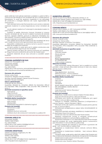 332 / JUDE%u021aUL DOLJ WWW.GHIDULPRIMARIILOR.ROpeste 4000 de metri p%u0103tra%u021bi. Estim%u0103m o sc%u0103dere cu p%u00e2n%u0103 la 95% a consumului de energie al UAT Am%u0103r%u0103%u0219tii de Jos cu aceste panouri fotovoltaice. %u00cen acest fel, sprijinim investi%u021biile %u00een noi tehnologii de producere a energiei electrice din surse regenerabile de autoconsum.Vom extinde Centrul de Permanen%u021b%u0103 %u0219i vom construi cabinete medicale moderne %u00een curtea Dispensarului Uman Am%u0103r%u0103%u0219tii de Jos Un alt cabinet medical va fi amenajat la standarde modern %u00een satul OcolnaInvestim %u00een sediile C%u0103minului Cultural, Prim%u0103riei %u0219i Liceului Teoretic Am%u0103r%u0103%u0219tii de Jos. Se are %u00een vedere montarea de centrale termice, vopsirea cl%u0103dirilor, precum %u0219i refacerea instala%u021biilor sau alte repara%u021bii. Tot pentru sediile acestor institu%u021bii, se vor achizi%u021biona diverse materiale %u0219i echipamente specificVom asfalta drumurile de interes local din Am%u0103r%u0103%u0219tii de Jos %u0219i vom moderniza drumurile Agricole de pe raza comunei.Dezvolt%u0103m colaborarea cu sectorul privat %u0219i punem la punct strategii de atragere de investitoriUn prim proiect %u00een acest sens are %u00een vedere construirea unei fabrici de procesare legume pe raza localit%u0103%u021biiTerenul sintetic de sport din centrul Comunei va fi reabilitat, iar T%u00e2rgul Comunal va beneficia de lucr%u0103ri de modernizareSprijinim bisericile de pe raza comunei %u0219i acord%u0103m sprijin financiarCOMUNA AM%u0102R%u0102%u015eTII DE SUSAdres%u0103: Str. Principal%u0103, nr. 93Cod po%u0219tal: 207025Telefon: 0251-375311; Fax: 0251-375311; Adresa de e-mail: primaria_amarastiidesus@yahoo.comURL: http://www.comunaamarastiidesus.ro/Persoane din primarie:Primar: Iulian Du%u021b%u0103Viceprimar: Bogdan Claudiu Mih%u0103i%u021b%u0103Secretar General Delegat: Gabriel Cornel TomescuContabil: T%u0103nasie GheorgheSate %u00een administra%u021bie:Am%u0103r%u0103%u0219tii de Sus, ZvorscaSuprafa%u021ba:%u00a0 3640,25 ha; Intravilan:%u00a0 325,84 ha; Extravilan:%u00a0 3314,41 ha; Popula%u021bia:%u00a0 1780; Gospod%u0103rii:%u00a0 728; Locuin%u021be:%u00a0 780; Gr%u0103dini%u021be:%u00a0 2; %u0218coli:%u00a02; Activitati economice si specifice zonei:Agricultur%u0103Legumicultur%u0103Cre%u0219terea animalelorComer%u021b cu am%u0103nuntul%u00a0Facilit%u00e3%u0163i oferite investitorilor:Taxe %u0219i impozite mai miciAp%u0103 curent%u0103Oportunit%u0103%u021bi:Posibilitatea dezvolt%u0103rii %u00een domeniul agricolProiecte de investi%u0163ii:Alimentare cu ap%u0103CanalizareAsfaltare drumuri comunaleAsfaltare drum de conexiune %u00een extravilan cu jude%u021bul OltCOMUNA APELE VIICod po%u0219tal: 207030Telefon: 0251-371607; Fax: 0251-371607; Adresa de e-mail: apele.vii.dolj@gmail.comURL: http://primaria-apelevii.ro/COMUNA ARGETOAIAAdres%u0103: Constantin Argetoianu Nr. 186Cod po%u0219tal: 207035Telefon: 0251-452701; Fax: 0251-452889 ; Adresa de e-mail: office@primaria-argetoaia.roURL: http://primaria-argetoaia.ro/MUNICIPIUL B%u0102ILE%u015eTIAdres%u0103: strada Printul Barbu Alexandru Stirbey nr. 13Cod po%u0219tal: 205100; Telefon: 0251-311017; Fax: 0251-311956; Adresa de e-mail: office@primariabailesti.roURL: https://www.primariabailesti.ro/COMUNA B%u00c2RCAAdres%u0103: Mihai Viteazu, nr. 257; Cod po%u0219tal: 207055Telefon: 0251-356214; Fax: 0251-356116; Adresa de e-mail: primaria.barca@yahoo.ro, barca@dj.e-adm.roURL: www.primariacomuneibirca.roPersoane din primarie:Primar: Cristinel Urtil%u0103%u00a0Viceprimar: Marius%u00a0Vil%u0103u%u00a0Secretar General: Jr.Dumitru Turculeanu%u00a0Suprafa%u021ba:%u00a0 8825,40ha; Intravilan:%u00a0 383,60 ha; Extravilan:%u00a0 8441,80 ha; Popula%u021bia:%u00a04172; Gospod%u0103rii:%u00a01574; Locuin%u021be:%u00a01760; Gr%u0103dini%u021be:%u00a02; %u0218coli:%u00a01; Licee:%u00a01; Activitati economice si specifice zonei:Agricultur%u0103Cultivare cerealePlante tehniceZootehnieComer%u0163Firme reprezentative:SC OANADRI SRL TURCULEANU AGRICOLObiective turistice:Casa memorial%u0103 %u201cAdrian P%u0103unescu%u201d (aici a copil%u0103rit %u015fi a urmat primele 4 clase primare, B%u00eerca este comuna %u00een care s-au n%u0103scut p%u0103rin%u0163ii, bunicii, str%u0103bunicii)Evenimente:T%u00e2rg s%u0103pt%u0103m%u00e2nal - duminicaSf%u00e2ntul Dumitru - Hramul bisericiiExpozi%u0163ie picturi naive - Ghi%u0163%u0103 Mitr%u0103chi%u0163%u0103Facilit%u00e3%u0163i oferite investitorilor:CroitorieAgricultur%u0103Cism%u0103rieT%u00e2mpl%u0103rie%u015eosea rapid%u0103 Craiova-B%u00eerca, 40km/h %u00een 30 minuteDN c%u0103tre B%u0103ile%u015fti, Calafat, BechetOportunit%u0103%u021bi:Cas%u0103 Memorial%u0103 %u201cAdrian P%u0103unescu%u201dParcul comunalProiecte de investi%u0163ii:Reabilitare, modernizare %u0219i dotare Cl%u0103dire Prim%u0103ria B%u00e2rcaSta%u0163ii de re%u00eenc%u0103rcare pentru vehicule electrice%u00cenfiin%u021barea unui centru de colectare a de%u0219eurilor prin aport voluntar %u00een Comuna B%u00e2rca jude%u021bul DoljDotarea cu mobilier, materiale didactice %u0219i echipamente a Liceului Teoretic ,,Adrian P%u0103unescu%u201d B%u00e2rca%u00cenfiin%u021bare centru de zi pentru consiliere %u0219i sprijin pentru p%u0103rin%u021bi %u0219i copii, %u00een comuna B%u00e2rcaAchizi%u021bionare echipamente %u0219i dotari SVSU ECHIPAMENTE SI DOTARI SVSUDesfin%u021bare par%u021bial%u0103, extindere, reabilitare %u0219i modernizare Corp C1, desfiin%u021bare Corp C2%u00a0%u0219i Corp C3Construire corp nou sal%u0103 de educa%u021bie fizic%u0103 %u0219colar%u0103Realizare %u00eemprejmuire incinta %u0219i echipare infrastructur%u0103 educa%u021bional%u0103, %u0219coala nr.2, comuna B%u00e2rca, jude%u021bul DoljSprijinirea investi%u021biilor %u00een noi capacit%u0103%u021bi de producerea energiei electrice produse din surse regenerabile pentru autoconsum parc fotovoltaic %u00een comuna B%u00e2rca, jude%u021bul DoljSisteme integra