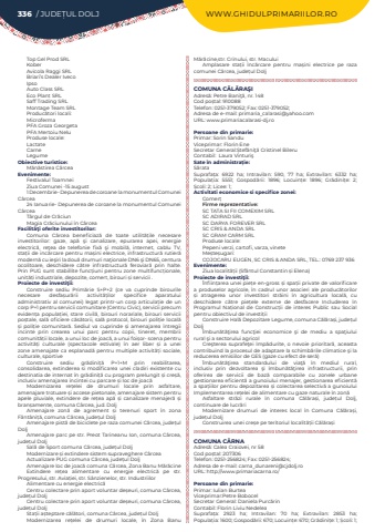 336 / JUDE%u021aUL DOLJ WWW.GHIDULPRIMARIILOR.ROTop Gel Prod SRLKoberAvicola Raggi SRLBriari%u2019s Dealer IvecoIpso Auto Class SRLEco Plant SRLSaff Trading SRLMontage Team SRLProduc%u0103tori locali:MicrofermaPFA Groza GeorgetaPFA Mertoiu NeluProduse locale:LactateCarne LegumeObiective turistice:M%u0103n%u0103stirea C%u00e2rceaEvenimente:Festivalul ToamneiZiua Comunei -15 august1 Decembrie- Depunerea de coroane la monumentul Comunei C%u00e2rcea24 Ianuarie- Depunerea de coroane la monumentul Comunei C%u00e2rceaT%u00e2rgul de Cr%u0103ciunMagia Cr%u0103ciunului %u00een C%u00e2rceaFacilit%u00e3%u0163i oferite investitorilor:Comuna C%u00e2rcea beneficiaz%u0103 de toate utilit%u0103%u021bile necesare investitorilor: gaze, ap%u0103 %u015fi canalizare, epurarea apei, energie electric%u0103, re%u0163ea de telefonie fix%u0103 %u015fi mobil%u0103, internet, cablu TV, sta%u021bii de inc%u0103rcare pentru ma%u0219ini electrice, infrastructur%u0103 rutier%u0103 modern%u0103 cu ie%u015firi la dou%u0103 drumuri na%u0163ionale DN6 %u015fi DN65, centura ocolitoare, deschidere c%u0103tre infrastructur%u0103 feroviar%u0103 prin halte. Prin PUG sunt stabillite func%u021biuni pentru zone multifunc%u021bionale, unit%u0103%u021bi industriale, depozite, comert, birouri %u0219i servicii .Proiecte de investi%u0163ii:Construire sediu Prim%u0103rie S+P+2 (ce va cuprinde birourile necesare desfa%u0219ur%u0103rii activit%u0103%u021bilor specifice aparatului administrativ al comunei) legat printr-un corp articula%u021bie de un corp P+1 pentru servicii comunitare (Centru Civic), servicii precum eviden%u021ba popula%u021biei, stare civil%u0103, birouri norariale, birouri servicii po%u0219tale, sal%u0103 oficiere c%u0103s%u0103torii, sal%u0103 protocol, birouri poli%u021bie local%u0103 %u0219i poli%u021bie comunitar%u0103. Sediul va cuprinde %u0219i amenajarea %u00eentregii incinte prin crearea unui parc pentru copii, tineret, membrii comunit%u0103%u021bii locale, a unui loc de joac%u0103, a unui foi%u0219or- scena pentru activit%u0103%u021bi culturale (spectacole estivale) %u00een aer liber %u0219i a unei zone amenajate ca esplanad%u0103 pentru multiple activit%u0103%u021bi sociale, culturale, sportiveConstruire sediu gr%u0103dini%u021b%u0103 P+1+M prin reabilitarea, consolidarea, extinderea si modificarea unei cladiri existente cu destinatia de internat %u00een gr%u0103dini%u021b%u0103 cu program prelungit %u0219i cre%u0219%u0103, inclusiv amenajarea incintei cu parcare %u0219i loc de joac%u0103Modernizarea re%u021belei de drumuri locale prin asfaltare, amenajare trotuare %u0219i accese pietonale, amenajare sistem pentru apele pluviale, extindere de re%u021bea ap%u0103 %u0219i canalizare menajer%u0103 %u0219i bran%u0219amente, comuna C%u00e2rcea, jud. DoljAmenajare zon%u0103 de agrement %u0219i terenuri sport %u00een zona F%u00e2nt%u00e2ni%u021b%u0103, comuna C%u00e2rcea, jude%u021bul DoljAmenajare pist%u0103 de biciclete pe raza comunei C%u00e2rcea, jude%u021bul DoljAmenajare parc pe str. Preot Tarineanu Ion, comuna C%u00e2rcea, jude%u021bul DoljSal%u0103 de Sport comuna C%u00e2rcea, jude%u021bul DoljModernizare %u0219i extindere sistem supraveghere C%u00e2rceaActualizare PUG comuna C%u00e2rcea, jude%u021bul DoljAmenajare loc de joac%u0103 comuna C%u00e2rcea, Zona Banu M%u0103r%u0103cineExtindere re%u021bea alimentare cu energie electric%u0103 pe str. Progresului, str. Avia%u021biei, str. S%u00e2nzienelor, str. IndustriilorAlimentare cu energie electric%u0103Centru colectare prin aport voluntar de%u0219euri, comuna C%u00e2rcea, jude%u021bul DoljCentru colectare prin aport voluntar de%u0219euri, comuna C%u00e2rcea, jude%u021bul DoljSta%u021bii a%u0219teptare c%u0103l%u0103tori, comuna C%u00e2rcea, jude%u021bul DoljModernizarea re%u021belei de drumuri locale, %u00een Zona Banu M%u0103r%u0103cine,str. Crinului, str. MaculuiAmplasare sta%u021bii %u00eenc%u0103rcare pentru ma%u0219ini electrice pe raza comunei C%u00e2rcea, jude%u021bul DoljCOMUNA C%u0102L%u0102RA%u015eIAdres%u0103: Petre Bani%u0163%u0103, nr. 148Cod po%u0219tal: 910088Telefon: 0251-379052; Fax: 0251-379052; Adresa de e-mail: primaria_calarasi@yahoo.comURL: www.primariacalarasi-dj.roPersoane din primarie:Primar: Sorin Sandu%u00a0Viceprimar:%u00a0Florin EneSecretar General:%u0218tef%u0103ni%u0163%u0103%u00a0Cristinel Bileru%u00a0Contabil: %u00a0Laura Vinturi%u015f%u00a0Sate %u00een administra%u021bie:S%u0103rataSuprafa%u021ba:%u00a0 6922 ha; Intravilan:%u00a0 590, 77 ha; Extravilan:%u00a0 6332 ha; Popula%u021bia:%u00a0 5551; Gospod%u0103rii:%u00a0 1896; Locuin%u021be:%u00a0 1896; Gr%u0103dini%u021be:%u00a0 2; %u0218coli:%u00a02; Licee:%u00a01; Activitati economice si specifice zonei:Comer%u021bFirme reprezentative:SC TATA SI FII COMEXIM SRLSC ADIRAD SRLSC DARYA FOREVER SRLSC CRIS & ANDA SRLSC GRAM CARM SRLProduse locale: Pepeni verzi, cartofi, varza, vineteMe%u0219te%u0219ugari: COJOCARU EUGEN, SC CRIS & ANDA SRL, TEL.: 0769 237 936Evenimente:Ziua localit%u0103%u021bii (Sf%u00e2ntul Constantin %u0219i Elena)Proiecte de investi%u0163ii:%u00cenfiin%u021barea unei pie%u021be en-gross %u0219i spa%u021bii private de valorificare a produselor agricole, %u00een cadrul unor asocieri ale produc%u0103torilor %u0219i atragerea unor investitori str%u0103ini %u00een agricultura local%u0103, cu deschidere c%u0103tre pie%u021bele externe de desfacere Includerea %u00een Programul Na%u021bional de Construc%u021bii de interes Public sau Social pentru obiectivul de investi%u021biiConstruire Hal%u0103 Depozitare Legume, comuna C%u0103l%u0103ra%u0219i, jude%u021bul Dolj%u00cembun%u0103t%u0103%u0163irea func%u0163iei economice %u015fi de mediu a spa%u0163iului rural %u015fi a sectorului agricolCre%u015fterea suprafe%u0163ei %u00eemp%u0103durite, o nevoie prioritar%u0103, aceasta contribuind la procesul de adaptare la schimb%u0103rile climatice %u015fi la reducerea emisiilor de GES (gaze cu efect de ser%u0103)%u00cembun%u0103t%u0103%u0163irea standardului de via%u0163%u0103 %u00ee
