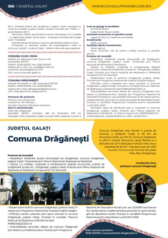 356 / JUDE%u021aUL GALA%u021aI WWW.GHIDULPRIMARIILOR.RO85 % xtindere sistem de canalizare a apelor uzate menajere %u00een comuna Cudalbi, jude%u021bul Gala%u0163i- proiect finan%u021bat prin PNDL II - grad realizare 90 %Renovare cl%u0103dire apar%u021bin%u00e2nd Liceului Tehnologic Nr.1 Cudalbi %u2013 cu destina%u021bia atelier de brut%u0103rie - investi%u021bie finan%u021bat%u0103%u00a0din buget local %u2013Finalizat%u0103Decolmatarea afluentului Valcica apar%u021bin%u00e2nd p%u00e2r%u00e2ului GeruProiectare %u0219i execu%u021bie sistem de supraveghere video %u00een comuna Cudalbi , Jude%u021bul Gala%u021bi - Sistem video de supraveghereCOMUNA CUZA VOD%u0102Adres%u0103: str. Alexandru Ioan Cuza, nr.76Cod po%u0219tal: 807271Telefon: 0236-823531; Fax: 0336-802247; Adresa de e-mail: uza_voda@gl.e-adm.roprimariacuzavoda@yahoo.comURL: www.cuzavoda-galati.roCOMUNA DR%u0102G%u0102NE%u015eTIAdres%u0103: Principal%u0103, nr. 196; Cod po%u0219tal: 807110Telefon: 0236-820130; Fax: 0236-820130; Adresa de e-mail: pdraganesti@yahoo.comURL: https://primaria-draganesti.roPersoane din primarie:Primar: Liviu CondracheViceprimar: Ilie P%u0103tra%u015fcuSecretar General: Gheorghe CojocariuSate %u00een administra%u021bie:Malu Alb, Dr%u0103g%u0103ne%u015ftiSuprafa%u021ba:%u00a0 6613ha; Intravilan:%u00a0 482 ha; Extravilan:%u00a0 6131 ha; Popula%u021bia:%u00a06710; Gospod%u0103rii:%u00a02283; Locuin%u021be:%u00a01920; Gr%u0103dini%u021be:%u00a02; %u0218coli:%u00a02; Cum se ajunge in localitate:Pe DN 25-Rutier Calea ferat%u0103 Tecuci-Gala%u021biActivitati economice si specifice zonei:Legumicultura %u0219i cre%u0219terea animalelorEvenimente:Zilele comuneiFacilit%u00e3%u0163i oferite investitorilor:Teren agricolTeren intravilan DN 25 pentru unit%u0103%u0163i turistice %u015fi prest%u0103ri serviciiProiecte de investi%u0163ii:Reabilitare Moderat%u0103 %u0218coala Gimnazial%u0103 sat Dr%u0103g%u0103ne%u0219ti, comuna Dr%u0103g%u0103ne%u0219ti, jude%u021bul Gala%u021bi%u2019%u2019 finanan%u021bat prin Planul Na%u021bional de Redresare %u0219i Rezilien%u021b%u0103Dotare cu mobilier, materiale %u0219i echipamente digitale structurilor unit%u0103%u021bii de %u00eenv%u0103%u021b%u0103m%u00e2nt %u0218coala Nr. 1 Dr%u0103g%u0103ne%u0219ti, jude%u021bul Gala%u021bi, finan%u021bat prin Planul Na%u021bional de Redresare %u0219i Rezilien%u021b%u0103 Componenta C15,-EducatieModernizare str%u0103zi %u00een comuna Dr%u0103g%u0103ne%u0219ti ,jude%u021bul Gala%u021bi, finan%u021bat prin Programul Na%u021bional de investi%u021bii Anghel Saligny%u00cenfiin%u021bare centru colectare prin aport voluntar %u00een comuna Dr%u0103g%u0103ne%u0219ti, jude%u021bul Gala%u021bi,%u00a0finan%u021bat %u00een condi%u021biie Planului Na%u021bional de Redresare %u0219i Rezilien%u021b%u0103 Apel PNRR/2022/C3/S/I.1.A%u00cembun%u0103t%u0103%u021birea serviciilor oferite de comuna Dr%u0103g%u0103ne%u0219ti prin dotare cu buldoexcavator, finan%u021bat prin Programul Na%u021bional de Dezvoltare Rural%u0103%u00a0prin axa LEADER submasura 19.2. Sprijin pentru implementarea ac%u021biunilor %u00een cadrul strategiei de dezvoltare local%u0103.finan%u021bat %u00een condi%u021biile Programului Na%u021bional pentru dezvoltarea rural%u0103 2014-2020Extindere re%u021bea de distribu%u021bie ap%u0103%u00a0 %u0219i canalizare %u00een comuna Dr%u0103g%u0103ne%u0219ti, jude%u021bul Gala%u021bi, finantat prin Planul Na%u021bional de Redresare %u0219i Rezilien%u021b%u0103 , %u00een cadrul programului PNRR/2022/C1/I1 %u2013 COMPONENTA1. MANAGEMENTUL APEI , INVESTI%u021aIA 1