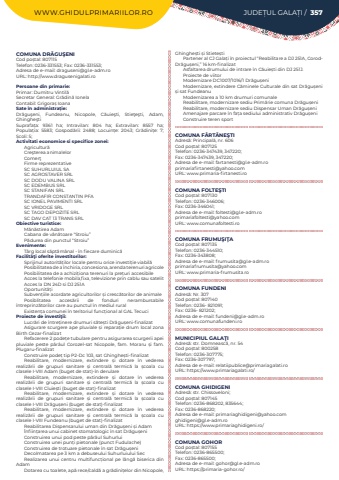 WWW.GHIDULPRIMARIILOR.RO JUDE%u021aUL GALA%u021aI / 357COMUNA DR%u0102GU%u015eENICod po%u0219tal: 807115Telefon: 0236-331553; Fax: 0236-331553; Adresa de e-mail: draguseni@gl.e-adm.roURL: http://www.dragusenigalati.roPersoane din primarie:Primar: Dumitru Vintil%u0103Secretar General: Gr%u0103din%u0103 IonelaContabil: Grigora%u0219%u00a0IoanaSate %u00een administra%u021bie:Dr%u0103gu%u015feni, Fundeanu, Nicopole, C%u0103uie%u015fti, Stie%u0163e%u015fti, Adam, Ghinghe%u015ftiSuprafa%u021ba:%u00a0 9361 ha; Intravilan:%u00a0 804 ha; Extravilan:%u00a0 8557 ha; Popula%u021bia:%u00a0 5583; Gospod%u0103rii:%u00a0 2488; Locuin%u021be:%u00a0 2043; Gr%u0103dini%u021be:%u00a0 7; %u0218coli:%u00a05; Activitati economice si specifice zonei:Agricultur%u0103Cre%u015fterea animalelorComer%u0163Firme reprezentativeSC SUHURLUIUL SASC AGROSTAVER SRLSC DODU VALINA SRLSC EDEMBUS SRLSC STANIFAN SRLTRANDAFIR CONSTANTIN PFASC IONEL PAVIMENTI SRLSC VRIDOGE SRL SC TAGO DEPOZITE SRLSC DAV CAT 13 TRANS SRLObiective turistice:M%u0103n%u0103stirea AdamCabana de v%u00e2n%u0103toare %u201cStroiu%u201d P%u0103durea din punctul %u201cStroiu%u201dEvenimente:T%u00e2rg local s%u0103pt%u0103m%u00e2nal - %u00een fiecare duminic%u0103Facilit%u00e3%u0163i oferite investitorilor:Sprijinul autorit%u0103%u021bilor locale pentru orice investi%u021bie viabil%u0103Posibilitatea de a %u00eenchiria, concesiona, arenda terenuri agricolePosibilitatea de a achizi%u021biona terenuri la pre%u021buri accesibileAcces la telefonie mobila,fixa, televizione prin cablu sau satelitAcces la DN 24D si DJ 251AOportunit%u0103%u021biSubven%u021biile acordate agricultorilor %u0219i cresc%u0103torilor de animalePosiblitatea acces%u0103rii de fonduri nerambursabile %u00eentreprinz%u0103torilor care au punctul %u00een mediul ruralExisten%u021ba comunei %u00een teritoriul func%u021bional al GAL TecuciProiecte de investi%u0163ii:Lucr%u0103ri de %u00eentre%u021binere drumuri s%u0103te%u0219ti Dr%u0103gu%u0219eni-finalizatAsigurare scurgere ape pluviale %u0219i repara%u021bie drum local zona Birth Cezar-finalizatRefacerere 2 pode%u021be tubulare pentru asigurarea scurgerii apei pluviale peste p%u00e2r%u00e2ul Corozel-sat Nicopole, fam. Moraru %u0219i fam. Plugaru-finalizatConstruire pode%u021b%u00a0tip P2-Dc 103, sat Ghinghe%u0219ti-finalizatReabilitare, modernizare, extindere %u0219i dotare %u00een vederea realiz%u0103rii de grupuri sanitare %u0219i central%u0103%u00a0 termic%u0103%u00a0 la %u0219coala cu clasele I-VIII Adam (buget de stat)-%u00een derulareReabilitare, modernizare, extindere %u0219i dotare %u00een vederea realiz%u0103rii de grupuri sanitare %u0219i central%u0103%u00a0 termic%u0103%u00a0 la %u0219coala cu clasele I-VIII C%u00eeuie%u0219ti (buget de stat)-finalizatReabilitare, modernizare, extindere %u0219i dotare %u00een vederea realiz%u0103rii de grupuri sanitare %u0219i central%u0103%u00a0 termic%u0103%u00a0 la %u0219coala cu clasele I-VIII Dr%u0103gu%u0219eni (buget de stat)-finalizatReabilitare, modernizare, extindere %u0219i dotare %u00een vederea realiz%u0103rii de grupuri sanitare %u0219i central%u0103%u00a0 termic%u0103%u00a0 la %u0219coala cu clasele I-VIII Fundeanu (buget de stat)-finalizatReabilitarea Dispensarului uman din Dr%u0103gu%u0219eni %u0219i Adam%u00cenfiin%u021barea unui cabinet stomatologic %u00een sat Dr%u0103gu%u0219eniConstruirea unui pod peste p%u00e2r%u00e2ul SuhurluiConstruirea unei pun%u021bi pietonale (punct Fudulache)Construirea de trotuare pietonale %u00een sat Dr%u0103gu%u0219eniDecolmatarea pe 3 km a debuseului Suhurluiului SecRealizarea unui centru multifunc%u021bional pe l%u00e2ng%u0103%u00a0biserica din AdamDotarea cu toalete, ap%u0103%u00a0rece/cald%u0103%u00a0a gr%u0103dini%u021belor din Nicopole, Ghinghe%u0219ti %u0219i Stiete%u0219tiPartener al CJ Gala%u021bi %u00een proiectul %u201cReabilitare a DJ 251A, CorodDr%u0103gu%u0219eni,%u201d 16 km-finalizatAsfaltarea drumului de intrare %u00een C%u0103uie%u0219ti din DJ 251J.Proiecte de viitorModernizare DC1007/1016/1 Dr%u0103gu%u0219eniModernizare, extindere C%u0103minele Culturale din sat Dr%u0103gu%u0219eni %u0219i sat FundeanuModernizarea a 10 km drumuri comunaleReabilitare, modernizare sediu Prim%u0103rie comuna Dr%u0103gu%u0219eniReabilitare, modernizare sediu Dispensar Uman Dr%u0103gu%u0219eniAmenajare parcare %u00een fa%u021ba sediului administrativ Dr%u0103gu%u0219eniConstruire teren sportCOMUNA F%u00c2RT%u0102NE%u015eTIAdres%u0103: Principal%u0103, nr. 606Cod po%u0219tal: 807125Telefon: 0236-347439, 347220; Fax: 0236-347439, 347220; Adresa de e-mail: fartanesti@gl.e-adm.roprimariafirtanesti@yahoo.comURL: www.primaria-firtanesti.roCOMUNA FOLTE%u015eTICod po%u0219tal: 807130Telefon: 0236-346006; Fax: 0236-346041; Adresa de e-mail: foltesti@gl.e-adm.roprimariafoltesti@yahoo.comURL: www.comunafoltesti.roCOMUNA FRUMU%u015eI%u0162ACod po%u0219tal: 807135Telefon: 0236-344510; Fax: 0236-343808; Adresa de e-mail: frumusita@gl.e-adm.roprimariafrumusita@yahoo.comURL: www.primaria-frumusita.roCOMUNA FUNDENIAdres%u0103: Nr. 307Cod po%u0219tal: 807140Telefon: 0236- 821091; Fax: 0236- 821202; Adresa de e-mail: fundeni@gl.e-adm.roURL: www.comunafundeni.roMUNICIPIUL GALA%u0162IAdres%u0103: str. Domneasc%u0103, nr. 54Cod po%u0219tal: 800258Telefon: 0236-307775; Fax: 0236-307797; Adresa de e-mail: relatiipublice@primariagalati.roURL: https://www.primariagalati.ro/COMUNA GHIDIGENIAdres%u0103: str. Chissoveloni; Cod po%u0219tal: 807145Telefon: 0236-868202, 835644; Fax: 0236-868220; Adresa de e-mail: primariaghidigeni@yahoo.comghidigeni@gl.e-adm.roURL: https://www.primariaghidigeni.ro/COMUNA GOHORCod po%u0219tal: 807155Telefon: 0236-865500; Fax: 0236-865500; Adresa de e-mail: gohor@gl.e-adm.roURL: https://primaria-gohor.ro/