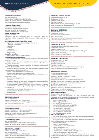 368 / JUDE%u021aUL GIURGIU WWW.GHIDULPRIMARIILOR.ROCOMUNA OGREZENICod po%u0219tal: 087170Telefon: 0246-250234; Fax: 0246-250234; Adresa de e-mail: primaria_ogrezeni@yahoo.comURL: https://www.primariaogrezeni.ro/Persoane din primarie:Primar: Jan%u00a0C%u0103t%u0103lin PredaViceprimar: George Valeriu MorcovSecretar General : Ion GheorgheContabil: Ni%u021b%u0103 Mihaela, Soare DianaSate %u00een administra%u021bie:Ogrezeni, HobaiaSuprafa%u021ba:%u00a0 3195 ha; Intravilan:%u00a0 200 ha; Extravilan:%u00a0 2995 ha; Popula%u021bia:%u00a0 4980; Gospod%u0103rii:%u00a0 1760; Locuin%u021be:%u00a0 1521; Gr%u0103dini%u021be:%u00a0 4; %u0218coli:%u00a04; Activitati economice si specifice zonei:Agricultur%u0103 (cultura c%u0103p%u015funului %u015fi a vi%u0163ei de vie)Cre%u015fterea animalelorAgricultur%u0103Comer%u0163Construc%u0163iiPrest%u0103ri serviciiAlte ocupa%u0163ii%u00a0Obiective turistice:Balt%u0103 pentru pescuit sportiv 301 haFacilit%u00e3%u0163i oferite investitorilor:Concesionarea unor suprafe%u0163e de teren pentru dezvoltarea de activit%u0103%u0163i %u00een zon%u0103Sprijin pentru derularea rapid%u0103 a formalit%u0103%u0163ilor legale pentru %u00eenceperea investi%u0163iilorFurnizarea de date necesare studiilor de pia%u0163%u0103 pentru investi%u0163iiProiecte de investi%u0163ii:Prim%u0103ria comunei Ogrezeni face eforturi pentru transpunerea %u00een practic%u0103 a urm%u0103toarelor proiecte:Introducerea aliment%u0103rii cu gaz-realizatIntroducerea aliment%u0103rii cu ap%u0103 potabil%u0103Introducerea canaliz%u0103rii pentru apele uzate %u015fi realizarea unei sta%u0163ii de epurareConstruire sediu prim%u0103rieRealiz%u0103ri:Asfaltarea drumurilor comunale %u015fi jude%u0163ene %u00een propor%u0163ie de 80%Iluminarea stradal%u0103 %u00een propor%u0163ie de 90%Achizi%u0163ia unui automobil Logan pentru Consiliul Local OgrezeniModernizarea a 2 %u015fcoli generale %u015fi 2 %u015fcoli primare c%u00e2t %u015fi a 3 loca%u015fe de cultModernizarea C%u0103minului Cultural OgrezeniRealizarea mini-stadionului localSal%u0103%u00a0de sport%u00a0COMUNA OINACUCod po%u0219tal: 087175Telefon: 0246-239143; Fax: 0246-239145; Adresa de e-mail: primariaoinacugr@gmail.comURL: www.primariaoinacu.roCOMUNA PRUNDUAdres%u0103: Prim%u0103riei, nr. 1; Cod po%u0219tal: 087180Telefon: 0246-245117; Fax: 0246-245120; Adresa de e-mail: primaria_prundu@yahoo.comURL: http://prundu.infoprimarie.roCOMUNA PUTINEIUCod po%u0219tal: 087185Telefon: 0372-280753,280755; Fax: 0246-233103; Adresa de e-mail: secretar@primariaputineiu.roCOMUNA R%u0102SUCENIAdres%u0103: Soseaua Principala ,nr 12Cod po%u0219tal: 087190Telefon: 0371-316585; Fax: 0372-002159; Adresa de e-mail: primarie@comunarasuceni.roURL: www.comunarasuceni.roCOMUNA ROATA DE JOSAdres%u0103: Republicii, nr. 65Cod po%u0219tal: 087195Telefon: 0246-266115; Fax: 0246-266115; Adresa de e-mail: cl_roatadejos@yahoo.comURL: https://primariaroatadejos.ro/COMUNA S%u0102B%u0102RENIAdres%u0103: Teilor, nr. 1Cod po%u0219tal: 087153Telefon: 0246-253293, 253358; Fax: 0246-253358; Adresa de e-mail: primariasabareni@yahoo.comURL: http://comunasabareni.ro/COMUNA SCHITUAdres%u0103: Sat. Schitu, Sos. Giurgiului nr. 43,Cod po%u0219tal: 087200Telefon: 0246-276219; Adresa de e-mail: primariaschitu@primariaschitugr.roclschitugr@yahoo.comURL: www.primariaschitugr.roCOMUNA SINGURENIAdres%u0103: Palatului, nr. 906Cod po%u0219tal: 087205Telefon: 0246-234213; Fax: 0246-234213; Adresa de e-mail: primar@primariasingurenigr.roURL: https://www.primariasingurenigr.ro/Persoane din primarie:Primar: Marian P%u0103tuleanuViceprimar: Cristinel PopaSecretar General: Gheorghe DragneContabil: Iuliana IacobCompartiment taxe %u0219i impozite: Petronela IliescuCompartiment taxe %u0219i impozite %u00a0Georgiana RaducuCompartiment taxe %u0219i impozite%u00a0Oana MarianaStare civil%u0103%u00a0: Marian VladAsisten%u021b%u0103%u00a0social%u0103%u00a0: %u00a0Nicolae P%u0103unRegistrul Agricol %u0219i Urbanism: Trandafir Marin IulianRegistratura arhiv%u0103: %u0218tefania U%u021b%u0103Administratoe public: Cristian R%u0103g%u0103lieSate %u00een administra%u021bie:Singureni, Cr%u00eenguri, StejaruSuprafa%u021ba:%u00a0 5937 ha; Intravilan:%u00a0 322 ha; Extravilan:%u00a0 5615 ha; Popula%u021bia:%u00a03070; Gospod%u0103rii:%u00a01700; Locuin%u021be:%u00a01720; Gr%u0103dini%u021be:%u00a03; %u0218coli:%u00a02; Activitati economice si specifice zonei:Agricultur%u0103, comer%u021b,%u00a0Firme reprezentative:S.C%u00a0AGROMEC%u00a0CRINGURI%u00a0SASOCIETATEA%u00a0AGRICOL%u0102%u00a0SINGURENIS.C%u00a0AGROPROD%u00a0MUNTENIA%u00a0SRLSC%u00a0AGRINVEST%u00a0FARM%u00a0SRLSC%u00a0FIRMA%u00a0FAMILI%u0102%u00a0OPREA%u00a0SRLSC%u00a0KATY%u00a0MARY%u00a0FERMA%u00a0SRL SC YZZY REAL ROUTE SRL%u00a0Obiective turistice:Pe teritoriul comunei exist%u0103%u00a0mai multe l%u0103ca%u0219e de cult care sunt declarate monumente istorice:Cadrul natural cu valoare deosebit%u0103%u00a0 favorizeaz%u0103%u00a0 dezvoltarea turismului de agrement (pescuit ,inot)Obiective Turistice:- Lunca r%u00e2ului Neajlov- Zona parcului natural Comana- P%u0103durea Neajlovului- Trei biserici monumente istorice- Conacul Nicu Cantacuzino -sat Singureni -%u00a0Conacul Mociorni%u021ba -sat SingureniLocalitatea ofer%u0103 turi%u0219tilor un loc minunat de recreere pe timpul verii la DOMENIUL CU PALMIERI situat %u00eentre satele Cr%u00eenguri %u0219i Singureni.