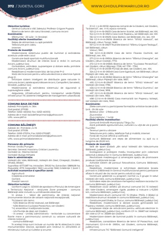 372 / JUDE%u021aUL GORJ WWW.GHIDULPRIMARIILOR.ROObiective turistice:Centrul Cultural a V%u0103ii Jalesului Profesor Grigore PupazaBiserica de lemn din satul Stroie%u0219ti, comuna ArcaniEvenimente:Sf%u00e2ntul Ilie - 20 iulie - %u00een Stroie%u015ftiFacilit%u00e3%u0163i oferite investitorilor:Re%u0163ea de alimentare cu ap%u0103 potabil%u0103Televiziune prin cabluInternetProiecte de investi%u0163ii:Modernizarea sistemului public de iluminat %u0219i extinderea acestuia unde este cazulConstruire baz%u0103%u00a0sportiv%u0103 multifunc%u021bional%u0103Modernizare drumuri de interes local %u0219i str%u0103zi %u00een comuna Arcani, jude%u021bul%u00a0GorjConsolidare, extindere, supraetajare %u0219i dotare sediu prim%u0103rie comuna Arcani, jude%u021bul%u00a0GorjReabilitare %u0219i modernizare bloc de locuinte P+2Sta%u021bii de %u00eencarcare pentru vehicule electrice %u0219i electrice hybrid plug-in%u00cenfiin%u021bare sistem inteligent de distribu%u021bie gaze naturale %u00een comuna Arcani, satele apar%u021bin%u0103toare Arcani, Campofeni, Sanatesti, Stroie%u0219ti, jude%u021bul%u00a0GorjModernizarea %u0219i extinderea sistemului de siguran%u0219%u0103%u00a0 %u0219i supraveghere videoAsigurarea infrastructurii pentru transportul verde-ITS/alte infrastructuri TIC (sisteme inteligente de management urban/local)COMUNA BAIA DE FIERAdres%u0103: Principal%u0103, nr. 364Cod po%u0219tal: 217030Telefon: 0253-461202; Fax: 0253-461012; Adresa de e-mail: baiadefierprimaria@yahoo.comURL: www.pbf.roCOMUNA B%u0102L%u0102NE%u015eTI Adres%u0103: str. Prim%u0103riei ,nr.19Cod po%u0219tal: 217035Telefon: 0253-270114; Fax: 0253-270287; Adresa de e-mail: primariabalanesti@yahoo.comURL: www.primariabalanesti.roPersoane din primarie:Primar: Ovidiu PunganSecretar General: Horoianu Cristian Lauren%u021biuContabil: ec. Marina DanielContabil: Buliga MihaelaSate %u00een administra%u021bie:Voite%u015ftii din Vale, B%u0103l%u0103ne%u0219ti, Voite%u015ftii din Deal, C%u00eenepe%u015fti, Glodeni, Ohaba, BlidariSuprafa%u021ba:%u00a06177,087 ha; Intravilan:%u00a0391,92 ha; Extravilan:%u00a05889,08 ha; Popula%u021bia:%u00a02173; Gospod%u0103rii:%u00a01550; Locuin%u021be:%u00a01550; Gr%u0103dini%u021be:%u00a01; %u0218coli:%u00a01; Activitati economice si specifice zonei:Agricultur%u0103Cre%u015fterea animalelorComer%u0163Prest%u0103ri serviciiObiective turistice:Conform Legii nr. 5/2000 de aprobare a Planului de Amenajare a Teritoriului Na%u0163ional - sec%u0163iunea Zone protejate - comuna B%u0103l%u0103ne%u015fti este inclus%u0103 cu urm%u0103toarele obiective:%u00een anexa I - Valori de patrimoniu de interes na%u0163ional (monumente istorice de valoare na%u0163ional%u0103 excep%u0163ional%u0103;*h) biserici din lemn:- h/25 Biserica Sfin%u021bii%u00a0Voievozi, sat B%u0103l%u0103ne%u015fti- h/26 Biserica Cuvioasa Paraschiva, sat Glodeni*n) ansambluri tradi%u0163ionale locale;- n/4 Pivni%u0163e de deal, sat Glodeni- %u00een anexa - Unit%u0103%u0163i administrativ - teritoriale cu concentrare foarte mare a patrimoniului construit cu valoare cultural%u0103 de interes na%u0163ional:- comuna B%u0103l%u0103ne%u015fti%u00cen acela%u015fi timp sunt incluse un num%u0103r de 16 obiective %u00een Lista monumentelor istorice, aprobat%u0103 prin Ordinul nr. 2314/2004 al Ministrului Culturii %u015fi Cultelor %u015fi anume:31 GJ -I-s-B-09132 A%u015fezarea roman%u0103 de la Glodeni, sat Glodeni, %u201cla biseric%u0103%u201d, sec. II-III, epoca roman%u0103;153 GJ-II-m-B-09213 Casa de lemn Scarlat, sat B%u0103l%u0103ne%u015fti, sec XIX;154 GJ-II-m-B-09214 Casa Gic%u0103 Popescu, sat B%u0103l%u0103ne%u015fti, sec XIX:155 GJ-II-m-B-09215 Casa Barbici, sat B%u0103l%u0103ne%u015fti, %u00eenc. sec. XIX156 GJ-II-m-A-09216 Biserica de lemn %u201cSfin%u021bii%u00a0 Voievozi%u201d, sat B%u0103l%u0103ne%u015fti, c%u0103tun Toropi, 1680;%u00a0157 GJ-II-m-B-09217 Ruinele bisericii %u201cSf%u00e2ntu%u00a0Grigore Teologul%u201d, sat B%u0103l%u0103ne%u015fti, c%u0103tun%u00a0Viezuri, 1841;158 GJ-II-m-B-09218 Casa de lemn Floarea Cochin%u0103, sat B%u0103l%u0103ne%u015fti, sec. XIX;271 GJ-II-m-B-09304 Biserica de lemn %u201cSf%u00e2ntul Gheorghe%u201d, sat Glodeni, c%u0103tun Ciore%u015fti, 1772;%u00a0272 GJ-II-m-B-09305 Biserica de lemn %u201cCuvioasa Paraschiva%u201d, sat Glodeni, c%u0103tun B%u00e2%u015fnegi, 1728, ref. 1791 - 1792;273 Gj-II-m-B-20139 Pivni%u0163%u0103 de deal, sat Glodeni, sec. XIX;324 GJ-II-m-B-09349 Casa Gore Sgarbur%u0103, sat B%u0103l%u0103ne%u015fti, c%u0103tun Pi%u015fte%u015ftii din Vale, sec. XIX;325 GJ-II-m-B-09350 Biserica de lemn %u201cSf%u00e2ntul Gheorghe%u201d sat B%u0103l%u0103ne%u015fti, c%u0103tun Pi%u015fte%u015ftii din Vale, 1857;455 GJ-II-m-B-09457 Biserica de lemn %u201cSfin%u021bii%u00a0 Voievozi%u201d sat Voite%u015ftii din Deal, 1795;456 GJ-II-m-B-09458 Biserica de lemn %u201cSf%u00e2ntul%u00a0Dumitru%u201d, sat Voite%u015ftii din Deal, 1818;457 GJ-II-m-B-09459 Biserica de lemn %u201cSfin%u021bii%u00a0 Voievozi%u201d, sat Voite%u015ftii din Vale, 1832;498 GJ-IV-m-B-09492 Casa memorial%u0103 Ion Popescu Voite%u015fti, sat Voite%u015ftii din Vale, 1940.Evenimente:Zilele comunei cu participarea forma%u021biilor artistice locale %u0219i din %u021bar%u0103 - 25-26 iulieBotezul viilor - 2 februarieZiua eroilorZiua copilului - 1 iunieFacilit%u00e3%u0163i oferite investitorilor:Comun%u0103 limitrof%u0103 Municipiului T%u00e2rgu JiuZon%u0103 pretabil%u0103 agroturismului, cultiv%u0103rii cu vi%u0163%u0103 de vie %u015fi pomi fructiferiTerenuri pentru v%u00e2nzareTeleviziune prin cablu, telefonie fix%u0103 %u015fi mobil%u0103, internetFor%u0163%u0103 de munc%u0103 ieftin%u0103 %u015fi calificat%u0103Comun%u0103 B%u0103l%u0103ne%u015fti are re%u0163ea de alimentare cu ap%u0103 cu o lungime de 23,00 km.Proiecte de investi%u0163ii:Sal%u0103%u00a0 de sport %u0219colar%u0103%u00a0 %u201edin satul Voite%u0219tii din Vale,comuna B%u0103l%u0103ne%u0219ti, jude%u021bul GorjEcologizare %u0219i protejare mediu %u00eenconjurator prin col