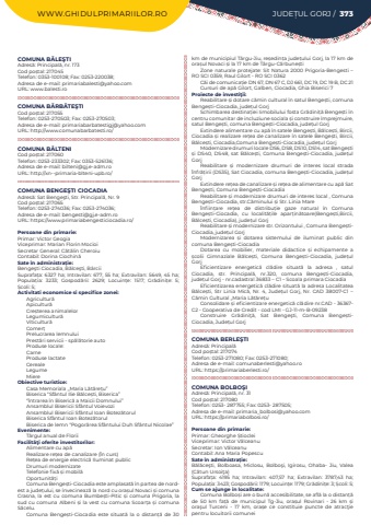 WWW.GHIDULPRIMARIILOR.RO JUDE%u021aUL GORJ / 373COMUNA B%u0102LE%u015eTIAdres%u0103: Principal%u0103, nr. 173Cod po%u0219tal: 217045Telefon: 0353-100108; Fax: 0253-220038; Adresa de e-mail: primariabalesti@yahoo.comURL: www.balesti.roCOMUNA B%u0102RB%u0102TE%u015eTICod po%u0219tal: 217055Telefon: 0253-270503; Fax: 0253-270503; Adresa de e-mail: primariabarbatestigj@yahoo.comURL: http://www.comunabarbatesti.ro/COMUNA B%u00c2LTENICod po%u0219tal: 217060Telefon: 0253-233302; Fax: 0353-526136; Adresa de e-mail: bilteni@gj.e-adm.ro URL: http://xn--primaria-blteni-upb.ro/COMUNA BENGE%u015eTI CIOCADIA Adres%u0103: Sat Benge%u015fti, Str. Principal%u0103, Nr. 9Cod po%u0219tal: 217065Telefon: 0253-274036; Fax: 0253-274036; Adresa de e-mail: bengesti@gj.e-adm.roURL: https://www.primariabengesticiocadia.ro/Persoane din primarie:Primar: Victor Geogia%u00a0Viceprimar: Marian Florin MocioiSecretar General: C%u0103t%u0103lin Cheroiu%u00a0Contabil:%u00a0Dorina Ciochin%u0103Sate %u00een administra%u021bie:Benge%u015fti Ciocadia, B%u0103lce%u015fti, B%u00e2rciiSuprafa%u021ba:%u00a06327 ha; Intravilan:%u00a0677, 55 ha; Extravilan:%u00a05649, 45 ha; Popula%u021bia:%u00a0 3233; Gospod%u0103rii:%u00a0 2629; Locuin%u021be:%u00a0 1517; Gr%u0103dini%u021be:%u00a0 5; %u0218coli:%u00a05; Activitati economice si specifice zonei:Agricultur%u0103Apicultur%u0103Cre%u0219terea animalelorLegumicultur%u0103 Viticultur%u0103 Comer%u021bPrelucrarea lemnuluiPrest%u0103ri servicii - sp%u0103l%u0103torie autoProduse locale:CarneProduse lactateCerealeLegume MiereObiective turistice:Casa Memoriala ,,Maria L%u0103t%u0103re%u021bu%u201dBiserica %u201cSf%u00e2ntul Ilie B%u0103lce%u0219ti, Biserica%u201d%u201c%u00cfntrarea %u00een Biseric%u0103 a Maicii Domnului%u201dAnsamblul Bisericii Sf%u00e2ntul%u00a0VoievoziAnsamblul Bisericii Sf%u00e2ntul Ioan Botez%u0103torulBiserica Sf%u00e2ntul Ioan Botez%u0103torul Biserica de lemn %u201cPogor%u00e2rea Sf%u00e2ntului Duh Sf%u00e2ntul Nicolae%u201dEvenimente:T%u00e2rgul anual de FloriiFacilit%u00e3%u0163i oferite investitorilor:Alimentare cu ap%u0103Realizare re%u021bea de canalizare (%u00cen curs)Re%u021bea de energie electric%u0103 Iluminat publicDrumuri modernizateTelefonie fix%u0103 %u0219i mobil%u0103Oportunit%u0103%u021biComuna Benge%u0219ti-Ciocadia este amplasat%u0103%u00a0%u00een partea de nordest a jude%u021bului, se %u00eenvecineaz%u0103%u00a0la nord cu ora%u0219ul Novaci %u0219i comuna Crasna, la est cu comuna Bumbe%u0219ti-Pitic %u0219i comuna Prigoria, la sud cu comuna Albeni %u0219i la vest cu comuna Scoar%u021ba %u0219i comuna S%u0103celu.Comuna Benge%u0219ti-Ciocadia este situat%u0103%u00a0 la o distan%u021b%u0103%u00a0 de 30 km de municipiul T%u00e2rgu-Jiu, re%u0219edin%u021ba jude%u021bului Gorj, la 17 km de ora%u0219ul Novaci %u0219i la 17 km de T%u00e2rgu-C%u0103rbune%u0219tiZone naturale protejate: Sit Natura 2000 Prigoria-Bengesti %u2013 RO SCI 0359, Raul Gilort - RO SCI 0362C%u0103i de comunica%u021bie DN 67, DN 67 C, DJ 661, DC 19, DC 19 B, DC 21Cursuri de ap%u0103%u00a0Gilort, Galben, Ciocadia, Ghia Biserici 7Proiecte de investi%u0163ii:Reabilitare %u0219i dotare c%u0103min cultural %u00een satul Benge%u0219ti, comuna Benge%u0219ti-Ciocadia, jude%u021bul%u00a0GorjSchimbarea destina%u021biei Iimobilului fosta Gr%u0103dini%u021b%u0103%u00a0Benge%u0219ti %u00een centru comunitar de incluziune sociala %u0219i construire %u00eemprejmuire, satul Benge%u0219ti, comuna Benge%u0219ti-Ciocadia, jude%u021bul%u00a0GorjExtindere alimentare cu ap%u0103%u00a0%u00een satele Benge%u0219ti, B%u0103lce%u0219ti, Bircii, Ciocadia %u0219i realizare re%u021bea de canalizare %u00een satele Benge%u0219ti,%u00a0Bircii, B%u0103lce%u0219ti, Ciocadia,Comuna Benge%u0219ti-Ciocadia, jude%u021bul GorjModernizare drumuri locale DS6, DS8, DS10, DS14, sat Benge%u0219ti %u0219i DS40, DS48, sat B%u0103lce%u0219ti, Comuna Benge%u0219ti-Ciocadia, jude%u021bul GorjReabilitare %u0219i modernizare drumuri de interes local strada %u00cenfr%u0103%u021birii (DS35), Sat Ciocadia, comuna Benge%u0219ti-Ciocadia, jude%u021bul GorjExtindere re%u021bea de canalizare %u0219i re%u021bea de alimentare cu ap%u0103%u00a0Sat Benge%u0219ti, Comuna Benge%u0219ti-CiocadiaReabilitare %u0219i modernizare drumuri de interes local , Comuna Benge%u0219ti-Ciocadia, str.C%u0103minului %u0219i Str. Linia Mare%u00cenfiin%u021bare re%u021bea de distribu%u021bie gaze natural %u00een Comuna Benge%u0219ti-Ciocadia, cu localit%u0103%u021bile apar%u021bin%u0103toare(Benge%u0219ti,Bircii, B%u0103lce%u0219ti, Ciocadia), jude%u021bul GorjReabilitare %u0219i modernizare str. Orizontului , Comuna Benge%u0219tiCiocadia, jude%u021bul GorjModernizarea %u0219i dotarea sistemului de iluminat public din comuna Benge%u0219ti-CiocadiaDotarea cu mobilier, materiale didactice %u0219i echipamente a %u0219colii Gimnaziale B%u0103lce%u0219ti, Comuna Benge%u0219ti-Ciocadia, jude%u021bul GorjEficientizare energetic%u0103%u00a0 cl%u0103dire situat%u0103%u00a0 la adresa , satul Ciocadia, str. Principal%u0103, nr.320, comuna Benge%u0219ti-Ciocadia, jude%u021bul Gorj - nr.cadastral 36833 %u2013 C1 %u2013 Scoala primara CiocadiaEficientizarea energetic%u0103 cl%u0103dire situat%u0103 la adresa Localitatea B%u0103lce%u0219ti, Str Linia Mic%u0103, Nr. 4, Jude%u021bul Gorj, Nr. CAD 38007-C1 %u2013 C%u0103min Cultural %u201eMaria L%u0103t%u0103re%u021buConsolidare %u0219i eficientizare energetic%u0103%u00a0cl%u0103dire nr.CAD - 36367-C2 - Cooperativa de Credit - cod LMI - GJ-11-m-B-09238Construire Gr%u0103dini%u0163%u0103, Sat Benge%u015fti, Comuna Benge%u0219tiCiocadia, Jude%u021bul GorjCOMUNA BERLE%u015eTIAdres%u0103: Principal%u0103Cod po%u0219tal: 217074Telefon: 0253-271080; Fax: 0253-271080; Adresa de e-mail: comunaberlesti@yahoo.roURL: https://primariaberlesti.ro/COMUNA BOLBO%u015eIAdres%u0103: Principal%u0103, nr. 31Cod po%u0219tal: 217080Telefon: 0253- 287755; Fax: 0253- 287505; Adresa de e-mail: primaria_bolbosi@yahoo.comURL: https://primariabolbosi.ro/Pers