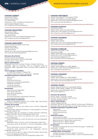 378 / JUDE%u021aUL GORJ WWW.GHIDULPRIMARIILOR.ROCOMUNA D%u0102NE%u015eTICod po%u0219tal: 217200Telefon: 0253-271600; Fax: 0253-271855; Adresa de e-mail: rimar@comunadanesti.rosecretar.danesti@yahoo.com,URL: http://www.comunadanesti.roCOMUNA DRAGOTE%u015eTICod po%u0219tal: 217220Telefon: 0253-376000; Fax: 0253-376701; Adresa de e-mail: prim.dragotesti@yahoo.comURL: http://www.primariadragotesti.ro/COMUNA DR%u0102GU%u0162E%u015eTIAdres%u0103: Strada Principal%u0103, num%u0103r 240Cod po%u0219tal: 217225Telefon: 0253-227625; Fax: 0253-227543; Adresa de e-mail: primaria.dragutesti@yahoo.comURL: www.primaria-dragutesti.roPersoane din primarie:Primar: Dumitru Ion Popescu%u00a0Secretar General:Alina Valentina Zgondea%u00a0Contabil: Dana - Elena Ro%u015fca%u00a0Sate %u00een administra%u021bie:Dr%u0103gu%u0163e%u015fti, Ia%u015fi-Gorj, Ureche%u015fti, T%u00e2lve%u015fti, C%u00e2rbe%u015fti, D%u00e2mbovaSuprafa%u021ba:%u00a0 6225 ha; Intravilan:%u00a0 1116 ha; Extravilan:%u00a0 5109 ha; Popula%u021bia:%u00a0 4878; Gospod%u0103rii:%u00a0 2270; Locuin%u021be:%u00a0 2984; Gr%u0103dini%u021be:%u00a0 5; %u0218coli:%u00a02; Cum se ajunge in localitate:Cu mijloc de transport %u2013 DN66 (E79) Feroviar (Sta%u021bia Amaradia - Dr%u0103gu%u021be%u0219ti - C%u00e2rbe%u0219ti)Activitati economice si specifice zonei:Agricultur%u0103Comer%u021bPrelucrarea lemnuluiExploatare materiale de balastier%u0103Cre%u0219terea animalelorLucr%u0103ri de artizanat Cultivarea p%u0103m%u00e2ntuluiEvenimente:Zilele Comunei Dr%u0103gu%u021be%u0219tiHora satului Ia%u0219i GorjHora satului Dr%u0103gu%u021be%u0219tiHramul satelorZiua Interna%u021bional%u0103 a Persoanelor V%u00e2rstnice Ziua Na%u021bional%u0103 a Rom%u00e2nieiFacilit%u00e3%u0163i oferite investitorilor:Comuna Dr%u0103gu%u021be%u0219ti dispune de utilit%u0103%u021bi (ap%u0103, electricitate, gaze, telefonie fix%u0103 %u0219i mobil%u0103, etc.)Proiecte de investi%u0163ii:Modernizare drumuri de interes local, comuna Dr%u0103gu%u021be%u0219ti, jude%u021bul GorjModernizare re%u021bea de alimentare cu ap%u0103 potabil%u0103 %u00een comuna Dr%u0103gu%u021be%u0219ti, jude%u021bul GorjExtindere re%u021bea de canalizare %u00een satele Ureche%u0219ti, D%u00e2mbova, C%u00e2rbe%u0219ti %u0219i T%u00e2lve%u0219ti, comuna Dr%u0103gu%u021be%u0219ti, jude%u021bul Gorj%u00cenfiin%u021barea unui centru de colectare prin aport voluntar %u00een comuna Dr%u0103gu%u021be%u0219tiReabilitare dispensar uman sat Ia%u0219i-Gorj, comuna Dr%u0103gu%u021be%u0219ti, jude%u021bul GorjReabilitare c%u0103min cultural, comuna Dr%u0103gu%u021be%u0219ti, jude%u021bul GorjAmenajare pist%u0103 de biciclete %u00een comuna Dr%u0103gu%u021be%u0219ti, jude%u021bul Gorj%u0218an%u021buri betonate %u00een comuna Dr%u0103gu%u021be%u0219ti, jude%u021bul GorjConstruire baz%u0103 sportiv%u0103 tip I, sat Dr%u0103gu%u021be%u0219ti, comuna Dr%u0103gu%u021be%u0219ti, jude%u021bul GorjConstruire teren sport cu gazon artificial %u0219i sistem de iluminat %u00een comuna Dr%u0103gu%u021be%u0219ti, jude%u021bul Gorj Construire gr%u0103dini%u021b%u0103 %u00een comuna Dr%u0103gu%u021be%u0219ti, jude%u021bul GorjCOMUNA F%u0102RC%u0102%u015eE%u015eTIAdres%u0103: Principala Nr.1; Cod po%u0219tal: 217235Telefon: 0253-289544; Fax: 0253-289651; Adresa de e-mail: primariafarcasesti@yahoo.comURL: www.primaria-farcasesti.roCOMUNA GLOGOVACod po%u0219tal: 217245Telefon: 0253-411411; Fax: 0253-411411; Adresa de e-mail: glogova_primaria@yahoo.comURL: http://www.primariaglogova.ro/COMUNA GODINE%u015eTICod po%u0219tal: 217250Telefon: 0253-377001; Adresa de e-mail: primariagodinesti@yahoo.comURL: http://www.comunagodinesti.ro/COMUNA HUREZANIAdres%u0103: str.Principal%u0103, nr. 95Cod po%u0219tal: 217260Telefon: 0253-231107; Fax: 0253-231107; Adresa de e-mail: hurezani@gj.e-adm.roprimariahurezani@yahoo.comURL: https://hurezani.eccompany.ro/COMUNA IONE%u015eTICod po%u0219tal: 217265Telefon: 0253-288505; Fax: 0253-288505; Adresa de e-mail: lambusorin81@yahoo.comURL: https://primariaionesti.ro/COMUNA JUPANESTICod po%u0219tal: 217270Telefon: 0253-230606; Fax: 0253-230697; Adresa de e-mail: primariajupinesti@yahoo.comURL: http://www.primariajupinesti.ro/COMUNA LELE%u015eTIAdres%u0103: Aleea Prim%u0103riei nr.1; Cod po%u0219tal: 217275Telefon: 0253-278484, 278687; Fax: 0253-278687; Adresa de e-mail: lelesti@gj.e-adm.roURL: primarialelesti.roPersoane din primarie:Primar: Vasile - Lauren%u0163iu Turcil%u0103Secretar General: Bogdan Ligia DacianaContabil: Sc%u00e2nteie VioletaSate %u00een administra%u021bie:Lele%u015fti, Fr%u0103%u0163e%u015fti, Rasovi%u0163aSuprafa%u021ba:%u00a03017,92 ha; Intravilan:%u00a0287,0217 ha; Extravilan:%u00a02730,90 ha; Popula%u021bia:%u00a01980; Gospod%u0103rii:%u00a0830; Locuin%u021be:%u00a0608; Gr%u0103dini%u021be:%u00a03; %u0218coli:%u00a03; Activitati economice si specifice zonei:Agricultur%u0103Cre%u015fterea animalelorPrelucrarea lemnuluiComer%u0163Obiective turistice:Muzeul satului Lele%u015ftiMonumentul Eroilor %u015fi Troi%u0163a din satul Rasovi%u0163aBiserica de lemn %u201cSf%u00e2ntul Ioan Gur%u0103 de Aur%u201dBiserica de lemn %u201cSf%u00e2ntul Nicolae%u201dBiserica de lemn %u201cSf%u00e2ntul Vasile%u201dEvenimente:S%u0103rb%u0103torile ocazionale de ziua Sf. Maria (15 august - Fr%u0103te%u015fti, 08 septembrie - Lele%u015fti)S%u0103rb%u0103toarea Teiului %u00een luna maiFacilit%u00e3%u0163i oferite investitorilor:Utilit%u0103%u0163i: ap%u0103, gaze, telefonie, cablu TV, iluminatAcordare de spa%u0163ii cu chirie redus%u0103 - se pun la dispozi%u0163ie spa%u0163ii pentru activit%u0103%u0163i