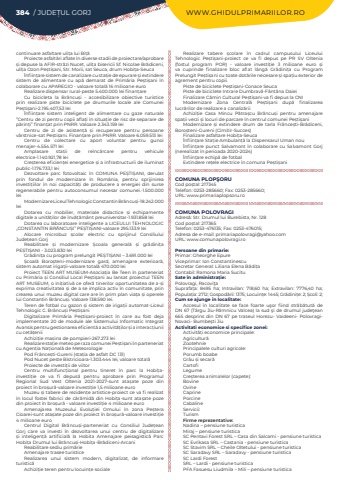 384 / JUDE%u021aUL GORJ WWW.GHIDULPRIMARIILOR.ROcontinuare asfaltare uli%u021ba lui Bi%u021b%u0103Proiecte asfalt%u0103ri aflate %u00een diverse stadii de proiectare/aprobare %u0219i depuse la AFIR-str%u0103zi Nucet, uli%u021ba bisericii Sf. Nicolae Br%u0103diceni, uli%u021ba Ozon Pe%u0219ti%u0219ani, Str. Morii, sat Seuca, drum Hobi%u021ba-Seuca%u00cenfiin%u021bare sistem de canalizare cu sta%u021bie de epurare %u0219i extindere sistem de alimentare cu ap%u0103%u00a0 demarat de Prim%u0103ria Pe%u0219ti%u0219ani %u00een colaborare cu APAREGIO - valoare total%u0103 16 milioane euroRealizare dispensar rural-peste 5.400.000 lei finan%u021bareCu bicicleta la Br%u00e2ncu%u0219i - accesibilizare obiective turistice prin realizare piste biciclete pe drumurile locale ale Comunei Pe%u0219ti%u0219ani-2.195.407,53 lei%u00cenfiin%u021bare sistem inteligent de alimentare cu gaze naturale %u201dCentru de zi pentru copii afla%u021bi %u00een situa%u021bie de risc de separare de p%u0103rin%u021bi%u201d finan%u021bat prin PNRR. Valoare 2.343.159 leiCentru de zi de asisten%u021b%u0103 %u0219i recuperare pentru persoane v%u00e2rstnice-sat Pe%u0219ti%u0219ani. Finan%u021bare prin PNRR. Valoare 6.059.513 leiCentru de colectare cu aport voluntar pentru gunoi menajer-4.554.571 leiAmplasare sta%u021bii de re%u00eenc%u0103rcare pentru vehicule electrice-1.140.921,78 leiCre%u0219terea eficien%u021bei energetice %u0219i a infrastructurii de iluminat public-1.176.733,1 leiDezvoltare parc fotovoltaic %u00een COMUNA PE%u0218TI%u0218ANI, derulat prin fondul de modernizare %u00een Rom%u00e2nia, pentru sprijinirea investi%u021biilor %u00een noi capacit%u0103%u021bi de producere a energiei din surse regenerabile pentru autoconsumul necesar comunei.-1.500.000 leiModernizare Liceul Tehnologic Constantin Br%u00e2ncu%u0219i-18.242.000 leiDotarea cu mobilier, materiale didactice %u0219i echipamente digitale a unit%u0103%u021bilor de %u00eenv%u0103%u021b%u0103m%u00e2nt preuniversitar-1.931.858 leiDotarea cu laboratoare inteligente a LICEULUI TEHNOLOGIC %u201eCONSTANTIN BR%u00c2NCU%u0218I%u201d PE%u0218TI%u0218ANI-valoare 295.133.9 leiAlocare microbuz %u0219colar electric cu sprijinul Consiliului Jude%u021bean GorjReabilitare %u0219i modernizare %u0218coala general%u0103 %u0219i gr%u0103dini%u021ba PE%u0218TI%u0218ANI - 3.023.830 leiGr%u0103dini%u021ba cu program prelungit PE%u0218TI%u0218ANI %u2013 3.691.000 lei%u0218coal%u0103 Boro%u0219teni-modernizare gard, amenajare exterioar%u0103, sistem automat iriga%u021bii-valoare total%u0103 470.000 leiProiect TEEN ART MUSEUM-Asocia%u021bia Be Teen %u00een parteneriat cu Prim%u0103ria %u0219i Consiliul Local Pe%u0219ti%u0219ani au lansat proiectul TEEN ART MUSEUM, o ini%u021biativ%u0103 ce ofer%u0103 tinerilor oportunitatea de a-%u0219i exprima creativitatea %u0219i de a se implica activ %u00een comunitate, prin crearea unui muzeu digital care are %u00een prim plan via%u021ba %u0219i operele lui Constantin Br%u00e2ncu%u0219i. Valoare 138.590 lei.Teren de fotbal cu gazon %u0219i sistem de iriga%u021bii automat-Liceul Tehnologic C. Br%u00e2ncu%u0219i Pe%u0219ti%u0219aniDigitalizare Prim%u0103ria Pe%u0219ti%u0219ani-proiect %u00een care au fost deja implementate 20 de module ale Sistemului Informatic Integrat Avansis pentru gestionarea eficient%u0103 a activit%u0103%u021bilor %u0219i a interac%u021biunii cu cet%u0103%u021beniiAchizi%u021bie ma%u0219ina de pompieri-267.273 leiRealizare sta%u021bie meteo pe raza comunei Pe%u0219ti%u0219ani %u00een parteneriat cu Agen%u021bia Na%u021bional%u0103 de MeteorologiePod Fr%u00e2nce%u0219ti-Gureni (sta%u021bia de asfalt DC 131)Pod Nucet peste Bistricioara-1.303.444 lei, valoare total%u0103Proiecte de investi%u021bii de viitorCentru multifunc%u021bional pentru tineret %u00een parc la Hobi%u021bainvesti%u021bie ce va fi depus%u0103 pentru aprobare prin Programul Regional Sud Vest Oltenia 2021-2027-sunt ata%u0219ate poze din proiect %u00een bro%u0219ur%u0103-valoare investi%u021bie 1,5 milioane euroMuzeu %u0219i tabere de reziden%u021be artistice-proiect ce va fi realizat %u00een locul fostei fabrici de c%u0103r%u0103mid%u0103 din Hobi%u021ba-sunt ata%u0219ate poze din proiect %u00een bro%u0219ur%u0103 - valoare investi%u021bie 4 milioane euroAmenajarea Muzeului Evolu%u021biei Omului %u00een zona Pe%u0219tera Cioarei-sunt ata%u0219ate poze din proiect %u00een bro%u0219ur%u0103-valoare investi%u021bie 4 milioane euroCentrul Digital Br%u00e2ncu%u0219i-parteneriat cu Consiliul Jude%u021bean Gorj care va investi %u00een dezvoltarea unui centru de digitalizare %u0219i inteligen%u021b%u0103 artificial%u0103 la Hobita Amenajare peisagistic%u0103 Parc Hobi%u021ba Drumul lui Br%u00e2ncu%u0219i-Hobi%u021ba-Br%u0103diceni-ArcaniReabilitare sediu prim%u0103rieAmenajare trasee turisticeRealizarea unui sistem modern, digitalizat, de informare turistic%u0103Achizi%u021bie teren pentru locuin%u021be socialeRealizare tabere %u0219colare %u00een cadrul campusului Liceului Tehnologic Pe%u0219ti%u0219ani-proiect ce va fi depus pe PR SV Oltenia (fostul program POR) - valoare investi%u021bie 3 milioane euro %u0219i va cuprinde finalizare bloc aflat l%u00e2ng%u0103 Gr%u0103dini%u021ba cu Program Prelungit Pe%u0219ti%u0219ani cu toate dot%u0103rile necesare %u0219i spa%u021biu exterior de agrement pentru copii.Piste de biciclete Pe%u0219ti%u0219ani-Conace SeucaPiste de biciclete Intrare Dumbrav%u0103-F%u00e2nt%u00e2na DaieiFinalizare C%u0103min Cultural Pe%u0219ti%u0219ani-va fi depus la CNIModernizare Zona Central%u0103 Pe%u0219ti%u0219ani dup%u0103 finalizarea lucr%u0103rilor de realizare a canaliz%u0103riiAchizi%u021bie Casa Mincu P%u0103tra%u0219cu Br%u00e2ncu%u0219i pentru amenajare spa%u021bii verzi %u0219i locuri de parcare %u00een centrul comunei Pe%u0219ti%u0219aniModernizare %u0219i extindere drum de tarla Fr%u00e2nce%u0219ti-Br%u0103diceni, Boro%u0219teni-Gureni (Cimitir-Succes)Finalizare asfaltare Hobi%u021ba-Seuca%u00cenfiin%u021bare Sta%u021bie Ambulan%u021b%u