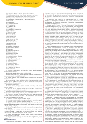 WWW.GHIDULPRIMARIILOR.RO JUDE%u021aUL GORJ / 385PFA Popescu Maria %u2013 Maria %u2013 pensiune turisticaPFA Sucitu Ana Maria %u2013 Ana Maria %u2013 pensiune turisticaCasa Macovei %u2013 Casa Macovei - pensiune turisticaSC Mirapet SRL - Minodora %u2013 pensiune turistic%u0103II Udrea Maria %u2013 Floare de col%u021b%u00a0%u2013 pensiune turistic%u0103SC Zexe SRLSC Happy SRLSC Lanad Impex SRLAF P%u00eervu DorinSC Carlexim SRLAF Prin%u021bipu IonAF Popescu N. ConstantinPF Bu%u0219e MarianAF Giurgiu VasileAF Turc%u0103 ElenaFarmacia FlorinaFruct Alcool SRLDiana Com SRLMags Construct SRLAncorex Ind SRLProduc%u0103tori locali:1. Nodea Nicolae2. B%u0103di%u021ba Nicolae3. T%u00e2rlea M. Constantin4. Dr%u0103gulescu Mariana5. T%u00eerlea Ion6. T%u00eerlea B. Constantin7. R%u0103doi Minodora8. Gog%u00e2%u021b%u0103 Gheorghe9. Iliescu Simona10. Marincei Violeta %u2013Stelu%u021ba 11. Epure Vasilica12. Glaje Tiberius Cosmin13. Ogoranu D%u0103nu%u021b14. Nicu Elena15. Muraru Nicolae16. Priporeanu Olimpia17. Stanciu Simona18. Caralicea Ion MariusProduse locale:1. Zmeur%u0103,mure,cartofi, vin,ou%u0103,nuci, ro%u0219ii, ardei,castrave%u021bi, ceap%u0103,usturoi, morcovi2. Miere de salc%u00e2m BIO, miere poliflor%u0103 BIO3. Ou%u0103, br%u00e2nz%u0103 de vaci, lapte de vac%u0103, zmeur%u0103, mure, siropuri, compoturi ,fasole teac%u0103 %u0219i fasole bob4. Mere, zmeur%u0103, ro%u0219ii, ceap%u0103, cartofi, cire%u0219e, lapte de vac%u0103, br%u00e2nz%u0103 de vac%u01035. Miere rapi%u021b%u0103 , miere poliflor%u0103, miere floarea soarelui, miere salc%u00e2m, miere c%u0103tin%u0103, miere nuc%u0103, miere propolis, miere polen, c%u0103p%u0103ceal%u0103 cu miere, propolis6. Miere, prune, mere7. Miere, mere, cire%u0219e, vi%u0219ine, cartofi, porumb, ou%u0103, lapte, br%u00e2nz%u0103, zmeur%u0103.8. Zmeur%u0103, mure, c%u0103p%u0219uni, cire%u0219e, nuci, coac%u0103ze, cartofi, ro%u0219ii, prune, lapte de capr%u0103, br%u00e2nz%u0103 de capr%u01039. Miere salc%u00e2m,miere man%u0103, miere poliflor%u0103, miere rapi%u021b%u0103, vin, siropuri, zacusc%u0103, dulcea%u021b%u0103, zmeur%u0103, ou%u0103, br%u00e2nz%u0103 de vac%u010310. Dulcea%u021b%u0103 ,siropuri, zacuscu, mur%u0103turi, ou%u0103, br%u00e2nz%u0103, legume ( varz%u0103, cartofi, ceap%u0103, usturoi, etc. ) , fructe ( mere, pere, prune, zmeur%u0103 etc. ), ciuperci la borcan.11. Zmeur%u0103, c%u0103p%u0219uni, struguri, mere, prune.12. Mere, prune, zmeur%u0103, mure, pere, c%u0103p%u0219uni, cartofi, struguri.13. Zmeur%u0103, mure, c%u0103p%u0219uni, usturoi, fasole, vin.14. C%u0103p%u0219uni, zmeur%u0103, mure, dulcea%u021b%u0103 ( c%u0103p%u0219uni, zmeur%u0103, mure. ), sirop ( c%u0103p%u0219uni, zmeur%u0103, mure. ),mere, nuci, fasole, cartofi, ro%u0219ii, usturoi, ceap%u0103, ou%u0103, vin.15. Cartofi, ceap%u0103, c%u0103p%u0219uni, zmeur%u0103, nuci, fasole, compot, sirop, lapte, br%u00e2nz%u0103.16. Ciuperci la borcan, hrean la borcan, zacusc%u0103 (vinete, ciuperci, dovlecei ) ,mere, pere, prune,sirop natural, ou%u0103, br%u00e2nz%u0103, vin, mure de p%u0103dure, fasole ( bob, teac%u0103), cartofi.17. Miere poliflor%u0103,miere salc%u00e2m, miere rapi%u021b%u0103, miere c%u0103tin%u0103, miere propolis, c%u0103p%u0103ceal%u0103. 18. C%u0103p%u0219uni, zmeur%u0103, siropuri ( zmeur%u0103, c%u0103p%u0219uni ), br%u00e2nz%u0103, lapte, cartofi.Obiective turistice:Poten%u0163ialul turistic natural %u2013 istoric, este dat %u00een primul r%u00e2nd de aspectul peisajului %u00eenfrumuse%u0163at de prezen%u0163a barei calcaroase ce formeaz%u0103 abruptul de la contactul muntelui cu depresiunea, de existen%u0163a %u00een aceste calcare a cheilor, pe%u015fterilor %u015fi altor forme carstice.Se remarc%u0103, prin s%u0103lb%u0103ticia %u015fi spectaculozitatea lor, Cheile Olte%u0163ului cu o lungime de 2.000 m. care, prin %u00eengustimea lor, prin verticalitatea %u015fi %u00een%u0103l%u0163imea ame%u0163itoare a pere%u0163ilor, rivalizeaz%u0103 cu vestitele Chei ale Bicazului.Tot aici se afl%u0103 Pe%u015ftera Polovragi (Pe%u015ftera lui Pahomie) cu o lungime de 9.200 m (%u00een care intr%u0103 %u015fi ramifica%u0163iile), fiind una dintre cele mai lungi din %u0163ar%u0103. Electrificat%u0103 pe o lungime de 700 m., care este deschis%u0103 marelui public, pe%u015ftera prezint%u0103 numeroase concre%u0163iuni calcaroase pe care fantezia localnicilor le-a botezat cu diferite nume: Jil%u0163ul lui Zamolxe, Cuptorul dacic etc. De altfel credin%u0163a popular%u0103 sus%u0163ine c%u0103 %u201cdup%u0103 %u00eenfr%u00e2ngerea dacilor de c%u0103tre romani, zeul protector al acestora - Zamolxe, s-ar fi retras %u00een pe%u015fter%u0103 pl%u00e2ng%u00e2nd soarta poporului s%u0103u. Picurii din tavan nefiind altceva dec%u00e2t lacrimile sale%u201d%u00a0 (Al. Vlahu%u0163%u0103 Rom%u00e2nia Pitoreasc%u0103 - 1901). Restul pe%u015fterii, cercetat%u0103 %u00een am%u0103nun%u0163ime de un colectiv al Institutului Speologic Bucure%u015fti, condus de I. Povar%u0103 %u015fi G. Diaconu %u00een anii 70, a fost %u00eenchis, deoarece mul%u0163i fal%u015fi speologi intra%u0163i aici au %u00eenceput s%u0103 devasteze concre%u0163iunile calcaroase foarte bogate %u00een acest sector.Mai la vest, pe teritoiul comunei Baia de Fier, Cheile Galbenului, mai pu%u0163in impresionante, ascund %u00een interiorul lor cea mai cunoscut%u0103 pe%u015fter%u0103 din Rom%u00e2nia -%u00a0%u201cPe%u015ftera Muierilor%u201d, cu o mare boga%u0163ie de forme pe care luminile reflectoarelor deseneaz%u0103 figuri %u015fi umbre dintre cele mai interesante. Pe%u015ftera a fost cercetat%u0103 %u015ftiin%u0163ific %u00een perioada 1951 -%u00a01956 de c%u0103tre un colectiv al sec%u0163iei de antropologie a Academiei, condus de C.S. Nicol%u0103escu -%u00a0 Plop%u015for %u015fi ulterior de un colectiv al Institutului Speologic Emil Racovi%u0163%u0103 din Bucure%u015fti. Ea prezint%u0103 dou%u0103 etaje, unul superior de 640 m, electrificat %u015fi deschis circuitului turistic; altul inferior -%u00a0d