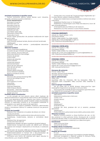 WWW.GHIDULPRIMARIILOR.RO JUDE%u021aUL HARGHITA / 397Activitati economice si specifice zonei:Factorii economici pentru ora%u0219ul Borsec sunt: industria, serviciile, comer%u021bul %u0219i turismul (balnear )Firme reprezentative:Romaqua Group SARomaqua Serv SARomaqua Prest SAFontana Balneo SrlPANFERANTO SRLMAROPLAST SRLGIM PREST SERV SRLDezvoltare Urban%u0103 SRLProduc%u0103tori locali:Mircea Oprea (produc%u0103tor de produse tradi%u021bionale din lapte de vac%u0103 %u0219i oaie)Produse locale:Ap%u0103%u00a0mineral%u0103, produse lactate, diverse articole handmadeMe%u0219te%u0219ugari: kARakTer (Casa artei creative %u2013 produse/piese decorative handmade)Obiective turistice:Centru FONTANA Spa&BalneoIzvoarele de ape minerale carbogazoaseZona carstic%u0103 %u201eScaunul Rotund%u201dRezerva%u021bia Botanic%u0103 H%u00e1rmasligetPe%u0219tera de ghea%u021b%u0103Grota Ur%u0219ilorPe%u0219tera de stalactitePoiana Z%u00e2nelorCariere de travertinCetatea Bufni%u021belorP%u00e2rtia de Schi Speran%u021baPista de bob de var%u0103Baia de SoareMuzeul Apelor MineraleIzvorul Str%u0103vechi (Mofeta)Biserica Ortodox%u0103 (veche)Evenimente:Petrecere de carnaval (Farsangi B%u00e1l)Concurs de Atelaje CanineSlan%u0103FestZiua Copilului (1 Iunie)CeaunFestSMARTFESTFestivalul RANDOMZilele Ora%u0219ului BorsecBorsecfest %u2013 Festivalul NostalgicEvenimente/concursuri sportive Serb%u0103ri de iarn%u0103Facilit%u00e3%u0163i oferite investitorilor:La ora actual%u0103, cel mai atractiv sector oferit mediului de afaceri/investitorilor %u00een ora%u0219ul Borsec este turismul, dat fiind faptul c%u0103, %u00een luna decembrie 2022 s-a deschis noul Centru FONTANA Spa&Balneo. Prin realizarea acestei investi%u021bii cre%u0219te atractivitatea ora%u0219ului ca destina%u021bie turistic%u0103 %u0219i se %u00eencurajeaz%u0103 %u00eenvesti%u021biile %u00een amenajarea unor spa%u021bii de cazare %u0219i de agrement. Pentru a veni %u00een spijinul posibililor investitori, administra%u021bia local%u0103 a concesionat terenuri %u00een vederea construirii de pensiuni turistice.Proiecte de investi%u0163ii:Realizare Parc industrial %u0219i Incubator de afaceri, str. MineiConstruire parc%u0103riReabilitarea spa%u021biilor publice dintre blocurile de locuin%u021beReabilitarea, modernizarea, dotarea %u0219i extinderea Bazei SportiveRealizare Parc de agrementConstruirea bazin de %u00eenotReabilitarea re%u021belelor de ap%u0103 %u0219i canalizare (Anghel Saligny)Modernizarea transportului public de c%u0103l%u0103tori prin achizi%u021bia de mijloace de transport nepoluante (2 microbuze, 2 autobuze) (PNRR)Construirea de locuin%u021be nZEB plus pentru tineri/locuin%u021be de serviciu pentru speciali%u0219tii din s%u0103n%u0103tate %u0219i %u00eenv%u0103%u021b%u0103m%u00e2nt (PNRR)Elaborare/actualizare %u00een format GIS a documenta%u021biilor de amenajare a teritoriului %u0219i de planificare urban%u0103 (PNRR)%u00cenfiin%u021barea unui centru de colectare prin aport voluntar %u00een ora%u0219ul Borsec, jud., Harghita (PNRR)Construirea unui num%u0103r de 7 insule ecologice digitaizate, tip 1 %u00een ora%u0219ul Borsec, jude%u021bul%u00a0Harghita (PNRR)Proiect de modernizare a echipamentelor %u0219i tehnicii de calcul a prim%u0103rieiReabilitare Pavilion Izvor nr. 10 (Kossuth)Reabilitare %u0219i reamenajare zona Pie%u021bei de sta%u021biune %u0219i izvor de ap%u0103 mineral%u0103 adiacentAmenajarea parcului Millenium din sta%u021biune Realizarea unui Parc tematic %u00een zona Poiana Z%u00e2nelorCOMUNA BR%u0102DE%u015eTIAdres%u0103: str. Petofi Sandor , nr.14Cod po%u0219tal: 537025Telefon: 0266-245001; Fax: 0266-245001; Adresa de e-mail: bradesti@hr.e-adm.roURL: http://www.fenyedkozseg.ro/COMUNA C%u0102P%u00c2LNI%u0162AAdres%u0103: Principal%u0103, nr. 352Cod po%u0219tal: 537030Telefon: 0266-247601; Fax: 0266-247524; Adresa de e-mail: primca@kabelkon.ro, primca@kabelkon.roURL: https://www.kapolnasfalu.ro/COMUNA C%u00c2R%u0162AAdres%u0103: Principal%u0103, nr. 159Cod po%u0219tal: 537035Telefon: 0266-378005; Fax: 0266-378320; Adresa de e-mail: primariacirta@gmail.comURL: www.primariacirta.roPersoane din primarie:Primar: G%u00e1bor TiborSecretar General: Karda Mel%u00e1niaContabil: Marton EmeseSate %u00een administra%u021bie:C%u00e2r%u0163a, IneuSuprafa%u021ba:%u00a0 8115 ha; Intravilan:%u00a0 190 ha; Extravilan:%u00a0 7925 ha; Popula%u021bia:%u00a0 2527; Gospod%u0103rii:%u00a0 1056; Locuin%u021be:%u00a0 1256; Gr%u0103dini%u021be:%u00a0 2; %u0218coli:%u00a02; Cum se ajunge in localitate:De pe %u0219osea DN 12 (E578) dinspre Miercurea-Ciuc spre Gheorghieni dup%u0103 22 km se ajunge %u00een comuna C%u00e2r%u021baDe pe %u0219osea DN 12 (E578) dinspre Gheorghieni spre MiercureaCiuc dup%u0103 34 km se ajunge %u00een comuna C%u00e2r%u021baActivitati economice si specifice zonei:Agricultur%u0103Exploatare %u0219i prelucrare a lemnuluiTurism ruralPrest%u0103ri serviciiComer%u021bIndustrieMe%u0219te%u0219uguriProduse locale:Produse din l%u00e2n%u0103, produse din lut %u0219i ceramic, produse alimentareMe%u0219te%u0219ugari: Prelucrarea l%u00e2nii, prelucrarea lutului (ol%u0103ri), prelucrarea c%u0103rniiObiective turistice:Biserica romano-catolic%u0103 cu l%u0103ca%u0219 fortificat din sec. al XIVlea, construit %u00een stilul goticului t%u00e2rziu. %u00cenconjurat de o incint%u0103 fortificat%u0103 de plan inelar, cu turn de poart%u0103 protejat de un zid scut. %u00cen biseric%u0103 se p%u0103streaz%u0103 o cristelni%u021b%u0103 %u0219i un tabernacol gotic.Evenimente:Zilele Comunei C%u00e2r%u021ba Concerte de fanfar%u0103Facilit%u00e3%u0163i oferite investitorilor:Terenuri pentru construc%u0163ii industrialeTurism ruralProiecte de investi%u0163ii:%u00cen curs:Modernizare drum local spre Trup Madicsa (Anghel Saligny)Renovare energetic%u0103 a cl%u0103dirilor publice %u00een comuna C%u00e2r%u021ba, jude%u021bul%u00a0Harghita, etapa I. Prim%u0103ria (PNRR)