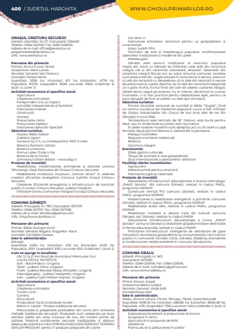 400 / JUDE%u021aUL HARGHITA WWW.GHIDULPRIMARIILOR.ROORA%u0218UL CRISTURU SECUIESCAdres%u0103: Libert%u0103%u0163ii, Nr.27; Cod po%u0219tal: 535400Telefon: 0266-242190; Fax: 0266-206012; Adresa de e-mail: office@keresztur.ropolgarmester@keresztur.roURL: www.keresztur.roPersoane din primarie:Primar:%u00a0Koncz Hunor J%u00e1nosViceprimar: Klein LaszloSecretar General: V%u00e1ri FerenczContabil: Farkas MariaSuprafa%u021ba:%u00a0 5395 ha; Intravilan:%u00a0 617 ha; Extravilan:%u00a0 4778 ha; Popula%u021bia:%u00a0 10370; Gospod%u0103rii:%u00a0 3339; Locuin%u021be:%u00a0 3550; Gr%u0103dini%u021be:%u00a0 6; %u0218coli:%u00a04; Licee:%u00a03; Activitati economice si specifice zonei:Agricultur%u0103Cre%u015fterea animalelor%u00centreprinderi mici %u015fi mijlociiActivit%u0103%u0163i independente %u015fi familiare Fabricarea mobileiConstruc%u0163iiComer%u0163Prelucrarea c%u0103rniiPrelucrarea lapteluiFabricarea o%u0163elurilor speciale%u00a0Obiective turistice:Muzeul B%u0103ile S%u00f3sk%u00fatCastelul UgronConacul Gy rf s, cu miniexpozitia Petfi S ndorBiserica Romano CatolicBiserica UnitarianPomul Lalea (Tulip n Fa)Biserica de la IclceniGimnaziul Orban Balazs - www.obg.roProiecte de investi%u0163ii:Reabilitarea, modernizarea, extinderea %u0219i dotarea Liceului Tehnologic Zeyk Domokos din Ora%u0219ul Cristuru SecuiescReabilitarea imobilului muzeului ,,Molnar Istvan%u201d %u00een vederea cre%u0219terii eficien%u021bei energetice Conacul Gy%u00e1rf%u00e1s Ora%u0219ul Cristuru SecuiescCre%u0219terea Eficien%u021bei energetice a Infrastructurii de iluminat public %u00een ora%u0219ul Cristuru Secuiesc, jude%u021bul Harghita %u00cenfiin%u021bare Centru Comunitar Integrat %u00een ora%u0219ul Cristuru SecuiescCOMUNA D%u0102NE%u015eTIAdres%u0103: Principal%u0103, nr. 781; Cod po%u0219tal: 537070Telefon: 0266-327011; Fax: 0266-327168; Adresa de e-mail: danfalva@yahoo.comURL: http://www.danfalva.roPersoane din primarie:Primar: B%u0151jte Csongor Ern%u0151Secretar General: Bog%u00e1cs Angyalka- KlaraContabil: G%u00e1l Ildik%u00f3%u00a0OrsalyaSate %u00een administra%u021bie:D%u0103ne%u015ftiSuprafa%u021ba:%u00a0 6336 ha; Intravilan:%u00a0 236 ha; Extravilan:%u00a0 6100 ha; Popula%u021bia:%u00a02291; Gospod%u0103rii:%u00a0930; Locuin%u021be:%u00a0822; Gr%u0103dini%u021be:%u00a01; %u0218coli:%u00a02; Cum se ajunge in localitate:DN 12, la 21 km Nord de Municipiul Miercurea CiucLOCALIT%u0102%u021aILE %u00ceNFR%u0102%u021aITESolt - B%u00e1cs-Kiskun, UngariaTevel - jude%u021bul Tolna, UngariaF%u00fcz%u00e9r -jude%u021bul Borsod-Aba%u00faj-Zempl%u00e9n, UngariaMarcalgergelyi - jude%u021bul Veszpr%u00e9m, Ungaria Iv%u00e1n - jude%u021bul Gy%u0151r-Moson-Sopron, UngariaActivitati economice si specifice zonei:Agricultur%u0103Cre%u015fterea animalelorTurism ruralComer%u0163Silvicultur%u0103Produc%u0103tori locali %u0219i produse locale:B%u00e1lint A. L%u00e1szl%u00f3 - Produs tradi%u021bional secuiescPrelucrarea %u015fi prepararea produselor din carne prin utilizarea metode tradi%u0163ionale secuie%u015fti. Produsele sunt preparate pe baza vechilor re%u021bete din zona Ciucului de Sus, din materii prime de calitate, folosind condimente naturale tradi%u0163ionale. A ob%u0163inut dreptul de utilizare a m%u0103rcii PRODUS SECUIESC/SZ%u00c9KELY TERM%u00c9K/SEKLER PRODUKT pentru 7 produse preparate din carneVizi Jeno I.I.Fabricarea articolelor ceramice pentru uz gospod%u0103resc %u0219i ornamentalSzasz Judith PFAFormator de arte %u0219i me%u0219te%u0219uguri populare, confec%u021bionarea obiectelor tradi%u021bionale %u0219i moderne din pieleMe%u0219te%u0219ugari:D%u0103ne%u0219ti este centrul tradi%u021bional al%u00a0 ceramicii populare negre%u00a0 din zon%u0103. La D%u0103ne%u0219ti se %u00eent%u00e2lnesc vase at%u00e2t din ceramic%u0103 neagr%u0103 c%u00e2t %u0219i din ceramic%u0103 coloratat%u0103, teracot%u0103. Obiectele din ceramica neagr%u0103 f%u0103cute aici au adus renume comunei. Acestea sunt prelucrate din%u00a0 argila extras%u0103 %u00een zona estic%u0103 a satului, precum %u0219i cele din teracot%u0103 cu deosebirea c%u0103 la cele din teracot%u0103 e nevoie de prelucrare la cuptor deschis, iar la cele din ceramic%u00e3 neagr%u0103 de un cuptor %u00eenchis, fumul fiind cel care d%u0103 vaselor culoarea neagr%u0103. Oalele devin negre pe exterior, nu %u00een interior, devenind nu numai frumoase, ci si mai practice pentru depozitarea apei, pentru c%u0103 porii astupa%u021bi de fum ai oalelor nu las%u0103 apa s%u0103 treac%u0103.%u00a0Obiective turistice:Printre atrac%u0163iile comunei se num%u0103r%u0103 %u015fi B%u0103ile %u201cDug%u00e1s%u201d, fiind un centru cunoscut de medicin%u0103 popular%u0103. Locul a fost %u00eenfiin%u0163at de Corpul industria%u015filor din Ciucul de Sus (mai ales de cei din D%u0103ne%u015fti) %u00een anul 1926.Temperatura apei termale de 18%u00b0 Celsius, este bun%u0103 pentru b%u0103ut, sau %u00een vindecarea anumitor boli reumatice.%u00cen zilele noastre musafirii sunt a%u015ftepta%u0163i aici cu 10 cade cu ap%u0103 termal%u0103, dou%u0103 piscine libere %u015fi o caban%u0103 de 14 persoane. Peisajul %u00eenc%u00e2nt%u0103torRegiune montan%u0103 nedistrus%u0103BisericaCeramica neagr%u0103Evenimente:Zilele gastro-culturaleT%u00e2rgul de animale %u0219i ziua gospodarilorZiua interna%u021bional%u0103 a persoanelor v%u00e2rstniceFacilit%u00e3%u0163i oferite investitorilor:AgroturismMaterie prim%u0103 pentru ceramic%u0103 Fabricarea %u0163iglei %u015fi c%u0103r%u0103mid%u0103Proiecte de investi%u0163ii:Dezvoltarea infrastructurii educa%u021bionale a liceului tehnologic %u201ePetofi %u0218andor%u201d din comuna D%u0103ne%u0219ti, realizat %u00een cadrul PNDL, programul MDRAPConstruire remiz%u0103%u00a0 PSI comuna D%u0103ne%u0219ti, realizat %u00een cadrul PNDL, programul MDRAPModernizarea %u0219i reabilitarea energetic%u0103 a prim%u0103riei comunei D%u0103ne%u0219ti, realizat %u00een cadrul PNDL, programul MDRAPReabilitarea str%u0103zii Reh, realizat %u00een cadrul PNDL, programul MDRAPRea