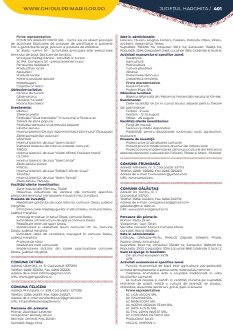 WWW.GHIDULPRIMARIILOR.RO JUDE%u021aUL HARGHITA / 401Firme reprezentative:COUNTRY BAKERY PROD SRL - Firma are ca obiect principal de activitate fabricarea de produse de panifica%u021bie %u0219i patiserie %u00eentr-o gam%u0103 foarte larg%u0103, precum %u0219i produse de cofet%u0103rieSc Bodo %u2013Lemn Srl - activitatea principala este prelucrarea lemnului de brad, fabricare de lambriuSC.Hajnal Csillag Panzio - activit%u0103%u021bi %u00een turismSc IPA. Company Srl - prelucrarea lemnuluiPensiunea SziklakertProduc%u0103tori locali:ApicultoriProduse locale:Miere %u0219i produse apicoleMe%u0219te%u0219ugari:Cioplitori %u00een lemn%u00a0Obiective turistice:Centrul de turismObservatorulF%u00e2nt%u00e2na %u201cUrusos%u201dPoiana NarciselorEvenimente:DEALUZilele prunelorFestivalul %u201cZiua Narciselor%u201d %u00een luna mai a fiecarui anTab%u0103r%u0103 de dans popularFestivalul dansului %u0219i c%u00e2ntecului popularL%u0103satul seculuiHramul bisericii: De ziua %u201cAdormirii Maicii Domnului%u201d (15 august)Zilele pompierilor voluntariS%u00c2NCRAIHramul bisericii: de ziua %u201cSzent Istv%u00e1n%u201d%u00cen%u0103l%u021barea bradului de cr%u0103ciun %u00eensatele comuneiTIBODHramul bisericii: de ziua %u201cVizitei Sfintei Fecioare Maria%u201dULCANIHramul bisericii: de ziua %u201cSzent Antal%u201dZilele satului UlcaniF%u00ceNCELHramul bisericii: de ziua %u201c%u00cen%u0103l%u021b%u0103rii Sfintei Cruci%u201dT%u0102MA%u0218UHramul bisericii: de ziua %u201cSzent Tam%u00e1s%u201d Zilele satului T%u0103ma%u0219uFacilit%u00e3%u0163i oferite investitorilor:Zone industriale (T%u0103ma%u0219u, Tib%u00f3d)Obiective industriale de v%u00e2nzare (de %u00eenchiriat) specifice prelucr%u0103rii lemnului, introducere industrii mici %u0219i mijlociiProiecte de investi%u0163ii:Reabilitare gr%u0103dini%u0163a de copii S%u00e2ncrai, comuna Dealu, jude%u0163ul Harghita%u00cenfiin%u0163area casei me%u015fte%u015fugurilor %u00een satul Dealu, comuna Dealu, jude%u0163ul HarghitaAmenajare trotuar %u00een satul Tibod, comuna DealuExtinderea infrastructurii de ap%u0103 in comuna DealuReabilitare teren de sport DealuModernizare %u0219i reabilitare drum comunal DC 34, comuna Dealu, judetul HarghitaExtindere re%u021bea de canalizare menajer%u0103 %u00een comuna Dealu, jude%u0163ul HarghitaProiecte de viitorReabilitare cas%u0103%u00a0comunal%u0103Modernizarea str%u0103zilor din satele apartinatoare comunei Dealu, jude%u021bul HarghitaCOMUNA DITR%u0102UAdres%u0103: Libert%u0103%u0163ii, nr. 9; Cod po%u0219tal: 537090Telefon: 0266-353130; Fax: 0266-353231; Adresa de e-mail: clditrau@gmail.comURL: www.gyergyoditro.roCOMUNA FELICENIAdres%u0103: Principal%u0103, nr. 208; Cod po%u0219tal: 537095Telefon: 0266-245311; Fax: 0266-245327; Adresa de e-mail: conslocfeliceni@gmail.comURL: https://felsoboldogfalva.ro/Persoane din primarie:Primar: Zsombori LeventeViceprimar: Borbely IstvanSecretar General: Kiss Zolt%u00e1nContabil: Nagy%u00a0IrmaSate %u00een administra%u021bie:Feliceni, T%u0103ureni, Hoghia, For%u021beni, Cire%u0219eni, Poloni%u021ba, O%u021beni,%u00a0V%u0103leni, Arv%u0103%u021beni, Alexandri%u0163a, TeleacSuprafa%u021ba:%u00a0 7959,90 ha; Intravilan:%u00a0 291,3 ha; Extravilan:%u00a0 7668,6 ha; Popula%u021bia:%u00a03294; Gospod%u0103rii:%u00a02463; Locuin%u021be:%u00a01534; Gr%u0103dini%u021be:%u00a06; %u0218coli:%u00a06; Activitati economice si specifice zonei:ZootehnieAgricultur%u0103Pomicultur%u0103Cultura plantelorV%u00e2natul Prelucrarea lemnuluiCre%u0219terea animalelorFirme reprezentative:Koala Prod SRLProlem Plast SRLObiective turistice:Biserica reformat%u0103 din Feliceni %u0219i For%u021beni (din secolul al XIV-lea)Evenimente:Zilele localit%u0103%u0163ii se %u0163in %u00een cursul anului, separat pentru fiecare sat%u00a0apar%u021bin%u0103toarFor%u021beni - 2 iulieFeliceni - 12-13 augustTeleac - 26 augustFacilit%u00e3%u0163i oferite investitorilor:For%u0163%u0103 de munc%u0103Terenuri %u015fi cl%u0103diri disponibilePosibilit%u0103%u0163i pentru dezvoltarea turismului rural, agroturism, ecoturismProiecte de investi%u0163ii:Proiect privind canalizarea comuneiProiect privind modernizare drumuri de interes localProiect privind modernizarea c%u0103minului cultural din Feliceni %u0219i dotarea c%u0103minelor culturale din Feliceni, Teleac %u0219i O%u021beni- finalizatCOMUNA FRUMOASAAdres%u0103: Mih%u0103lieni, nr. 7; Cod po%u0219tal: 537115Telefon: 0266- 325282; Fax: 0266-325203; Adresa de e-mail: frumoasahr@yahoo.comURL: www.szepviz.euCOMUNA G%u0102L%u0102U%u0162A%u015eAdres%u0103: Str. Centru, nr. 1Cod po%u0219tal: 537120Telefon: 0266-345604; Fax: 0266-345712; Adresa de e-mail: consgalautas@gmail.comgalautas@hr.e-adm.roURL: www.primariagalautas.roPersoane din primarie:Primar: Radu %u0162%u0103ranViceprimar: %u00a0Ioan %u021a%u0103ranSecretar General: Monica Camelia MorarContabil: Ileana N%u0103d%u0103%u015fanSate %u00een administra%u021bie:G%u0103l%u0103u%u0163a%u015f, G%u0103l%u0103u%u0163a%u015f-P%u00e2r%u00e2u, Preluc%u0103,%u00a0 Z%u0103pode,%u00a0 Tole%u015feni, Plopi%u015f, Nuteni, Dealu%u00a0ArmanuluiSuprafa%u021ba:%u00a0 3042 ha; Intravilan:%u00a0 352,80 ha; Extravilan:%u00a0 2689,20 ha; Popula%u021bia:%u00a02300; Gospod%u0103rii:%u00a01034; Locuin%u021be:%u00a0968; Gr%u0103dini%u021be:%u00a03; %u0218coli:%u00a02; Cum se ajunge in localitate:Din drumul european E578CFRActivitati economice si specifice zonei:Func%u021bia economic%u0103 de baz%u0103 este agricultura zoo-pastoral%u0103, urmat%u0103 de exploatarea %u0219i prelucrarea materialului lemnosCre%u0219terea animalelor este o ocupa%u021bie tradi%u021bional%u0103 %u00een via%u021ba locuitorilor comuneiSe cultiv%u0103 cereale %u0219i cartofi %u00een cantit%u0103%u021bi minime pe suprafe%u021be restr%u00e2nse de arabil; exist%u0103 o cultur%u0103 de lavand%u0103; se produc: cherestea, du%u0219umea, lambriuri, grinzi, %u0219ipci %u0219i scaune.Firme reprezentative:SC LIGNUSCON SRLSC ITALMOB SRLSC BIMEXCOM SRLSC ACERIS DESIGN TEAM SRLSC ARTE FUSTE SRLSC T