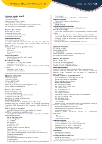WWW.GHIDULPRIMARIILOR.RO JUDE%u021aUL IA%u0218I / 453COMUNA VALEA SEAC%u0102Adres%u0103: Principal%u0103Cod po%u0219tal: 707570Telefon: 0232-714844, 714949; Fax: 0232-714844, 714949; Adresa de e-mail: secretariat@primariavaleaseaca.roURL: https://primariavaleaseaca.ro/website/Persoane din primarie:Primar: Neculai%u00a0Miron%u00a0Viceprimar: Mihai Cre%u021buSecretar General: Valeriu%u00a0Nistor%u00a0Contabil:%u00a0Cocu%u0163a%u00a0Doroftei%u00a0Sate %u00een administra%u021bie:Valea Seac%u0103, Con%u0163e%u015fti, TopileSuprafa%u021ba:%u00a0 3587 ha; Intravilan:%u00a0 324 ha; Extravilan:%u00a0 3263 ha; Popula%u021bia:%u00a0 6150; Gospod%u0103rii:%u00a0 1971; Locuin%u021be:%u00a0 1870; Gr%u0103dini%u021be:%u00a0 3; %u0218coli:%u00a01; Licee:%u00a01; Activitati economice si specifice zonei:Agricultur%u0103Apicultur%u0103Cre%u015fterea animalelorComer%u0163%u00a0Obiective turistice:Schitul Sf%u00e2ntul Dosoftei Valea Seac%u0103Tab%u0103ra C%u0103prioaraProiecte de investi%u0163ii:Asfaltare DC 127 Valea Seac%u0103-TopileAduc%u0163iune ap%u0103 canalizareReabilitarea celor 3 %u015fcoli din comun%u0103%u00a0 Topile, Valea Seac%u0103 %u015fi Con%u0163e%u015ftiAduc%u021biune retea de gazReabilitare iluminat publicCOMUNA V%u00c2N%u0102TORIAdres%u0103: Principal%u0103Cod po%u0219tal: 707575Telefon: 0232-715003; Fax: 0232-715003; Adresa de e-mail: primariavinatori@yahoo.comURL: www.primariavanatori.roPersoane din primarie:Primar:%u00a0Constantin Lupu%u00a0Viceprimar: C%u0103t%u0103lin Voicu%u00a0Secretar General: Gheorghe Adrian Ichim%u00a0Contabil: Dumitru%u00a0Muraru%u00a0Administrator public: Costel NechitaSate %u00een administra%u021bie:V%u00e2n%u0103tori, H%u00e2rtoape,%u00a0Gura B%u00e2dili%u0163ei,%u00a0Vl%u0103dnicu%u0163,%u00a0Crive%u015ftiSuprafa%u021ba:%u00a0 5207 ha; Intravilan:%u00a0 733,52 ha; Extravilan:%u00a0 4473,48 ha; Popula%u021bia:%u00a0 4678; Gospod%u0103rii:%u00a0 1897; Locuin%u021be:%u00a0 1625; Gr%u0103dini%u021be:%u00a0 5; %u0218coli:%u00a04; Cum se ajunge in localitate:Accesul %u00een comun%u0103%u00a0se face prin DJ.208 N %u0219i DJ.208 IActivitati economice si specifice zonei:Activit%u0103%u021bile economice %u00een principal sunt agricultura ,comer%u021bul %u0219i prest%u0103rile de serviciiFirme reprezentative:SC. Casi Mag SRLSC .Tivia SRLSC. Suni SRLProduc%u0103tori locali:Nechita TeodorGlodeanu Florin-produse apicoleTarcan DanielChita Ilie si Adascalitei Pavel-produc%u0103tori legumeMina Ciprian produc%u0103tor de fructe(c%u0103p%u0219uni,mure,afine,etc.)Asoltanei Marian VasileGavriloaia IoanAsoltanei Vasile-cresc%u0103tori de ovine %u0219i bovineProduse locale:Produse agricole, legumicole, apicole, fructe, produse lactateMe%u0219te%u0219ugari:Prelucrarea lemnului,activit%u0103%u021bi %u00een construc%u021bii,etc.Obiective turistice:Parcul eolian de pe Dealul ChicereaEvenimente:Zilele comuneiFacilit%u00e3%u0163i oferite investitorilor:Disponibilitatea de a acorda facilit%u0103%u021bi fiscaleProiecte de investi%u0163ii:Construire %u0219i dotare C%u0103min cultural %u00een satul Crive%u0219ti,comuna V%u00e2n%u0103toriExtindere re%u021bea de ap%u0103%u00a0%u00een satele H%u00e2rtoape %u0219i Gura B%u0103dili%u021beiConstruire teren de sport %u00een satul H%u00e2rtoape,comuna V%u00e2n%u0103tori%u00cenfiin%u021bare re%u021bea de distribu%u021bie a gazelor naturale pe raza comunei V%u00e2n%u0103toriModernizare drumuri de interes local prin CNICOMUNA VICTORIACod po%u0219tal: 707580Telefon: 0232-295120; Fax: 0232-295120; Adresa de e-mail: primariavictoria@yahoo.comURL: http://comunavictoria.ro/Persoane din primarie:Primar: Daniel Cre%u0163uViceprimar: Gheorghe ZahariaSecretar General: M%u0103d%u0103lina Ro%u0219caContabil: Dumitru Daniel Ap%u0103v%u0103loaieSate %u00een administra%u021bie:%u0218endreni, Fr%u0103suleni, Sculeni, Victoria, St%u00eenca, Icu%u0219eni, LuceniSuprafa%u021ba:%u00a0 6216 ha; Intravilan:%u00a0 767,3 ha; Extravilan:%u00a0 5448,7 ha; Popula%u021bia:%u00a0 4282; Gospod%u0103rii:%u00a0 2671; Locuin%u021be:%u00a0 1772; Gr%u0103dini%u021be:%u00a0 4; %u0218coli:%u00a04; Licee:%u00a01; Activitati economice si specifice zonei:Agricultur%u0103 (cultura mare, legumicultur%u0103)Zootehnie (cre%u015fterea animalelor)Construc%u021bii de mici amploare Firme Reprezentative:S.C. EVI BLOSSOM S.R.L.S.C. PREST SERV IMPEX S.R.L.S.C. VANBET S.R.L.S.C. AGRICOLA 96 S.A.S.C. LA OLARU S.R.L.S.C. RAZVANMAF S.R.L.II.HODOROGEANU IOAN PFA PONCU CONSTANTINS.C. HELLEN WEAR S.R.L.S.C. BRICONE S.R.L.S.C. AQUA PARTY S.R.L.Oportunit%u0103%u0163i:Evolu%u021bia zonei Metropolitane Ia%u0219i %u0219i apartenen%u021ba Comunei Victoria la zona Metropolitan%u0103%u00a0din anul 2004Apropierea de Aeroportul din Ia%u0219iRe%u021bea de drumuri comunale (betonate)Municipiul Ia%u0219i la 26 KmTerenuri pentru construire locuin%u021be cu urm%u0103toarele oportunit%u0103%u021bi:- ap%u0103- canalizare- telefonie %u0219i internetObiective turistice:Biserica %u201eSf. Nicolae%u201d%u00a0din satul LuceniBiserica %u201eSf. Mihail %u0219i Gavril%u201d%u00a0din satul SculeniRezerva%u021bia Natura 2000 - %u201eTeiva-Visina%u201dP%u0103durea de stejari seculari %u201eMedeleni%u201dMonumentul Eroilor- Stanca RoznovanuEvenimente:Ziua Eroilor %u2013 22 iunie Ziua comunei %u2013 22 iunieFacilit%u00e3%u0163i oferite investitorilor:Re%u0163ea de ap%u0103 curent%u0103Re%u021bele de drumuri locale, comunale, na%u0163ional- europene %u0219i de exploatare (%u00een stare foarte bun%u0103)