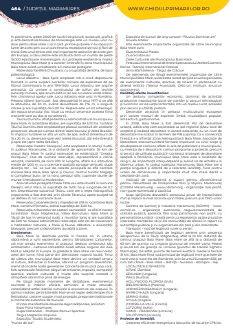 464 / JUDE%u021aUL MARAMURE%u0218 WWW.GHIDULPRIMARIILOR.RO%u00een patrimoniu peste 2.600 de lucr%u0103ri de pictur%u0103, sculptur%u0103, grafic%u0103 %u015fi art%u0103 decorativ%u0103.Muzeul de Mineralogie%u00a0este un muzeu unic nu doar pentru Baia Mare ci %u015fi %u00een %u0163ar%u0103, printre pu%u0163inele %u00een Europa %u015fi %u00een lume de acest gen, cu un patrimoniu excep%u0163ional de roci %u015fi flori de min%u0103. Este unul dintre cele mai importante obiective de acest gen din Europa, a c%u0103rui zestre este alc%u0103tuit%u0103 dintr-un num%u0103r de peste 15.000 e%u015fantioane mineralogice. Arii protejate existente la nivelul Municipiului Baia Mare %u015fi a zonelor limitrofe %u00cen zona Municipiului Baia Mare exist%u0103 urm%u0103toarele%u00a0arii naturale protejate:Rezerva%u0163ia fosilifer%u0103 Chiuzbaia, cu o suprafa%u0163%u0103 de 50ha, de tipul paleontologic%u0103.Lacul albastru - Baia Sprie%u00a0 amplasat %u00eentr-o mic%u0103 depresiune format%u0103 %u00een urma surp%u0103rii lucr%u0103rilor miniere de exploatare de pe filonul Domni%u015foara %u00een anii 1919-1920, Lacul Albastru are origine antropic%u0103. Ca urmare a con%u0163inutului de sulfuri din vechile excava%u0163ii miniere, apa acumulat%u0103 %u00een lac are o culoare verde intens. Prin chimismul apelor sale, Lacul Albastru este unic %u00een Rom%u00e2nia.Pe%u015ftera V%u0103lenii %u015eomcutei%u00a0%u00a0fost descoperit%u0103 %u00een anul 1977 %u015fi se afl%u0103 la altitudine de 30 m, av%u00e2nd dezvoltarea de 176 m, o singur%u0103 intrare %u015fi are suprafa%u0163a de 5.00 ha. Pe%u015ftera este un sit arheologic din epoca bronzului (loc ritual cu resturi ceramice acestea fiind motivele care au dus la ocrotirea ei).T%u0103ul lui Dumitru Aflat%u00a0pe teritoriul administrativ al municipiului Baia Mare, %u00een localitatea Blidari, are suprafa%u0163a de 3,00 ha. Turb%u0103ria T%u0103ul lui Dumitru este amplasat%u0103 pe platoul constituit din andezite piroxenice, situat pe culmea dintre Valea Sturului %u015fi Valea Brazilor. %u00cen mijlocul turb%u0103riei se afl%u0103 un ochi de ap%u0103, av%u00e2nd dimensiuni de 15 x 20 m, cu deversare spre vest (Valea Sturului), dar este drenat%u0103 %u015fi spre est (spre Valea Brazilor).Rezerva%u0163ia Creasta Coco%u015fului%u00a0%u00a0este amplasata %u00een Mun%u0163ii Gut%u00e2i, %u00een jude%u0163ul Maramure%u015f, la o distant%u0103 de aproximativ 35 km de ora%u015ful Baia Mare. %u00cen cadrul rezerva%u0163iei se eviden%u0163iaz%u0103 %u201dCreasta Coco%u015fului%u201d, care d%u0103 numele rezerva%u0163iei, reprezent%u00e2nd o colin%u0103 ascu%u0163it%u0103, crenelat%u0103, de circa 200 m lungime, aflat%u0103 la o altitudine medie de 1200 m, cu o orientare spa%u0163ial%u0103 aproape vertical%u0103, dup%u0103 direc%u0163ia NV - SE. La sud de creasta principal%u00e3 se afl%u00e3 centrele miniere Baia Mare, Baia Sprie %u015fi Cavnic, centrul turistic Mogo%u015fa %u015fi Complexul %u015euior, iar la nord, peisajul idilic cuprinde t%u0103urile de munte Chendroaiei %u015fi Mor%u0103renilor.Aria natural%u0103 protejat%u0103 Cheile T%u0103tarului%u00a0este situat%u0103 %u00een comuna Dese%u015fti, satul Mara, %u00een suprafa%u0163%u0103 de 15,00 ha %u015fi lungimea de 0,7 km. Depresiunea vulcanic%u0103 T%u0103taru, care are o re%u0163ea hidrografic%u0103 important%u0103, a fost drenat%u0103 prin Cheile T%u0103tarului, apele sculpt%u00e2nd un defileu %u00een roci vulcanice dure.Rezerva%u0163ia Coloanele de la Limpedea%u00a0se afl%u0103 %u00een localitatea Baia Mare, cartierul Ferneziu, av%u00e2nd suprafa%u0163a de 3.00 ha.Rezerva%u0163ia Arboretelor de castani comestibili%u00a0%u00a0%u00a0se afl%u0103 %u00een nordul localit%u0103%u0163ilor T%u0103u%u0163ii M%u0103gher%u0103u%u015f, Valea Borcutului, Baia Mare %u015fi T%u0103u%u0163ii de Sus %u00een versantul sudic a mun%u0163ilor Igni%u015f %u015fi are suprafa%u0163a de 500 ha. Scopul administr%u0103rii rezerva%u0163iei este cel de conservare a habitatelor naturale, a florei %u015fi faunei s%u0103lbatice, a diversit%u0103%u0163ii biologice, precum %u015fi dezvoltarea durabil%u0103 a zonei.Evenimente:Baia Mare %u00ee%u0219i deschide por%u021bile %u00een fiecare an, %u00een ultima s%u0103pt%u0103m%u00e2n%u0103 a lunii septembrie, pentru S%u0103rb%u0103toarea Castanelor, cel mai amplu eveniment al ora%u0219ului, dedicat simbolului s%u0103u emblematic %u2013 castanul comestibil. Acest arbore, originar din Asia Mic%u0103 %u0219i adaptat %u00een Europa, %u00ee%u0219i g%u0103se%u0219te la Baia Mare cel mai nordic areal din lume, fiind parte din identitatea noastr%u0103 local%u0103. Timp de c%u00e2teva zile, municipiul Baia Mare devine un veritabil centru al culturii, distrac%u021biei %u0219i tradi%u021biei, oferind un program diversificat, menit s%u0103 %u00eenc%u00e2nte toate genera%u021biile. Concerte de muzic%u0103 pop, rock, folk, spectacole folclorice, t%u00e2rguri de artizanat, expozi%u021bii, competi%u021bii sportive, ateliere culturale %u0219i multe alte surprize creeaz%u0103 o atmosfer%u0103 vibrant%u0103 %u0219i plin%u0103 de energie.Pe l%u00e2ng%u0103 aceste momente de s%u0103rb%u0103toare, evenimentul reune%u0219te %u0219i %u00eent%u00e2lniri oficiale, seminarii %u0219i mese rotunde, consolid%u00e2nd astfel rela%u021biile culturale %u0219i economice ale ora%u0219ului. %u00cen spiritul tradi%u021biei, pe str%u0103zile B%u0103ii Mari se vor reg%u0103si deliciile specifice festivalului: castane coapte, must proasp%u0103t, preparate tradi%u021bionale %u0219i momente autentice de bucurie.Printre manifest%u0103rile devenite deja tradi%u021bionale, amintim:Expo Flora Maramure%u0219Cupa Castanelor %u2013 Multiple Ramuri SportiveT%u00e2rgul Me%u015fterilor PopulariExpozi%u0163ia %u201dStudio Studen%u0163esc%u201cNunta de aur%u201dExpozi%u021bia de bunuri de larg consum %u201cRivulus Dominarum%u201dAnuala ArtelorAlte evenimente importante organizate de c%u0103tre Municipiul Baia Mare sunt:Ziua Artistului PlasticZiua Scrii