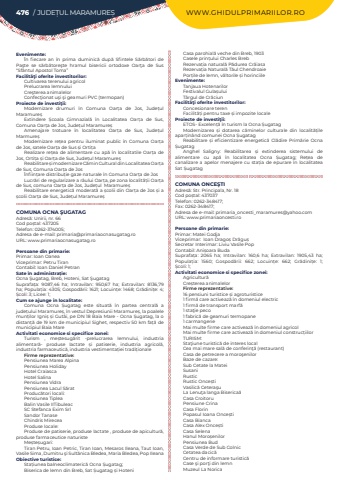 476 / JUDE%u021aUL MARAMURE%u0218 WWW.GHIDULPRIMARIILOR.ROEvenimente:%u00cen fiecare an%u00a0 %u00een prima duminic%u0103 dup%u0103 Sfintele S%u0103rb%u0103tori de Pa%u015fte se s%u0103rb%u0103tore%u015fte hramul bisericii ortodoxe Oar%u0163a de Sus %u201cSf%u00e2ntul Apostol Toma%u201dFacilit%u00e3%u0163i oferite investitorilor:Cultivarea terenului agricolPrelucrarea lemnuluiCre%u015fterea animalelorConfec%u0163ionat u%u015fi %u015fi geamuri PVC (termopan)Proiecte de investi%u0163ii:Modernizare drumuri %u00een Comuna Oar%u021ba de Jos, Jude%u021bul Maramure%u0219Extindere %u0218coala Gimnazial%u0103%u00a0 %u00een Localitatea Oar%u021ba de Sus, Comuna Oar%u021ba de Jos, Jude%u021bul Maramure%u0219Amenajare trotuare %u00een localitatea Oar%u021ba de Sus, Jude%u021bul Marmure%u0219Modernizare re%u021bea pentru iluminat public %u00een Comuna Oar%u021ba de Jos, satele Oar%u021ba de Sus %u0219i Orti%u021baRealizare re%u021bea de alimentare cu ap%u0103%u00a0 %u00een localitatile Oar%u021ba de Jos, Orti%u021ba %u0219i Oar%u021ba de Sus, Jude%u021bul Maramure%u0219Reabilitare %u0219i modernizare C%u0103min Cultural din Localitatea%u00a0Oar%u021ba de Sus, Comuna%u00a0Oar%u021ba de Jos%u00cenfiin%u021bare distribu%u021bie gaze naturale %u00een Comuna Oar%u021ba de JosLucr%u0103ri de regularizare a r%u00e2ului Oar%u021ba, pe zona localit%u0103%u021bii Oar%u021ba de Sus, comuna Oar%u021ba de Jos, Jude%u021bul%u00a0%u00a0Maramure%u0219Reabilitare energetic%u0103%u00a0moderat%u0103%u00a0a %u0219colii din Oar%u021ba de Jos %u0219i a %u0219colii Oar%u021ba de Sus, Jude%u021bul Maramure%u0219COMUNA OCNA %u015eUGATAGAdres%u0103: Unirii, nr. 66Cod po%u0219tal: 437205Telefon: 0262-374005; Adresa de e-mail: primaria@primariaocnasugatag.roURL: www.primariaocnasugatag.roPersoane din primarie:Primar: Ioan%u00a0OaneaViceprimar: Petru TiranContabil:%u00a0Ioan Daniel%u00a0Petran%u00a0Sate %u00een administra%u021bie:Ocna %u015eugatag, Breb, Hoteni, Sat %u015eugatagSuprafa%u021ba:%u00a0 9087,46 ha; Intravilan:%u00a0 950,67 ha; Extravilan:%u00a0 8136,79 ha; Popula%u021bia:%u00a04305; Gospod%u0103rii:%u00a01621; Locuin%u021be:%u00a01468; Gr%u0103dini%u021be:%u00a04; %u0218coli:%u00a03; Licee:%u00a01; Cum se ajunge in localitate:Comuna Ocna %u0218ugatag este situat%u0103 %u00een partea central%u0103 a jude%u021bului Maramure%u0219, %u00een vestul Depresiunii Maramure%u0219, la poalele mun%u021bilor Igni%u0219 %u0219i Gut%u00e2i, pe DN 18 Baia Mare - Ocna %u0218ugatag, la o distan%u021b%u0103 de 19 km de municipiul Sighet, respectiv 50 km fa%u021b%u0103 de municipiul Baia MareActivitati economice si specifice zonei:Turism , me%u0219tesug%u0103rit -prelucrarea lemnului, industria alimentar%u0103- produse lactate %u0219i patiserie, industria agricol%u0103, industria farmaceutic%u0103, industria vestimenta%u021biei tradi%u021bionaleFirme reprezentative:Pensiunea Marea AlpinaPensiunea HolidayHotel CraiascaHotel SalinaPensiunea VidraPensiunea Lacul S%u0103ratProduc%u0103tori locali:Pensiunea TipleaBalin Vasile IITibuleacSC Stefanca Exim SrlSandor TanaseChindris MireceaProduse locale:Produse de patiserie, produse lactate , produse de apicultur%u0103, produse farmaceutice naturisteMe%u0219te%u0219ugari: Tiran Petru, Ioan Petric, Tiran Ioan, Mesaros Ileana, Taut Ioan, Vasile Sima, Dumitru %u015fi Sult%u0103nica Bledea, Maria Bledea, Pop IleanaObiective turistice:Sta%u021biunea balneoclimateric%u0103%u00a0Ocna %u0218ugatag;Biserica de lemn din Breb, Sat %u0218ugatag %u0219i HoteniCasa parohial%u0103 veche din Breb, 1903Casele prin%u021bului Charles BrebRezerva%u021bia natural%u0103 P%u0103durea Cr%u0103iasaRezerva%u021bia Natural%u0103 T%u0103ul ChendroaiePor%u021bile de lemn, v%u00e2ltorile %u0219i horinciileEvenimente:Tanjaua HotenarilorFestivalul Gula%u0219uluiT%u00e2rgul de Cr%u0103ciunFacilit%u00e3%u0163i oferite investitorilor:Concesionare terenFacilit%u0103%u021bi pentru taxe %u0219i impozite localeProiecte de investi%u0163ii:ETOS- Excelen%u021b%u0103%u00a0%u00een turism la Ocna %u0218ugatagModernizarea %u0219i dotarea c%u0103minelor culturale din localit%u0103%u021bile apar%u021bin%u00e2nd comunei Ocna %u0218ugatagReabilitare %u0219i eficientizare energetic%u0103%u00a0 Cl%u0103dire Prim%u0103rie Ocna %u0218ugatag Anghel Saligny: Reabilitarea %u0219i extinderea sistemului de alimentare cu ap%u0103%u00a0 %u00een localitatea Ocna %u0218ugatag; Re%u021bea de canalizare a apelor menajere cu sta%u021bia de epurare %u00een localitatea Sat %u0218ugatagCOMUNA ONCE%u015eTIAdres%u0103: Str. Principala, Nr. 18Cod po%u0219tal: 437037Telefon: 0262-348417;Fax: 0262-348417; Adresa de e-mail: primaria_oncesti_maramures@yahoo.comURL: www.primariaoncesti.roPersoane din primarie:Primar: Matei GodjaViceprimar:%u00a0%u00a0Ioan Drago%u0219 Dr%u0103gu%u0219Secretar Interimar: Liviu Vasile Pop%u00a0Contabil: Ani%u0219oara BudaSuprafa%u021ba:%u00a0 2065 ha; Intravilan:%u00a0 160,6 ha; Extravilan:%u00a0 1905,43 ha; Popula%u021bia:%u00a0 1560; Gospod%u0103rii:%u00a0 662; Locuin%u021be:%u00a0 662; Gr%u0103dini%u021be:%u00a0 1; %u0218coli:%u00a01; Activitati economice si specifice zonei:Agricultur%u0103Cre%u0219terea animalelorFirme reprezentative:16 pensiuni turistice %u0219i agroturistice1 firm%u0103 care activeaz%u0103 %u00een domeniul electric1 firm%u0103 de transport marf%u01031 sta%u0163ie peco1 fabric%u0103 de geamuri termopane1 carmangerieMai multe firme care activeaz%u0103 %u00een domeniul agricolMai multe firme care activeaz%u0103 %u00een domeniul construc%u021biilorTURISM:Sta%u0163iune turistic%u0103 de interes localCea mai mare sal%u0103 de conferin%u0163%u0103 (restaurant)Casa de petrecere a moro%u015fenilorBaze de cazare:Sub Cetate la MateiSusaniRusticRustic Once%u0219tiVasilic%u0103 Cetera%u015fuLa Lenu%u0163a langa Biserica%u0103Casa CroitoruPensiune CrinaCasa FlorinPopasul Ioana Once%u0219tiCasa BiancaCasa Alex Once%u0219tiCasa SelenaHanul Moro%u0219enilorPensiunea BudCasa Verde de Sub ColnicCetatea dacic%u0103Centru de informare tur