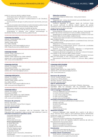 WWW.GHIDULPRIMARIILOR.RO JUDE%u021aUL MURE%u0218 / 503public %u00een comuna A%u021binti%u0219, jude%u021bul Mure%u0219Amenajare parcuri de joac%u0103 %u00een comuna A%u021binti%u0219Construire teren de sport multifunc%u021bional %u00een sat Cecalaca, comuna A%u021binti%u0219Construire teren de spor multifunc%u021bional %u00een sat Atintis, comuna Atinti%u0219Construire sediul administrativ al administra%u021biei publice locale %u00een localitatea%u00a0Atinti%u0219, comuna A%u021binti%u0219, jude%u021bu%u00a0Mure%u0219Renovare %u0219i dotare cabinet medical de familieConstruirea unei locuin%u021be de serviciu pentru medic familieAmenajarea %u0219i dotarea unui cabinet stomatologic %u00een localitatea%u00a0A%u021binti%u0219, comuna A%u021binti%u0219, jude%u021bul%u00a0Mure%u0219COMUNA BAHNEAAdres%u0103: 1 Decembrie 1918, nr. 50Cod po%u0219tal: 547055Telefon: 0265-455112; Fax: 0265-455028; Adresa de e-mail: bahnea@cjmures.roURL: https://www.comunabahnea.ro/COMUNA BANDAdres%u0103: T%u00e2rgu- Mure%u015fului nr.5Cod po%u0219tal: 547065Telefon: 0265-428403; Fax: 0265-428403; Adresa de e-mail: band@cjmures.roURL: www.comunaband.roCOMUNA BATO%u015eAdres%u0103: Principal%u0103, nr. 302Cod po%u0219tal: 547085Telefon: 0265-544212; Fax: 0265-544212; Adresa de e-mail: batos@cjmures.roCOMUNA B%u0102GACIUAdres%u0103: Principal%u0103, nr. 112Cod po%u0219tal: 547090Telefon: 0265-425611, 425714; Fax: 0265-425714; Adresa de e-mail: bagaciu@cjmures.roURL: www.primaria-bagaciu.roCOMUNA B%u0102LAAdres%u0103: Principal%u0103, nr. 240Cod po%u0219tal: 547095Telefon: 0265-339112; Fax: 0265-339229; Adresa de e-mail: bala@cjmures.roURL: www.primariabala.roPersoane din primarie:Primar: Ioan HuzaSecretar General: Cioloca Florin GrigoreContabil: Ienei Codru%u0163aSate %u00een administra%u021bie:B%u0103la, ErceaSuprafa%u021ba:%u00a0 2775 ha; Intravilan:%u00a0 420 ha; Extravilan:%u00a0 2355 ha; Popula%u021bia:%u00a0905; Gospod%u0103rii:%u00a0426; Locuin%u021be:%u00a0432; Gr%u0103dini%u021be:%u00a01; %u0218coli:%u00a02; Activitati economice si specifice zonei:Cultivarea p%u0103m%u00e2ntuluiCre%u0219terea animalelorTurism ruralPrelucrarea lemnuluiFirme reprezentative:Sc Bufet Bala SRLSc Marigab SRLSc Mobila Service SRLPFA Pol Teodora IoanaLa Poiata Retreat SRLProduc%u0103tori locali:Produse locale: Ca%u0219cavalul ,,Maradona%u201dMe%u0219te%u0219ugari:Vlad Sandor-me%u0219ter %u00een sculptarea lingurilor de lemnObiective turistice:Ansamblul Bisericii Reformate %u2013 Monument IstoricEvenimente:T%u00e2rgul de var%u0103 - a doua duminic%u0103 din luna iulie Zilele %u015fcolii - maiFacilit%u00e3%u0163i oferite investitorilor:Conform legisla%u0163iei %u00een vigoare: Spa%u0163ii de %u00eenchiriat For%u0163%u0103 de munc%u0103 calificat%u0103 %u00een diferite meserii Sprijin din partea Consiliului Local, a speciali%u015ftilor din comuna B%u0103la, primarului %u015fi a viceprimarului pe teme concreteProiecte de investi%u0163ii:}mbun%u0103t%u0103%u021birea infrastructurii rutiere drumuri Comunale DC 149,DC 152 %u0219i strazi interioare %u00een Comuna B%u0103la, Jude%u021bul Mure%u0219Reabilitarea %u0219i modernizarea dispensarului medical uman din localitatea B%u0103la, Comuna B%u0103la, Jude%u021bul Mure%u0219Modernizare re%u021bea stradala %u00een localitatile B%u0103la %u0219i Ercea, Comuna B%u0103la, Jude%u021bul Mure%u0219Extindere re%u021bea de ap%u0103 potabil%u0103 %u00een Localitatea Ercea, Comuna B%u0103la, jude%u021bul Mure%u0219Repara%u021bii %u0219i %u00eentretinere fosta %u0219coala vecheReabilitarea %u0219i modernizarea C%u0103min cultural din Localitatea Ercea, Comuna B%u0103la, Jude%u021bul Mure%u0219Dotarea cu mobilier, materiale didactice %u0219i echipamente digitale a unit%u0103%u021bilor de %u00eenv%u0103%u021b%u0103m%u00e2nt din UAT B%u0103laCre%u0219terea eficien%u021bei energetice %u00een C%u0103minul Cultural Ercea,str.Principal%u0103 nr.138, comuna B%u0103la, jude%u021bul Mure%u0219Cre%u0219terea eficien%u021bei energetice %u00een Sediul Prim%u0103riei Comuna B%u0103la, str. Principal%u0103 , nr. 240 , Comuna B%u0103la , Jude%u021b Mure%u0219Dezvoltarea infrastructurii ITS/TIC %u00een comuna B%u0103la, jude%u021bul Mure%u0219COMUNA B%u0102L%u0102U%u015eERIAdres%u0103: Principal%u0103, nr. 42Cod po%u0219tal: 547100Telefon: 0265-764112; Fax: 0265-763772; Adresa de e-mail: balauseri@cjmures.roURL: www.balauseri.roPersoane din primarie:Primar: Andr%u00e1s Adorj%u00e1n VargaViceprimar: Mihaly BalaszSecretar General: %u00a0Istv%u00e1n B%u00e1thoriContabil: M%u00f3nika Mih%u00e1ly%u00a0Sate %u00een administra%u021bie:B%u0103l%u0103u%u0219eri, Chendu, Agri%u0219teu, Dumitreni, Filitelnic, Senereu%u0219Suprafa%u021ba:%u00a0 7802 ha; Intravilan:%u00a0 484 ha; Extravilan:%u00a0 5502 ha; Popula%u021bia:%u00a04852; Gospod%u0103rii:%u00a02218; Locuin%u021be:%u00a01762; Gr%u0103dini%u021be:%u00a05; %u0218coli:%u00a05; Cum se ajunge in localitate:Comuna B%u0103l%u0103u%u0219eri se %u00eenvecineaz%u0103 cu:La nord, comuna Ac%u0103%u021bariLa sud, limita jude%u021bului SibiuLa vest, comuna Zag%u0103r La est, comuna F%u00e2nt%u00e2neleActivitati economice si specifice zonei:Comer%u021b cu produse alimentare %u0219i nealimentarePrest%u0103ri agricoleBrut%u0103rie %u0219i panifica%u021bieVulcanizareRepara%u021bii autoPrelucrarea lemnuluiObiective turistice:Comuna B%u0103l%u0103u%u015feri este a%u015fezat%u0103 de o parte %u015fi de alta a r%u00e2ului T%u00e2rnava Mic%u0103, av%u00e2nd o zon%u0103 specific%u0103 pentru dezvoltarea turismului rural %u00een localit%u0103%u021bile Dumitreni, Filitelnic, Senereu%u0219, cu pensiuni %u00een B%u0103l%u0103u%u0219eriObiective turistice existente %u015fi de perspectiv%u0103:Biserica de lemn din Agri%u015fteu av%u00e2nd o vechime de 400 ani, fiind declarat%u0103 monument istoric%u00a0Biserica evanghelic%u0103 Senereu%u015fBiserica evanghelic%u0103 FilitelnicBiserica romano-catolic%u0103%u00a0Dumitreni%u00a0Evenimente:Concursul interna%u021bional de vinuri Festivalul Strugurilor din B%
