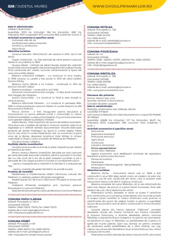 528 / JUDE%u021aUL MURE%u0218 WWW.GHIDULPRIMARIILOR.ROSate %u00een administra%u021bie:G%u0103l%u0103%u0163eni, BolintineniSuprafa%u021ba:%u00a0 3019 ha; Intravilan:%u00a0 196 ha; Extravilan:%u00a0 2821 ha; Popula%u021bia:%u00a01907; Gospod%u0103rii:%u00a0877; Locuin%u021be:%u00a0805; Gr%u0103dini%u021be:%u00a03; %u0218coli:%u00a03; Activitati economice si specifice zonei:Cultivarea vi%u0163ei de vieConfec%u0163ionare sobe%u00a0%u015fi teracot%u0103Comer%u0163 cu am%u0103nuntulAgricultur%u0103Obiective turistice:Conacul Horvath- Petrichevich: din secolul al XVIII -lea %u00een stil barocCopaci memoriali - au fost planta%u0163i de c%u0103tre preotul Losonczi M%u00f3zes %u00een anul 1849 %u015fi %u00een 1960Muzeul s%u0103tesc - %u00eenfiin%u0163at de Albert Buz%u00e1si J%u00f3zsef din colect%u0103ri locale. Este cea mai bogat%u0103 colec%u0163ie etnografic%u0103 din jude%u0163ul Mure%u015f, fiind constituit%u0103 din unelte, lucrurile comemorative %u015fi tipice ale unei comunit%u0103%u0163i s%u0103te%u015fti.Biserica unitarian%u0103 G%u0103l%u0103%u0163eni - s-a construit %u00een evul mediu, %u00een 1378, tavanul cu casete a fost pictat %u00een 1670 de c%u0103tre G%u00e1lfalvi Kozma Mih%u00e1ly.Biserica Inima Sf%u00e2nt%u0103 a lui Hristos - construit%u0103 %u00een 1910 de baronul Horv%u00e1th G%u00e1bor.Biserica ortodox%u0103 - construit%u0103 %u00een anii 1920.Column%u0103 comemorativ%u0103 Kiss Gergely - %u00een fa%u0163a %u015ecolii Generale Kiss Gergely din P%u0103s%u0103reni.%u00a0Izvorul comunit%u0103%u0163ii -%u00a0 s-a construit %u00een 1946 %u015fi este situat%u0103 %u00een centrul satului.%u00a0Biserica reformat%u0103 P%u0103s%u0103reni -%u00a0 s-a construit %u00een perioada 1818-1825 %u00een timpul preotului Losonczi Mozes. %u00cen curtea bisericii se afl%u0103 Monumentul %u00cent%u00e2lnirii.Parcul central - a fost inaugurat%u0103 poarta secuiasc%u0103 %u015fi monumentul cu prima atestare scris%u0103 a comunit%u0103%u0163ii %u00een cadrul %u00cent%u00e2lnirii localit%u0103%u0163ilor cu denumire Madaras. %u00cen jurul monumentului sunt a%u015fezate st%u00e2lpile localit%u0103%u0163ilor %u00eenfr%u0103%u0163iteDealul Backa - Este important din punct de vedere onomastic. Viticultura are o tradi%u0163ie de secole %u00een comuna noastr%u0103, ceea ce se reg%u0103se%u015fte %u015fi %u00een diferite atest%u0103ri documentare. Vinurile delicioase produse pe aceste meleaguri au ajuns %u00een curtea regelui Matei Corvin, sau chiar %u00een curtea %u00eemp%u0103ratului. Dar nu numai aici a ajuns vinul de la Backa, deoarece localnicul Csiki Mihaly %u00een timpul captivit%u0103%u0163ii %u00een Rusia a v%u0103zut o butelie de Riesling din P%u0103s%u0103reni.Cimitirul Eroilor G%u0103l%u0103%u0163eniFacilit%u00e3%u0163i oferite investitorilor:Consiliul local acord%u0103 scutire de la plata impozitului pe cl%u0103dire %u015fi impozitul pe terenPentru terenul aferent investi%u0163iilor derulate pe raza comunei pe toat%u0103 perioada execut%u0103rii acestora, p%u00e2n%u0103 la punerea %u00een func%u0163ie, dar nu mai mult de 3 ani de la data %u00eenceperii lucr%u0103rilor %u015fi pe o perioad%u0103 de 3 ani dup%u0103 punere %u00een func%u0163ie %u00een urm%u0103toarele cazuri:- pentru investi%u0163iile de la 100.000 E la 150.000 E o reducere de 75%- pentru investi%u0163ii de peste 150.000 E se acord%u0103 scutireProiecte de investi%u0163ii:Reabilitarea %u0219i modernizarea cl%u0103dirii C%u0103minului cultural din P%u0103s%u0103reni, %u00een vederea cre%u0219terii eficien%u021bei energeticeModernizarea DC 39 A km 1+300-km3+770 p%u00e2n%u0103%u00a0la limita UAT P%u0103s%u0103reniCre%u0219terea eficien%u021bei energetice prin montare panouri fotovoltaice %u00een comuna P%u0103s%u0103reni Sta%u021bii de re%u00eenc%u0103rcare pentru vehicule electrice, %u00een comuna P%u0103s%u0103reniCOMUNA PAPIU ILARIANAdres%u0103: Principal%u0103, nr. 192 ACod po%u0219tal: 547445Telefon: 0265-715112, 715113; Fax: 0265-715113; Adresa de e-mail: papiu@cjmures.roURL: http://www.papiuilarian.roCOMUNA P%u0102NETAdres%u0103: Principal%u0103, nr.191Cod po%u0219tal: 547450Telefon: 0265-322112; Fax: 0265-322112; Adresa de e-mail: panet@cjmures.roURL: https://panit.ro/ro/primaria-panet/COMUNA PETELEAAdres%u0103: Principal%u0103, nr. 726Cod po%u0219tal: 547460Telefon: 0265-344112; Fax: 0265-344112; Adresa de e-mail: petelea@cjmures.roURL: www.primariapetelea.roCOMUNA POG%u0102CEAUAAdres%u0103: Nr. 44Cod po%u0219tal: 547465Telefon: 0265- 420001, 420110, 420042; Fax: 0265-420001; Adresa de e-mail: pogaceaua@cjmures.roURL: https://pogaceaua.ro/COMUNA R%u0102STOLI%u0162AAdres%u0103: Principal%u0103, nr. 335Cod po%u0219tal: 547480Telefon: 0265-532339; Fax: 0265-532104; Adresa de e-mail: rastolita@cjmures.roURL: www.primariarastolita.ro.roPersoane din primarie:Primar: Marius Ioan LircaSecretar General: Cristina SlamaContabil: Nicoleta LeopoldSate %u00een administra%u021bie:R%u0103stoli%u0163a,%u00a0Andreneasa, Iod, G%u0103l%u0103oaia, BorziaLocalit%u0103%u0163ii %u00cenfr%u0103%u0163ite:UAT Comuna R%u0103stoli%u021ba are rela%u021bii de prietenie cu ora%u0219ul DE PANNE din BelgiaSuprafa%u021ba:%u00a0 26598 ha; Intravilan:%u00a0 127 ha; Extravilan:%u00a0 26471 ha; Popula%u021bia:%u00a0 2073; Gospod%u0103rii:%u00a0 768; Locuin%u021be:%u00a0 1340; Gr%u0103dini%u021be:%u00a0 1; %u0218coli:%u00a01; Activitati economice si specifice zonei:Silvicultur%u0103Exploatare forestier%u0103Prelucarea lemnuluiAgricultur%u0103Construc%u0163iiIndustria alimentar%u0103Firme reprezentative:Ocolul Silvic R%u0103stoli%u021baAgen%u021bi economici care desf%u0103%u0219oar%u0103 activitate de exploatare forestier%u0103 %u0219i prelucrarea lemnuluiPensiune turistic%u0103P%u0103str%u0103v%u0103rieAmenajare hidroenergetic%u0103 - Baraj R%u0103stoli%u021ba RestauranteObiective turistice:Biserica Veche %u2013 monument istoric sub nr. 3359 a fost construit%u0103 %u00een anul 1812 (de%u015fi exist%u0103 motiv s%u0103 credem c%u0103 este mai veche cu cca 50 ani),