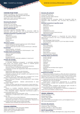 532 / JUDE%u021aUL MURE%u0218 WWW.GHIDULPRIMARIILOR.ROCOMUNA RU%u015eII MUN%u0162IAdres%u0103: Principal%u0103, nr. 120; Cod po%u0219tal: 547505Telefon: 0265-554088, 0265-554004,0265-554201; Fax: 0265-554180, 0265-554088; Adresa de e-mail: rusiimunti@cjmures.roURL: www.rusiimunti.comPersoane din primarie:Primar:%u00a0B%u0103lan Ilie%u00a0Chi%u015fViceprimar: Liviu%u00a0Ceac%u0103uSecretar General:%u00a0Ioan%u00a0SigmireanContabil:%u00a0Daniela%u00a0C%u0103tinean%u00a0Sate %u00een administra%u021bie:Ru%u015fii Mun%u0163i, Mor%u0103reni, Maiore%u015fti, Sebe%u015fSuprafa%u021ba:%u00a0 4386 ha; Intravilan:%u00a0 298 ha; Extravilan:%u00a0 4088 ha; Popula%u021bia:%u00a02251; Gospod%u0103rii:%u00a0772; Locuin%u021be:%u00a0816; Gr%u0103dini%u021be:%u00a01; %u0218coli:%u00a01; Activitati economice si specifice zonei:Agricultur%u0103Cre%u015fterea animalelorPrelucrarea lemnuluiAgroturismPrest%u0103ri serviciiComer%u0163Obiective turistice:Trasee turistice %u00een Mun%u0163ii Gurghiului spre V%u00e2rful Z%u0103spadMuzeul Etnografic din Ru%u015fii Mun%u0163iiTraseu turistic spre Muntele %u201cScaunul Domnului%u201d, C%u0103limaniEvenimente:T%u00e2rgul Rusaliilor - de RusaliiFestivalul de datini %u015fi obiceiuri a V%u0103ii Mure%u015fului - iulieFacilit%u00e3%u0163i oferite investitorilor:Terenuri la pre%u0163uri accesibileRe%u0163ea de ap%u0103CanalizareEnergie electric%u0103Re%u0163ea de drumuri na%u0163ionale, jude%u0163ene, %u00een stare bun%u0103Proiecte de investi%u0163ii:Proiecte de investitii%u00cen derulare: Reabilitare energetic%u0103%u00a0 %u015fi extindere gradini%u0163a Ru%u015fii Mun%u0163i- prin fonduri%u00a0 proprii-%u00a0 dotare cu mobilier pentru func%u0163ionarea cu program prelungit,Parc de joac%u0103%u00a0 %u015fi de agrement %u00een localitatea Mor%u0103reni,Patinoar sintetic %u00een localitatea Ru%u015fii Mun%u0163i,Finalizarea lucr%u0103rilor de regularizare albia Valea Dumbr%u0103vii %u00een satul Maiore%u015fti,Regularizare albie parau %u00een satul Morareni,Regularizare albie Valea Satului- Ru%u015fii Mun%u0163i,Extindere conducta de ap%u0103%u00a0 potabil%u0103%u00a0 pe lungime de 1,3 km. %u00eentre Sebes %u015fi Ru%u015fii Mun%u0163i,Asfaltare drum de interes local pe o lungime de 1,3 km.- program Anghel Saligny, %u00eentre Sebes %u015fi Ru%u015fii Mun%u0163i,Re%u0163ea canalizare menajer%u0103%u00a0 %u015fi bransamente %u00een satul Sebe%u0219Anghel Saligny,Reabilitare energetic%u0103%u00a0 cl%u0103direa administrativ%u0103%u00a0 %u00een satul Maiore%u015fti - PNRR,Construire dou%u0103%u00a0 sta%u0163ii de reicarcare pentru ma%u015fini electrice,Achizi%u0163ie autoutilitara pentru intre%u0163inerea domeniului publicAFIR,Dotare cu mobilier, materiale didactice %u015fi echipamente digitale la %u015fcoala gimnazial%u0103%u00a0 Danila Stupar- Ru%u015fii Mun%u0163i- PNRR,Parc fotovoltaic pentru asigurarea iluminatului public %u00een comuna Ru%u015fii Mun%u0163i- AFM,Reabilitare retea de iluminat public- AFM,Reabilitare %u015fi modernizare c%u0103min cultural %u00een localitatea Ru%u015fii Mun%u0163i- CNI,Parc de aventur%u0103%u00a0 pe Valea Sebesului,C%u0103min pentru persoane v%u00e2rstnice %u00een localitatea Ru%u015fii Mun%u0163i,Aduc%u0163iune gaz metan %u00een comuna Ru%u015fii Mun%u0163i- %u00eempreuna cu comunele Aluni%u015f, Deda, Vatava %u015fi Br%u00e2ncovene%u015fti,Asfaltare drum forestier pe lungime de 2,7 km.COMUNA S%u0102R%u0102%u0162ENIAdres%u0103: Principal%u0103, nr. 75/B; Cod po%u0219tal: 545504Telefon: 0265-573001; Fax: 0265-573001; Adresa de e-mail: sarateni@cjmures.roURL: www.sarateni.roPersoane din primarie:Primar: Zsigmond PalViceprimar: Toth IstvanSecretar General: %u00dajfalvi M%u00f3nikaContabil: Bir%u00f3 TimeaSuprafa%u021ba:%u00a0 3715 ha; Intravilan:%u00a0 195,91 ha; Extravilan:%u00a0 3519 ha; Popula%u021bia:%u00a0 1608; Gospod%u0103rii:%u00a0 542; Locuin%u021be:%u00a0 576; Gr%u0103dini%u021be:%u00a0 1; %u0218coli:%u00a01; Activitati economice si specifice zonei:Agricultur%u0103Produc%u021bie vegetal%u0103ZootehnieApicultur%u0103Floricultur%u0103Cre%u015fterea animalelorExploatarea %u015fi prelucrarea lemnuluiFabricarea mobileiObiective turistice:Cl%u0103direa %u015fcolii generale cu clopotni%u0163%u0103 din lemn Biserica reformat%u0103 din secolul al XIV -lea cu mobilier dat%u00e2nd din timpul construc%u0163ieiSitul arheologic Castrul romanMonumentele eroilor c%u0103zu%u021bi %u00een I %u0219i al II-lea r%u0103zboi mondialMuzeul satuluiEvenimente:Balul c%u0103s%u0103tori%u021bilorCarnavalul elevilorZiua FemeilorBal de pa%u0219tiZiua MamelorZiua CopiilorZilele comunei S%u0103r%u0103%u021beniZiua Persoanelor V%u00e2rstniceFacilit%u00e3%u0163i oferite investitorilor:Acces la DN 13AAcces la DJ 135Gara CFRCurent electricTelefonieInternetAp%u0103 curent%u0103CanalizarePosibilit%u0103%u021bi de arendare teren agricolP%u0103%u0219uneLinie electric%u0103 20 KVMagistral%u0103 conduct%u0103 gaz metanProiecte de investi%u0163ii:Reducerea emisiilor de gaze cu efect de ser%u0103 %u00een transporturi, prin promovarea infrastructurii pentru vehicule de transport rutier nepoluant din punct de vedere energetic: sta%u021bii de re%u00eenc%u0103rcare pentru vehicule electrice %u00een Comuna S%u0103r%u0103%u021beni, Jude%u021bul Mure%u0219Construire locuin%u021be de serviciu pentru speciali%u0219ti din s%u0103n%u0103tate %u0219i %u00eenv%u0103%u021b%u0103m%u00e2nt din comuna S%u0103r%u0103%u021beniModernizarea infrastructurii educa%u021bionale %u0219i a dot%u0103rilor aferente pentru unit%u0103%u021bile de %u00eenv%u0103%u021b%u0103m%u00e2nt preuniversitare din comuna S%u0103r%u0103%u021beni%u00cenfiin%u021bare sistem inteligent de distribu%u021bie gaze naturale %u00een comuna S%u0103r%u0103%u021beni, sat S%u0103r%u0103%u021beni, jude%u021bul Mure%u0219Cre%u0219terea gradului de digitalizare %u00een beneficiul cet%u0103%u021benilor %u00een cadrul Comunei S%u0103r%u0103%u021beni, Jude%u021bul Mure%u0219ORA%u0218UL S%u0102RMA%u015eUAdres%u0103: Republicii, nr. 63;Cod