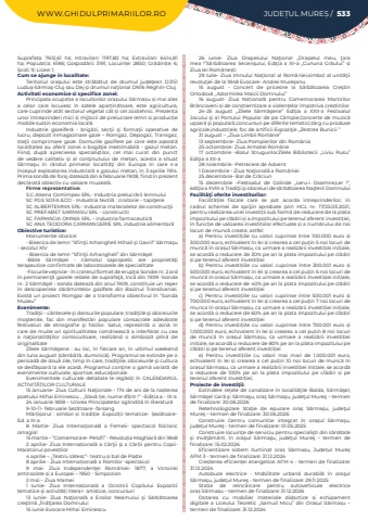 WWW.GHIDULPRIMARIILOR.RO JUDE%u021aUL MURE%u0218 / 533Suprafa%u021ba:%u00a0 7612,61 ha; Intravilan:%u00a0 1197,80 ha; Extravilan:%u00a0 6414,81 ha; Popula%u021bia:%u00a06186; Gospod%u0103rii:%u00a03191; Locuin%u021be:%u00a02850; Gr%u0103dini%u021be:%u00a06; %u0218coli:%u00a09; Licee:%u00a01; Cum se ajunge in localitate:Teritoriul ora%u015fului este str%u0103b%u0103tut de drumul jude%u0163ean DJ151 Ludu%u015f-S%u0103rma%u015f-Cluj sau Dej %u015fi drumul na%u0163ional DN16 Reghin-Cluj.Activitati economice si specifice zonei:Principala ocupa%u021bie a locuitorilor ora%u0219ului S%u0103rma%u0219u %u0219i mai ales a celor care locuiesc %u00een satele apar%u021bin%u0103toare, este agricultura, care cuprinde at%u00e2t sectorul vegetal c%u00e2t %u0219i cel zootehnic. Prezen%u021ba unor %u00eentreprinderi mici %u0219i mijlocii de prelucrare lemn %u0219i produc%u021bie mobile sus%u021bin economia local%u0103.Industrie gazeifer%u0103 - brig%u0103zi, sec%u0163ii %u015fi forma%u0163ii operative de lucru, depozit %u00eenmagazinare gaze %u2013 Romgaz, Depogaz, Transgaz, sta%u0163ii comprimare gaze. Domurile gazifere pe care este a%u015fezat%u0103 localitatea au oferit zonei o bog%u0103%u0163ie inestimabil%u0103 - gazul metan. Fiind, dup%u0103 aprecierea speciali%u015ftilor, cel mai curat din punct de vedere calitativ %u015fi al con%u0163inutului de metan, acesta a situat S%u0103rma%u015fu %u00een r%u00e2ndul primelor localit%u0103%u0163i din Europa %u00een care s-a %u00eenceput exploatarea industrial%u0103 a gazului metan, %u00een 3 aprilie 1914. Prima sond%u0103 de foraj dateaz%u0103 din 6 februarie 1908, fiind %u00een prezent declarat%u0103 obiectiv cu valoare muzeal%u0103.Firme reprezentative:S.C.Alsena Comimpex SRL- Industria prelucr%u0103rii lemnuluiSC PGS SOFA &CO - Industria textil%u0103 : croitorie %u2013 tapi%u0163erieSC ALBERTEMMA SRL- Industria materialelor de construc%u0163iiSC PREFABET SARMASU SRL - constructiiSC FARMACIA OMNIA SRL %u2013 industria farmaceutic%u0103 SC ANA TEODORA CARMANGERIE SRL industrie alimentar%u0103Obiective turistice:Monumente istorice: - Biserica de lemn %u201cSfin%u0163ii Arhangheli Mihail %u015fi Gavril%u201d S%u0103rma%u015fu - secolul XIV- Biserica de lemn %u201cSfin%u0163ii Arhangheli%u201d din S%u0103rm%u0103%u015fel-B%u0103ile S%u0103rm%u0103%u015fel - n%u0103molul sapropelic are propriet%u0103%u0163i terapeutice confirmate de laboratoarele de specialitate -Focurile ve%u015fnice - %u00een craterul format de erup%u0163ia Sondei nr. 2 ard %u00een permanen%u0163%u0103 gazele rebele de suprafa%u0163%u0103, %u00eenc%u0103 din 1909 -Sonda nr. 2 S%u0103rm%u0103%u015fel - sonda dateaz%u0103 din anul 1909, constituie un reper %u00een descoperirea z%u0103c%u0103mintelor gazifere din Bazinul Transilvaniei. Exist%u0103 un proiect Romgaz de a transforma obiectivul %u00een %u201cSonda Muzeu%u201dEvenimente:Tradi%u0163ii - c%u00e2ntecele %u015fi dansurile populare, tradi%u0163iile %u015fi obiceiurile mo%u015ftenite, fac din manifest%u0103ri populare consacrate adev%u0103rate festivaluri de etnografie %u015fi folclor. Satul, reprezint%u0103 o zon%u0103 %u00een care de multe ori spiritualitatea rom%u00e2neasc%u0103 a interferat cu cea a na%u0163ionalit%u0103%u0163ilor conlocuitoare, realiz%u00e2nd o simbioz%u0103 plin%u0103 de originalitateZilele S%u0103rm%u0103%u015fene : au loc, %u00een fiecare an, %u00een ultimul weekend din luna august (s%u00e2mb%u0103t%u0103, duminic%u0103). Programul se extinde pe o perioad%u0103 de dou%u0103 zile, timp %u00een care, tradi%u0163iile, obiceiurile %u015fi cultura se desf%u0103%u015foar%u0103 la ele acas%u0103. Programul con%u0163ine o gam%u0103 variat%u0103 de evenimente culturale, sportive, educa%u0163ionale.Evenimentele culturale detaliate le reg%u0103si%u021bi %u00een CALENDARUL ACTIVIT%u0102%u021aILOR CULTURALE 15 ianuarie- Ziua Culturii Na%u0163ionale %u2013 174 de ani de la na%u0219terea poetului Mihai Eminescu , %u201eSlav%u0103 %u021bie, nume sf%u00e2nt%u00a0!%u201d %u2013Edi%u021bia a - IX-a24 ianuarie 1859 %u2013 Unirea Principatelor oglindit%u0103 %u00een literatur%u01039-10-11- februarie %u0218ez%u0103toare -farsangM%u0103r%u021bi%u0219orul%u00a0 : simbol %u0219i tradi%u021bie. Expozi%u021bii tematice- %u0218ez%u0103toareEd. a XI-a8 Martie- Ziua Interna%u0163ional%u0103 a Femeii- spectacol folcloric omagial15 martie %u2013 %u201dComemorare- Petofi%u201d - Revolu%u021bia Maghiar%u0103 din 18482 aprilie- Ziua Interna%u021bional%u0103 a C%u0103r%u0163ii %u015fi a C%u0103r%u021bii pentru CopiiMaratonul pove%u0219tilor4 aprilie %u2013 %u201eTeatru s%u0103tesc%u201d- teatru %u0219i bal de Pa%u0219te8 aprilie - Ziua Interna%u021bional%u0103 a Romilor -spectacol9 mai- Ziua Independen%u0163ei Rom%u00e2niei- 1877, a Victoriei antinaziste %u0219i a Europei %u2013 1950 - Simpozion2 mai %u2013 Ziua Mamei1 Iunie- Ziua Interna%u021bional%u0103 a Ocrotirii Copilului Expozi%u021bii tematice %u0219i activit%u0103%u021bi literar- artistice, concursuri13 iunie- Ziua Na%u0163ional%u0103 a Eroilor Neamului %u015fi S%u0103rb%u0103toarea cre%u015ftin%u0103 %u201e%u00cen%u0103l%u0163area Domnului15 iunie Evocare Mihai Eminescu26 iunie- Ziua Drapelului Na%u0163ional %u201eDrapelul meu, %u0163ara mea%u00a0 !%u201dS%u0103rb%u0103toarea Seceri%u015fului, Edi%u0163ia a XI%u2013a %u201eCununa Gr%u00e2ului%u201d %u0219i Ziua Iei Rom%u00e2ne%u0219ti29 Iulie- Ziua Imnului Na%u0163ional al Rom%u00e2niei,simbol al unit%u0103%u0163ii revolu%u0163iei de la 1848 Evocare- Andrei Mure%u015fanu15 august - Concert de pricesne la S%u0103rb%u0103toarea Cre%u015ftin Ortodox%u0103 ,,Adormirea Maicii Domnului%u2019%u201916 august- Ziua Na%u021bional%u0103 pentru Comemorarea Martirilor Br%u00e2ncoveni %u0219i de con%u0219tientizare a violen%u021belor %u00eempotriva cre%u0219tinilor24-25 august %u201eZilele S%u0103rm%u0103%u015fene%u201d Edi%u0163ia a XXII-a Festivalul Jocului %u015fi al Portului Popular de pe C%u00e2mpie,Concerte de muzic%u0103 u%u015foar%u0103 %u015fi popu