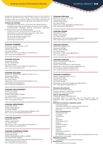 WWW.GHIDULPRIMARIILOR.RO JUDE%u021aUL NEAM%u021a / 549din p%u0103m%u00e2nt compactat %u015fi sunt distribu%u0163ie %u00een teritoriu fie %u00een interiorul vetrelor cu l%u0103%u0163ime mai mare :%u00a0Bicaz %u2013 Chei, Damuc, Huisurez, sau %u00een lungul vailor, sau urc%u00e2nd pe inretfluvii cum este cazul drumului comunal ce leag%u0103 satul D%u0103muc de satul%u00a0Trei F%u00e2nt%u00e2ni%u00a0(DC 137 A)Proiecte de investi%u0163ii:Managementul serviciilor comunitare de utilit%u0103%u0163i publiceCre%u015fterea capacit%u0103%u0163ii de absorb%u0163ie a fondurilor de investi%u0163iiFundamentare strategiei privind accelerarea dezvolt%u0103rii serviciilor comunitare de utilit%u0103%u0163i publiceImplementare %u015fi monotorizarea strategiei localeAlimentare cu ap%u0103 canalizare %u015fi epurare a apei uzateServicuil de salubrizare a localit%u0103%u0163ilorServicuil de transport public localServiciul de iluminat publicInforma%u0163ie %u015fi publicitateCOMUNA DOBRENIAdres%u0103: str. Lasc%u0103r Catargiu, nr 174Cod po%u0219tal: 617155Telefon: 0233-242944; Fax: 0233-242944; Adresa de e-mail: primaria@comunadobreni.roURL: www.comunadobreni.roCOMUNA DOCHIACod po%u0219tal: 617216Telefon: 0233-291919; Fax: 0233-291920; Adresa de e-mail: primarie@comunadochia.roURL: www.comunadochia.roCOMUNA DOLJE%u015eTIAdres%u0103: Str. %u015eTEFAN CEL MARE %u015eI SF%u00c2NT, Nr. 44Cod po%u0219tal: 617160Telefon: 0233-780514; Fax: 0233-780514; Adresa de e-mail: primcomdoljesti@yahoo.comcontact@primariadoljesti.roURL: www.primariadoljesti.roCOMUNA DRAGOMIRE%u015eTIAdres%u0103: PrincipalaCod po%u0219tal: 617165Telefon: 0233-292616, 292876; Fax: 0233-292876; Adresa de e-mail: primaria@dragomiresti.roURL: www.dragomiresti.roCOMUNA DR%u0102G%u0102NE%u015eTICod po%u0219tal: 617107Telefon: 0233-789386; Fax: 0233-789385; Adresa de e-mail: primariadraganesti@yahoo.comURL: www.comunadraganestineamt.roCOMUNA DULCE%u015eTICod po%u0219tal: 617175Telefon: 0233-761602; Fax: 0233-761006; Adresa de e-mail: contact@comunadulcesti.ro URL: http://comunadulcesti.ro/COMUNA DUMBRAVA RO%u015eIEAdres%u0103: Dumbravei, nr. 52Cod po%u0219tal: 617185Telefon: 0233-282494, 280944, 282224; Fax: 0233-282767, 282224; Adresa de e-mail: primariadumbravarosie@yahoo.comsecretariat@primariadvarosie.roURL: https://primariadvarosie.ro/COMUNA F%u0102RCA%u015eAAdres%u0103: str. Ioan Luca, nr. 108Cod po%u0219tal: 617190Telefon: 0233-267001; Fax: 0233-267001; Adresa de e-mail: office@primariafarcasa.roURL: www.primariafarcasa.roCOMUNA F%u0102UREICod po%u0219tal: 617195Telefon: 333-409457; Fax: 0333-409457; Adresa de e-mail: primariafaurei@yahoo.comURL: http://www.comunafaurei.ro/COMUNA G%u00c2DIN%u0162IAdres%u0103: Principal%u0103, nr. 25Cod po%u0219tal: 617396Telefon: 0233-765155; Fax: 0233-765155; Adresa de e-mail: contact@gadinti.roURL: www.gadinti.roCOMUNA G%u00c2RCINAAdres%u0103: Melchisedec StefanescuCod po%u0219tal: 617200Telefon: 0233-242200; Fax: 0233-242200; Adresa de e-mail: primariagircina@yahoo.comprimariagarcina@primariagarcina.roURL: https://www.primariagarcina.ro/COMUNA GHER%u0102E%u015eTIAdres%u0103: Vasile Alecsandri, nr. 56Cod po%u0219tal: 617205Telefon: 0233-746051; Fax: 0233-746450; Adresa de e-mail: primaria@primariagheraesti.roURL: https://primariagheraesti.ro/Persoane din primarie:Primar: Ermina DanculeseiSecretar General: Jr. P%u0103l%u0103nceanu MarcelaContabil: Ec. Cocu%u0163i AntoanetaSate %u00een administra%u021bie:Gher%u0103e%u015fti, Te%u0163cani, Gher%u0103e%u015ftii-NoiSuprafa%u021ba:%u00a0 3070 ha; Intravilan:%u00a0 555 ha; Extravilan:%u00a0 2515 ha; Popula%u021bia:%u00a0 6592; Gospod%u0103rii:%u00a0 2346; Locuin%u021be:%u00a0 2206; Gr%u0103dini%u021be:%u00a0 2; %u0218coli:%u00a01; Activitati economice si specifice zonei:Cultivarea andiveiCultivarea m%u0103laiului %u0219i confec%u021bionarea m%u0103turilorAgricultura %u0219i cre%u0219terea animalelor Comer%u021bulFirme reprezentative:ANDOS COM SRLCLATEBOCLOROFILAZPFVELMARTProduc%u0103tori locali:IORGA IIDOBOS IULIAN IIProduse locale:ANDIVAM%u0102TURIPRODUSE AGRICOLEMe%u0219te%u0219ugari:%u00ceN CONSTRUC%u021aII AVEM FOARTE BUNI PROFESIONISTI DE EX. FLORIN RUSU CUPTOAREObiective turistice:La f%u00e2nt%u00e2nele %u0219i %u00een Lunca R%u00e2ului MoldovaEvenimente:Hramul bisericii din Gher%u0103e%u0219ti