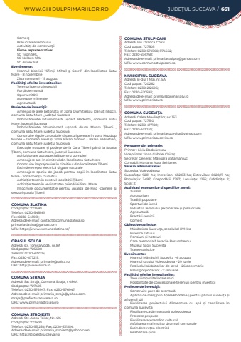 WWW.GHIDULPRIMARIILOR.RO JUDE%u021aUL SUCEAVA / 661Comer%u0163Prelucrarea lemnuluiActivit%u0103%u021bi de construc%u0163iiFirme reprezentative:SC Tiron SRLSC Nelben SRLSC Alsilex SRL Evenimente:Hramul bisericii %u201cSfin%u0163ii Mihail %u015fi Gavril%u201d din localitatea Satu Mare - 8 noiembrie Ziua comunei - 15 augustFacilit%u00e3%u0163i oferite investitorilor:Terenuri pentru investi%u021biiFor%u021b%u0103 de munc%u0103Oportunit%u0103%u021bi:Agregate mineraleAgricultur%u0103Proiecte de investi%u0163ii:Amenajare alee betonat%u0103 %u00een zona Dumitrescu D%u0103nu%u021b (Bipci), comuna Satu Mare , jude%u021bul%u00a0Suceava%u00cembr%u0103c%u0103minte bituminoas%u0103 u%u0219oar%u0103 Badelit%u0103, comuna Satu Mare, jude%u021bul%u00a0Suceava%u00cembr%u0103c%u0103minte bituminoas%u0103 u%u0219oar%u0103 drum Moara %u021aibeni , comuna Satu Mare, jude%u021bul SuceavaConstruire rigole carosabile %u0219i %u0219anturi pereate %u00een zona Huzdup Mircea %u2013 Donisan Ionel %u0219i zona Balan Simion - Balan Sebastian, comuna Satu Mare ,jude%u021bul%u00a0SuceavaExecu%u021bie trotuare %u0219i pode%u021be de la Gara %u021aibeni p%u00e2n%u0103 la %u0218coala %u021aibeni, comuna Satu Mare, jude%u021bul%u00a0SuceavaAchizi%u021bionare autospecial%u0103 pentru pompieriAmenajare alei %u00een cimitirul din localitatea Satu MareConstruire %u00eemprejmuire %u00een cimitirul din localitatea TibeniExtindere re%u021bea electric%u0103 %u0219i gaze naturaleAmenajare spa%u021biu de joac%u0103 pentru copii %u00een localitatea Satu Mare - zona Tom%u0219a DumitruAchizi%u021bie teren %u00een centrul localit%u0103%u021bii %u021aibeniAchizi%u021bie teren %u00een vecinatatea prim%u0103riei Satu Mare%u00centocmire documenta%u021bie pentru Analiza de Risc -camere %u0219i senzori %u0219coala %u021aibeniCOMUNA SLATINACod po%u0219tal: 727490Telefon: 0230-545981; Fax: 0230-545981; Adresa de e-mail: contact@comunaslatina.roprimariaslatina@yahoo.comURL: https://www.comunaslatina.ro/ORA%u0218UL SOLCAAdres%u0103: str. Tom%u0219a Vod%u0103 , nr.8ACod po%u0219tal: 725600Telefon: 0230-477215;Fax: 0230-477215; Adresa de e-mail: primarie@solca.roURL: http://www.solca.roCOMUNA STRAJAAdres%u0103: Sat Straja, Comuna Straja, r 484ACod po%u0219tal: 727495Telefon: 0230-576947; Fax: 0230-576947; Adresa de e-mail: primaria_straja@yahoo.comstraja@prefecturasuceava.roURL: www.primariastrajasv.roCOMUNA STROIE%u015eTIAdres%u0103: Str. Aleea Teilor, Nr. 416Cod po%u0219tal: 727500Telefon: 0230-531254; Fax: 0230-531254; Adresa de e-mail: primaria_stroiesti@yahoo.comURL: http://stroiestisuceava.ro/COMUNA STULPICANIAdres%u0103: Inv. Dranca ChirilCod po%u0219tal: 727505Telefon: 0230-574760, 574662; Fax: 0230-574760; Adresa de e-mail: primariastulpsv@yahoo.comURL: www.comunastulpicani.roMUNICIPIUL SUCEAVAAdres%u0103: B-dul 1 Mai, nr. 5ACod po%u0219tal: 720262Telefon: 0230-212696; Fax: 0230-520593; Adresa de e-mail: primsv@primariasv.roURL: www.primariasv.roCOMUNA SUCEVI%u0162AAdres%u0103: Calea Movile%u0219tilor, nr. 153Cod po%u0219tal: 727510Telefon: 0230-417102; Fax: 0230-417030; Adresa de e-mail: primariasucevita@yahoo.comURL: www.primariasucevita.roPersoane din primarie:Primar : Liviu Bodn%u0103rescuViceprimar : Ioan Gabriel Chira%u0219Secretar General: M%u0103rioara VatamaniucContabil: Mariana Aura SehlanecSate %u00een administra%u021bie:Sucevi%u0163a, VoievodeasaSuprafa%u021ba:%u00a0 9281 ha; Intravilan:%u00a0 652,83 ha; Extravilan:%u00a0 8628,17 ha; Popula%u021bia:%u00a0 3497; Gospod%u0103rii:%u00a0 1797; Locuin%u021be:%u00a0 1255; Gr%u0103dini%u021be:%u00a0 2; %u0218coli:%u00a02; Activitati economice si specifice zonei:TurismAgroturismTradi%u0163ii populare Sporturi de iarn%u0103Industria lemnului (exploatare %u015fi prelucrare)Agricultur%u0103Prest%u0103ri serviciiComer%u0163Obiective turistice:M%u0103n%u0103stirea Sucevi%u0163a, secolul al XVI-leaBiserica satuluiPensiuni %u0219i hoteluriCasa memorial%u0103 Ieraclie PorumbescuMuzeul %u015ecolii Sucevi%u0163aTrasee turisticeEvenimente:Hramul M%u0103n%u0103stirii Sucevi%u0163a - 6 augustHramul satului Voievodeasa - 29 iunieFestivalul s%u0103rb%u0103torilor de iarn%u0103 - 26 decembrie Balul gospodarilor - 7 ianuarieFacilit%u00e3%u0163i oferite investitorilor:Taxe %u0219i impozite locale mici Posibilitate de concesionare terenuri pentru investi%u021biiProiecte de investi%u0163ii:Construire parc de aventur%u0103Ap%u0103r%u0103ri de mal ( prin Apele Rom%u00e2ne ) pentru p%u00e2r%u00e2ul Sucevi%u021ba %u0219i afluen%u021bii s%u0103iFinalizarea proiectului Alimentare cu ap%u0103 %u0219i canalizare %u00een comuna Sucevi%u021baFinalizare cas%u0103 mortuar%u0103 VoievodeasaProtecte propuseFinalizare a%u0219ezam%u00e2nt culturalAsfaltarea mai multor drumuri comunaleExtindere re%u021bea electric%u0103 Reabilitare %u0219coli