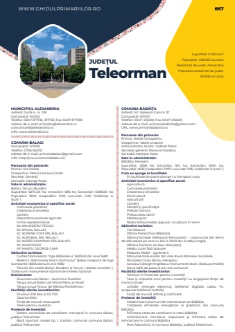 WWW.GHIDULPRIMARIILOR.RO 667Suprafa%u021b%u0103: 5.790 km%u00b2Popula%u021bie: 465.053 locuitoriRe%u0219edin%u021b%u0103 de jude%u021b: AlexandriaPopula%u021bia re%u0219edin%u021bei de jude%u021b: 59.308 locuitoriJUDE%u021aULTeleormanMUNICIPIUL ALEXANDRIAAdres%u0103: Dun%u0103rii, nr. 139Cod po%u0219tal: 140010Telefon: 0247-317732, 317733; Fax: 0247-317728; Adresa de e-mail: primalex@alexandria.rocomunicare@alexandria.roURL: www.alexandria.roCOMUNA BALACICod po%u0219tal: 147005Telefon: 0736-162115; Adresa de e-mail: primariabalaci@gmail.comURL: http://www.comunabalaci.ro/Persoane din primarie:Primar: Ilie%u00a0Calot%u0103Viceprimar:%u00a0Petrica Marius CortelSecretar General:%u00a0Contabil: George%u00a0RaduSate %u00een administra%u021bie:Balaci, Tecuci, BurdeniSuprafa%u021ba:%u00a0 6274,50 ha; Intravilan:%u00a0 686 ha; Extravilan:%u00a0 5588,50 ha; Popula%u021bia:%u00a0 1820; Gospod%u0103rii:%u00a0 1010; Locuin%u021be:%u00a0 1461; Gr%u0103dini%u021be:%u00a0 2; %u0218coli:%u00a01; Activitati economice si specifice zonei:Cultivarea plantelorCre%u0219terea animalelorComer%u0163Depozitare produse agricoleFirme%u00a0reprezentative:SA KALINDERU TECUCISA SPICUL BALACISC AGRENE COM SRL BALACISC AGROBAL SRL BALACISC AGRES COMPANY SRL BALACISC AGRICOVERAF MANTU GEORGE CAMIObiective turistice:Curtea Domneasc%u0103 %u201cAga B%u0103l%u0103ceanu%u201d dat%u00e2nd din anul 1680Biserica %u201cAdormirea Maicii Domnului%u201d Balaci %u00eenceput%u0103 de Aga Constantin B%u0103l%u0103ceanu %u00een anii 1680Telurile din satele Balaci, Burdeni %u0219i Tecuci ( datate eneolitic ). Toate sunt monumente istorice de interes na%u021bionalEvenimente:Ziua comunei Balaci - duminica RusalilorT%u00e2rgul anual Balaci de Sfin%u0163ii Petru %u015fi PavelT%u00e2rgul anual Tecuci de Sf%u00e2ntul PantelimonFacilit%u00e3%u0163i oferite investitorilor:Drumuri DN 65A %u0219i DJ 703Oportunit%u0103%u021bi:For%u021b%u0103 de munc%u0103 neocupat%u0103Teren pentru investi%u021biiProiecte de investi%u0163ii:Sistem centralizat de canalizare menajer%u0103 %u00een comuna Balaci, jude%u0163ul TeleormanBaz%u0103 sportiv%u0103 model tip I, stadion comunal comuna Balaci, jude%u0163ul TeleormanCOMUNA B%u0102B%u0102I%u0162AAdres%u0103: Str. Soseaua Garii nr.37Cod po%u0219tal: 147010Telefon: 0347-415020; Fax: 0347-415020; Adresa de e-mail: primariababaita@yahoo.comURL: www.primariababaita.roPersoane din primarie:Primar:%u00a0Stelea V%u00eertopeanuViceprimar: Vasile UrsacheAdministrator Public: Gabriel PistolSecretar general: Mariana FlorescuContabil: Mariana StateSate %u00een administra%u021bie:B%u0103b%u0103i%u0163a, Meri%u015faniSuprafa%u021ba:%u00a0 5258 ha; Intravilan:%u00a0 184 ha; Extravilan:%u00a0 5074 ha; Popula%u021bia:%u00a02635; Gospod%u0103rii:%u00a01097; Locuin%u021be:%u00a01185; Gr%u0103dini%u021be:%u00a02; %u0218coli:%u00a01; Cum se ajunge in localitate:%u00cen localitate se poate ajunge cu transport autoActivitati economice si specifice zonei:Agricultur%u0103Cultivarea plantelorCre%u015fterea animalelorPiscicultur%u0103Apicultur%u0103Comer%u021bMor%u0103rit %u015fi panifica%u0163iePrest%u0103ri serviciiPrelucrarea c%u0103rniiMe%u0219te%u0219ugari:R%u0103doi Mihai,me%u0219ter popular, sculptura %u00een lemnObiective turistice:Trei Biserici:Sf%u00e2nta Paraschiva (B%u0103b%u0103i%u0163a)Sf%u00e2ntul Nicolae (Meri%u015fani)-Monument - construc%u0163ie din lemn de sit%u0103 adus%u0103 pe care cu boi la 1840 din Jude%u0163ul Arge%u015fSf%u00e2ntul Dimitrie cel Nou (Meri%u0219ani)Mediu curat f%u0103r%u0103 poluareP%u0103durea Redie - agrementMonumentele eroilor din cele dou%u0103 r%u0103zboaie mondialePivni%u0163ele Conac%u00a0Barbu Meri%u015fanuConacul George Angelescu-monument istoric (Sediu prim%u0103rie)Dou%u0103 b%u0103l%u021bi de pescuit pe raza comuneiFacilit%u00e3%u0163i oferite investitorilor:Terenuri %u00een intravilan pentru investi%u0163iiTaxe %u015fi impozite mici pentru investi%u0163ii cu angajarea for%u0163ei de munc%u0103 localeUtilit%u0103%u0163i (energie electric%u0103, telefonie digital%u0103, cablu TV, acoperire telefonie mobil%u0103)For%u0163%u0103 de munc%u0103 ieftin%u0103 %u015fi calificat%u0103Proiecte de investi%u0163ii:Modernizare drumuri de interes local sat B%u0103b%u0103i%u021baCre%u0219terea eficien%u021bei energetice la gr%u0103dini%u021ba din comuna B%u0103b%u0103i%u021ba%u00cenfiin%u021bare re%u021bea de canalizare %u00een satul B%u0103b%u0103i%u021baAchizi%u021bionare microbuz nepoluant %u015fi %u00eenfin%u021bare sta%u021bie de re%u00eenc%u0103rcare %u00een comuna B%u0103b%u0103i%u021baParc fotovoltaic %u00een comuna B%u0103b%u0103i%u021ba, jude%u0163ul Teleorman