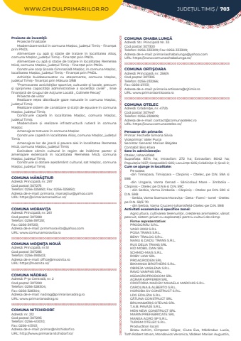 WWW.GHIDULPRIMARIILOR.RO JUDE%u021aUL TIMI%u0218 / 703Proiecte de investi%u0163ii:Proiecte finalizateModernizare str%u0103zi %u00een comuna Ma%u0219loc, jude%u021bul Timi%u0219 %u2013 finan%u021bat prin PNDLAlimentare cu ap%u0103 %u0219i sta%u021bie de tratare %u00een localitatea Alio%u0219, comuna Ma%u0219loc, jude%u021bul Timi%u0219 %u2013 finan%u021bat prin PNDLAlimentare cu ap%u0103 %u0219i sta%u021bie de tratare %u00een localitatea Remetea Mic%u0103, comuna Ma%u0219loc, jude%u021bul Timi%u0219 %u2013 finan%u021bat prin PNDLConstruire corp %u0218coala Gimnazial%u0103 Ma%u0219loc, %u00een comuna Ma%u0219loc, localitatea Ma%u0219loc, jude%u021bul Timi%u0219 %u2013 finan%u021bat prin PNDLAchizi%u021bie buldoexcavator cu ata%u0219amente, comuna Ma%u0219loc, jude%u021bul Timi%u0219%u2013 finan%u021bat prin M%u0103sura 3/6B%u201dPromovarea activit%u0103%u0163ilor sportive, culturale %u015fi locale, precum %u015fi sprijinirea capacit%u0103%u0163ii administrative a societ%u0103%u0163ii civile%u201d , linie finan%u0163at%u0103 de Grupul de Ac%u0163iune Local%u0103 %u201e Colinele Reca%u015f%u201dProiecte de viitorRealizare re%u021bea distribu%u021bie gaze naturale %u00een comuna Ma%u0219loc, jude%u021bul Timi%u0219Realizare sistem de canalizare %u0219i sta%u021bii de epurare %u00een comuna Ma%u0219loc, jude%u021bul Timi%u0219Construire capel%u0103 %u00een localitatea Ma%u0219loc, comuna Ma%u0219loc, jude%u021bul Timi%u0219Modernizare %u0219i realizare infrastructur%u0103 rutier%u0103 %u00een comuna Ma%u0219locAmenajare trotuare %u00een comuna Ma%u0219locConstruire capel%u0103 %u00een localitatea Alio%u0219, comuna Ma%u0219loc, jude%u021bul Timi%u0219Amenajare loc de joac%u0103 %u0219i pavare alei %u00een localitatea Remetea Mic%u0103, comuna Ma%u0219loc, jude%u021bul Timi%u0219Extindere c%u0103min cultural %u00een regim de %u00een%u0103l%u021bime parter %u0219i amenajare exterioar%u0103 %u00een localitatea Remetea Mic%u0103, comuna Ma%u0219loc, jude%u021bul Timi%u0219 Construire %u0219i dotare a%u0219ez%u0103m%u00e2nt cultural, sat Ma%u0219loc, comuna Ma%u0219loc, jude%u021bul Timi%u0219COMUNA M%u0102N%u0102%u015eTIURAdres%u0103: Principal%u0103, nr. 297Cod po%u0219tal: 307275Telefon: 0256-325850; Fax: 0256-325850; Adresa de e-mail: primaria_manastiur@yahoo.comURL: https://primariamanastiur.ro/COMUNA MORAVI%u0162AAdres%u0103: Principal%u0103, nr. 261Cod po%u0219tal: 307280Telefon: 0256-397251; Fax: 0256-397251; Adresa de e-mail: prmrmoravita@yahoo.comURL: www.comunamoravita.roCOMUNA MO%u015eNI%u0162A NOU%u0102Adres%u0103: Principal%u0103, nr.51Cod po%u0219tal: 307285Telefon: 0256-393503; Adresa de e-mail: office@mosnita.roURL: https://mosnita.ro/COMUNA N%u0102DRAGAdres%u0103: P-%u0163a Central%u0103, nr. 2Cod po%u0219tal: 307290Telefon: 0256-328304; Fax: 0256-328304; Adresa de e-mail: nadrag@primarianadrag.roURL: www.primarianadrag.roCOMUNA NITCHIDORFAdres%u0103: nr. 212Cod po%u0219tal: 307295Telefon: 0256-413010; Fax: 0256-413101; Adresa de e-mail: primar@nitchidorf.roURL: http://www.primarianitchidorf.ro/COMUNA OHABA LUNG%u0102Adres%u0103: Str. Principal%u0103 Nr. 33Cod po%u0219tal: 307300Telefon: 0256-333309; Fax: 0256-333309; Adresa de e-mail: primariaohabalunga@yahoo.comURL: https://www.comunaohabalunga.ro/COMUNA ORTI%u015eOARAAdres%u0103: Principal%u0103, nr. 258/ACod po%u0219tal: 307305Telefon: 0256-233266; Fax: 0256-211131; Adresa de e-mail: primaria.ortisoara@cjtimis.roURL: www.primariaortisoara.roCOMUNA OTELECAdres%u0103: Gr%u0103dini%u0163ei, nr. 471/bCod po%u0219tal: 307447Telefon: 0256-232809; Adresa de e-mail: contact@comunaotelec.roURL: https://www.comunaotelec.ro/Persoane din primarie:Primar: Fechete Simona%u00a0SilviaViceprimar: Valer PurjaSecretar General: Marian%u00a0BlejdeaContabil: Biro KlaraSate %u00een administra%u021bie:Otelec, IohanisfeldSuprafa%u021ba:%u00a0 8314 ha; Intravilan:%u00a0 272 ha; Extravilan:%u00a0 8042 ha; Popula%u021bia:%u00a01657; Gospod%u0103rii:%u00a0605; Locuin%u021be:%u00a0605; Gr%u0103dini%u021be:%u00a02; %u0218coli:%u00a02; Cum se ajunge in localitate:Pe %u0219osea:-din Timi%u0219oara, Timi%u0219oara %u2013 C%u0103rpini%u0219 %u2013 Otelec, pe D.N. 59A si 59B-din Ungaria, Vama Cenad %u2013 S%u00e2nicolaul Mare %u2013 Jimbolia %u2013 C%u0103rpini%u0219 %u2013 Otelec pe D.N.6 si D.N. 59C- din Serbia, Vama Jimbolia %u2013 C%u0103rpini%u0219 %u2013 Otelec pe D.N. 59C si D.N. 59B- Serbia, Vama Stamora Moravi%u021ba %u2013 Deta - Foeni %u2013 Ionel - Otelec pe D.N. 59/E 70- din Serbia, Vama Cruceni-Iohanisfeld-Otelec-pe D.N. 59BActivitati economice si specifice zonei:Agricultura, cultivarea terenurilor, cre%u0219terea animalelor, v%u00e2nat pescuit, sistem privat cu exploata%u021bii pentru culturi de c%u00e2mpFirme reprezentative:PRODGR%u00c2U S.R.L.VASO 2002 S.R.LPOSA TRANS S.R.L.BENY TRALOG S.R.L.NANU & DADU TRANS S.R.L.RUS DELIA TRANS SRLKID MOBIL DAN SRLSCHMID-MAIS S.R.L.ROBY LKW SRLPROAGRODEN SRLBIKMANIA BROTHERS S.R.L.OBREJA VASILENA S.R.L.RAVO VANPAS SRL,KSDAGROPRODCOM SRLAGRAR KAPFERER SRLCROITORIA MAD BY MIHAELA MARCHIS S.R.L.CAROLINA & ALBERTO S.R.L.HOROBA SV CONSTRUCT S.R.L.LDG EDILIZIA S.R.L.C%u0102TUNA CONSTRUCT SRLBRUMA'S OTEVAS SRLT.A.B. PAVAJE S.R.L.MEN NEW CONSTRUCT SRLMARIN PREFABRICATE SRLMANEA AGRO SP S.R.L.TURISM OTELEC S.R.L.Produc%u0103tori locali:Bratu Achim, C%u00eempean Gligor, Ciuta Eva, M%u0103r%u0103nduc Lucia, Toth Robert Istvan, Mondovics Veronica, V%u0103dean Marian Augustin,
