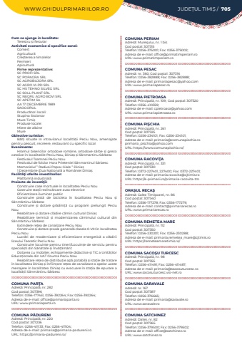 WWW.GHIDULPRIMARIILOR.RO JUDE%u021aUL TIMI%u0218 / 705Cum se ajunge in localitate:Terestru %u0219i feroviarActivitati economice si specifice zonei:Comer%u021bAgricultur%u0103Cre%u0219terea animalelorFermieriApicultur%u0103Firme reprezentative:SC PROFI SRLSC POPAGRA SRLSC AGROBUJORA SRLSC AGRO%u00a0VI-PD SRLSC HS TEHNO SILVEG SRLSC SOLL PLANT SRLSC NEGRU AGRO BOVI SRL SC APETIM SAAA 17 DECEMBRIE 1989SAOGORULProduc%u0103tori locali:Stupina StoianovMure Timi%u0219Produse locale:Miere de albineMureObiective turistice:B%u0103l%u021bi situate %u00een intravilanul localit%u0103%u021bii Peciu Nou, amenajate pentru pescuit, recreere, restaurant cu specific localEvenimente:Hramul bisericilor ortodoxe rom%u00e2ne, ortodoxe s%u00e2rbe %u0219i greco catolice %u00een localitatile Peciu Nou, Dinia%u0219 %u0219i S%u00e2nmartinu S%u00e2rbescFestivalul Toamnei Peciu NouFestivalul de folclor Hora Prieteniei S%u00e2nmartinul S%u00e2rbescMemorialul %u201d Radivoi Popov Giale %u201d Dinia%u0219 1 Decembrie-Ziua Na%u021bional%u0103 a Rom%u00e2niei Dinia%u0219Facilit%u00e3%u0163i oferite investitorilor:Platform%u0103 industrial%u0103Proiecte de investi%u0163ii:Construire case mortuale %u00een localitatea Peciu NouCostruire sta%u021bii rea%u00eenc%u0103rcare auto electriceEficientizare iluminat publicConstruire pist%u0103 de bicicleta %u00een localitatea Peciu Nou %u0219i S%u00e2nm%u0103rtinu S%u00e2rbescConstruire %u0219i dotare gr%u0103dini%u021b%u0103%u00a0 cu program prelungit Peciu NouReabilitare %u0219i dotare cl%u0103dire c%u0103min cultural Dinia%u0219Reabilitare termic%u0103%u00a0 %u0219i modernizarea c%u0103minului cultural din S%u00e2nm%u0103rtinu S%u00e2rbescExtindere re%u021bea de canalizare Peciu NouConstruire %u0219i dotare %u0219coala general%u0103%u00a0clasele 0-VIII %u00een localitatea Peciu NouLucr%u0103ri de modernizare %u0219i eficientizare energetic%u0103%u00a0 a cl%u0103dirii liceului Teoretic Peciu NouConstruire locuin%u021be pentru tineri/Locuin%u021be de serviciu pentru speciali%u0219ti din S%u0103n%u0103tate %u0219i %u00cenv%u0103%u021b%u0103m%u00e2ntDotarea cu mobilier, echipamente didactice %u0219i%u00a0TIC a Unit%u0103%u021bilor Educa%u021bionale din UAT Couma Peciu NouReabilitare re%u021bea de distribu%u021bie ap%u0103%u00a0potabil%u0103%u00a0%u0219i sta%u021bie de tratare %u00een localitatea Dinia%u0219%u00a0%u0219i %u00eenfiin%u021bare re%u021bea de canalizare a apelor uzate menajere %u00een localitatea Dinia%u0219%u00a0cu evacuare %u00een sta%u021bia de epurare a localit%u0103%u021bii S%u00e2nm%u0103rtinu S%u00e2rbescCOMUNA PAR%u0162AAdres%u0103: Principal%u0103, nr. 282Cod po%u0219tal: 307396Telefon: 0356-177451, 0256-392264; Fax: 0256-392264; Adresa de e-mail: office@primariaparta.roURL: www.primariaparta.roCOMUNA P%u0102DURENIAdres%u0103: Principal%u0103, nr. 220Cod po%u0219tal: 307236Telefon: 0256-411133; Fax: 0256-411104; Adresa de e-mail: primaria@primaria-padureni.roURL: https://primaria-padureni.ro/COMUNA PERIAMAdres%u0103: Mure%u015fului, nr. 1 bisCod po%u0219tal: 307315Telefon: 0256-375001; Fax: 0256-375002; Adresa de e-mail: office@primatimperiam.roURL: www.primatimperiam.roCOMUNA PESACAdres%u0103: nr. 360; Cod po%u0219tal: 307316Telefon: 0256-382888; Fax: 0256-382888; Adresa de e-mail: primariapesac@yahoo.comURL: www.primariapesac.roCOMUNA PIETROASAAdres%u0103: Principal%u0103, nr. 109; Cod po%u0219tal: 307320Telefon: 0356-410359; Adresa de e-mail: cpietroasa@yahoo.comURL: www.primariapietroasa.roCOMUNA PI%u015eCHIAAdres%u0103: Principal%u0103, nr. 261Cod po%u0219tal: 307325Telefon: 0256-234101; Fax: 0256-234101; Adresa de e-mail: primaria@comunapischia.roprimaria_pischia@yahoo.comURL: https://www.comunapischia.ro/COMUNA RACOVI%u0162AAdres%u0103: Principal%u0103, nr. 331Cod po%u0219tal: 307330Telefon: 0372-227401, 227400; Fax: 0372-227401; Adresa de e-mail: primaria.racovita@cjtimis.roURL: https://e-primarii.ro/primaria-racovita-tmORA%u0218UL RECA%u015eAdres%u0103: Calea Timi%u015foarei, nr. 86Cod po%u0219tal: 307340Telefon: 0356-177278; Fax: 0356-177279; Adresa de e-mail: contact@primariarecas.roURL: www.primariarecas.roCOMUNA REMETEA MAREAdres%u0103: Principal%u0103, nr. 112Cod po%u0219tal: 307350Telefon: 0256-230201; Fax: 0256-230288; Adresa de e-mail: primaria.remetea_mare@cjtimis.roURL: https://remeteamaretimis.ro/COMUNA SACO%u015eU TURCESCAdres%u0103: Principal%u0103, nr. 98Cod po%u0219tal: 307355Telefon: 0256-411491; Fax: 0256-411487; Adresa de e-mail: primaria@sacosuturcesc.roURL: www.sacosuturcesc.vio-net.roCOMUNA SARAVALEAdres%u0103: nr. 167Cod po%u0219tal: 307387Telefon: 0256-376665; Adresa de e-mail: primaria@saravale.roURL: www.saravale.roCOMUNA SATCHINEZAdres%u0103: Daliei, nr. 82Cod po%u0219tal: 307365Telefon: 0256-379500; Fax: 0256-379502; Adresa de e-mail: office@satchinez.roURL: www.satchinez.ro